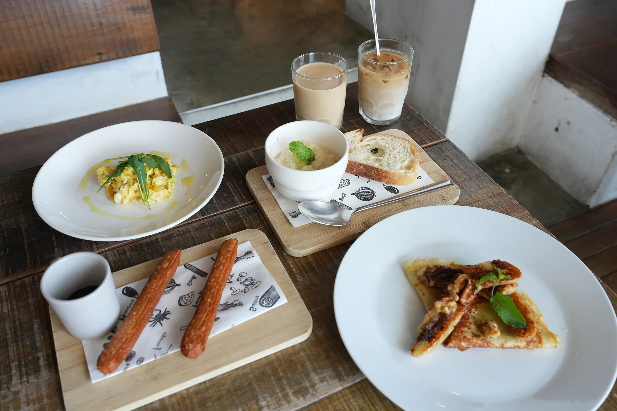 #第二天早餐:季節性果汁、玉米蛋捲、米布丁、焦糖香蕉煎餅、西班牙巧克力油條、拿鐵、奶茶。