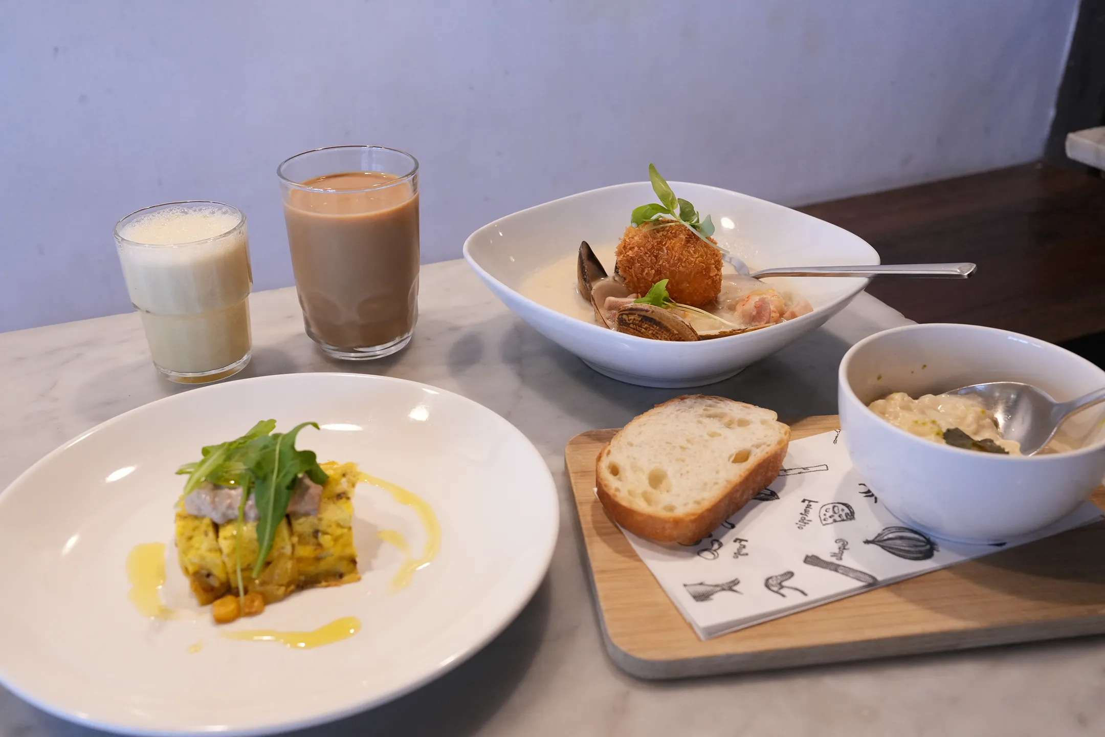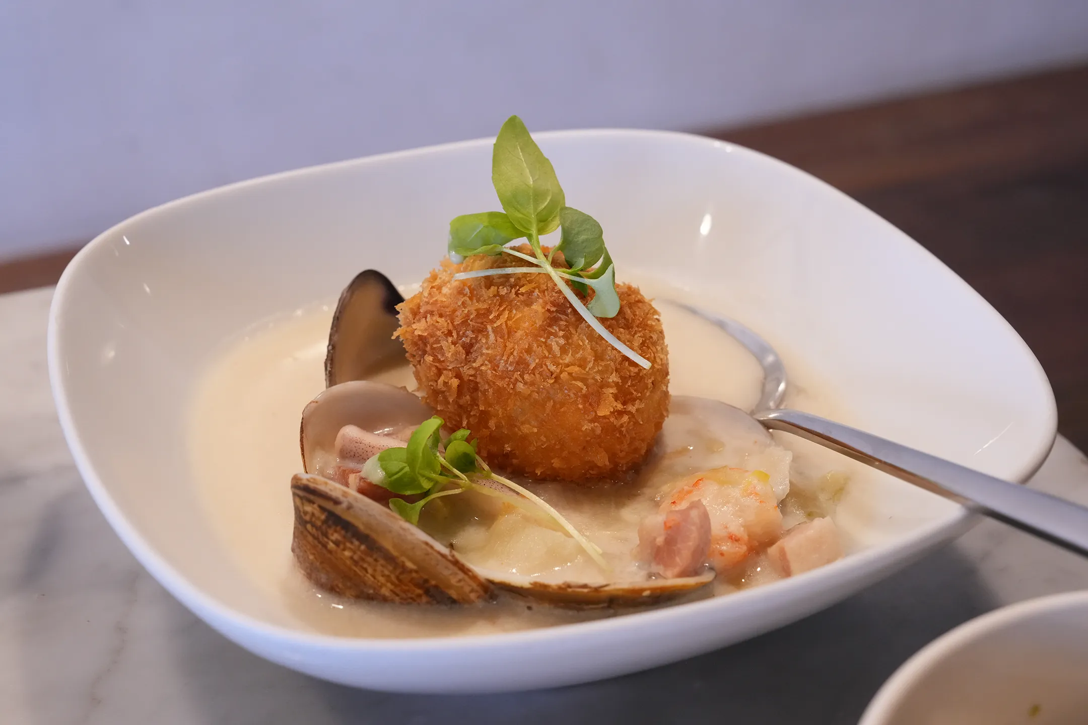 ▼主餐是「麵包炸彈巧達濃湯」,巧達濃湯奶香味十足,喝起來非常療癒,濃湯裡的海鮮給得很大方,料多實在。中間那顆看起來像炸物的其實是水煮蛋,建議一定要把蛋切開來沾著濃湯一起吃,就不會覺得蛋黃很乾,整體來說是相當美味又有飽足感的餐點。