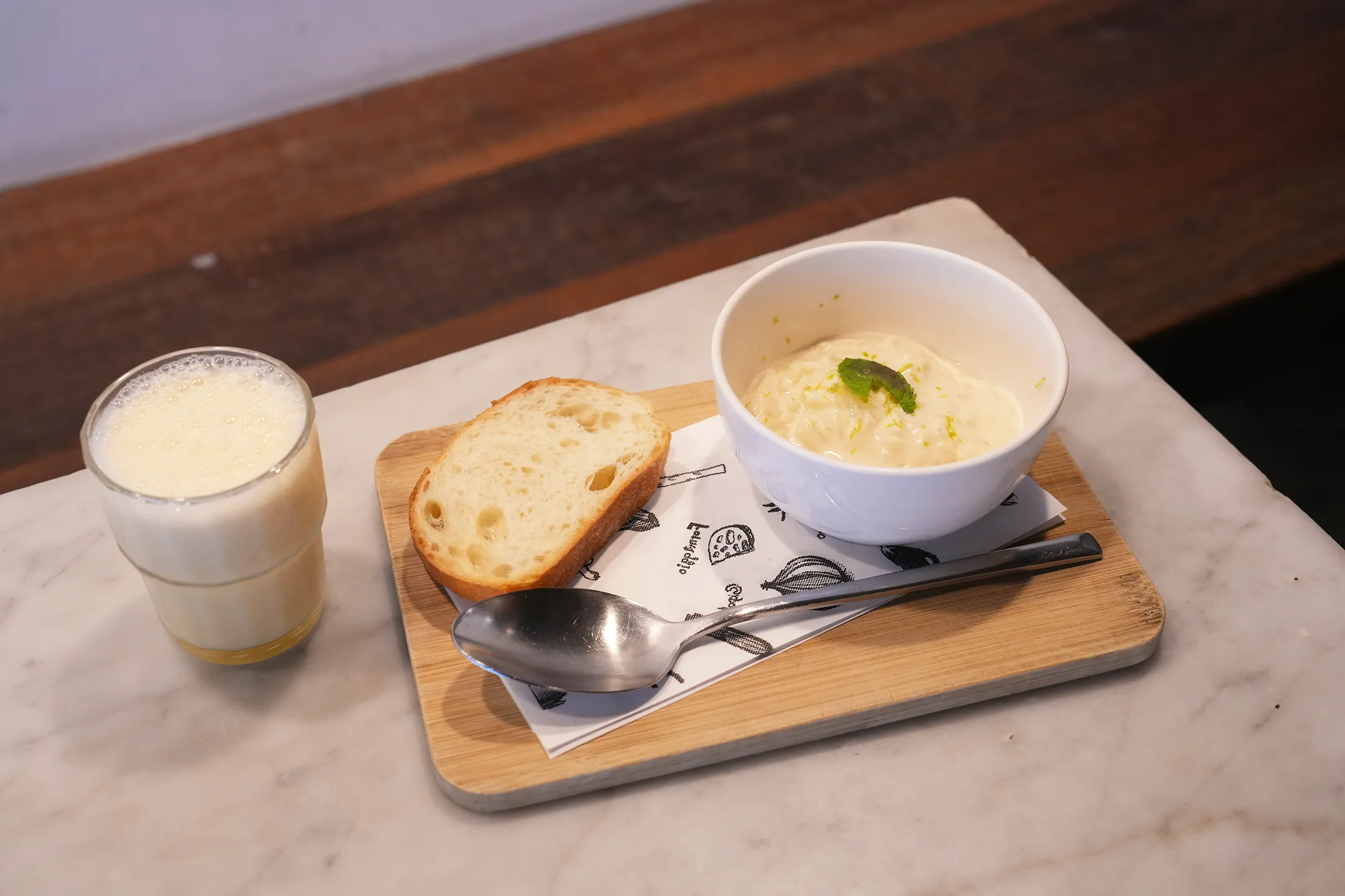 「米布丁」(右)跟我們想像的很不一樣,吃起來綿密滑順,米粒煮到軟爛入口即化,帶著濃濃的奶香和。口感介於布丁跟粥之間,但比粥更綿密、比布丁更有口感,上面撒上一些檸檬皮,為米布丁增添風味,跟麵包一起吃簡直絕配,早餐沒有胃口的人會喜歡的一道料理。