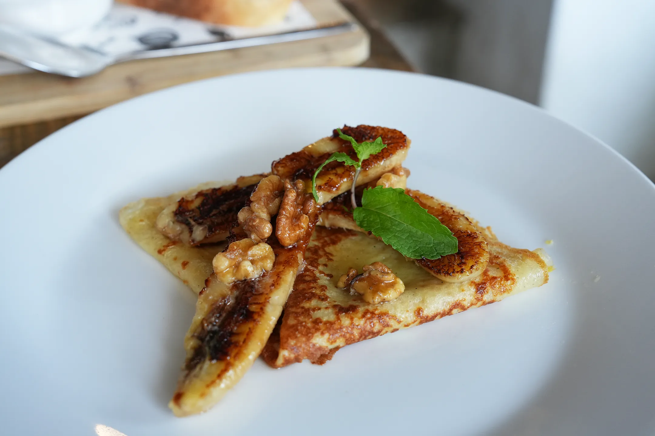 ▼第二天的早餐跟昨天就差在主餐不同,換成了「焦糖香蕉煎餅 堅果奶油」。
