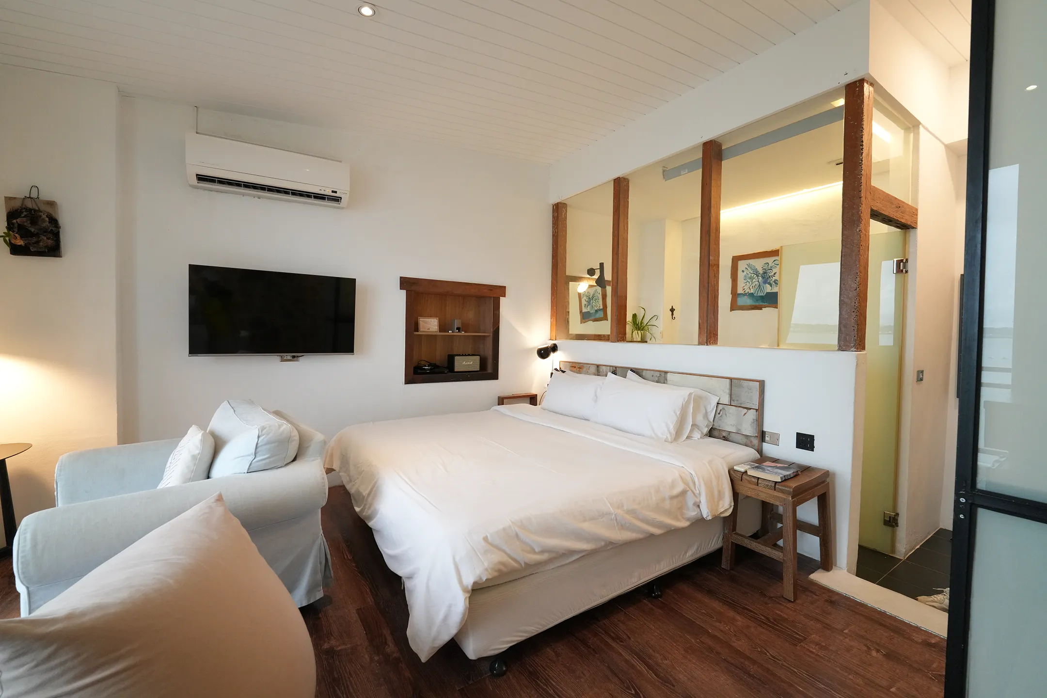 ▼我們這次預訂的是「海景豪華雙人房 附陽台」,房門採用傳統鑰匙門鎖。房間空間不算寬敞,營造出小巧溫馨的氛圍。室內設計走簡約風格,沒有過多繁複的裝飾,反而讓人感到放鬆自在。床鋪軟硬適中,躺起來相當舒適還有面海的單人沙發座以及懶骨頭。