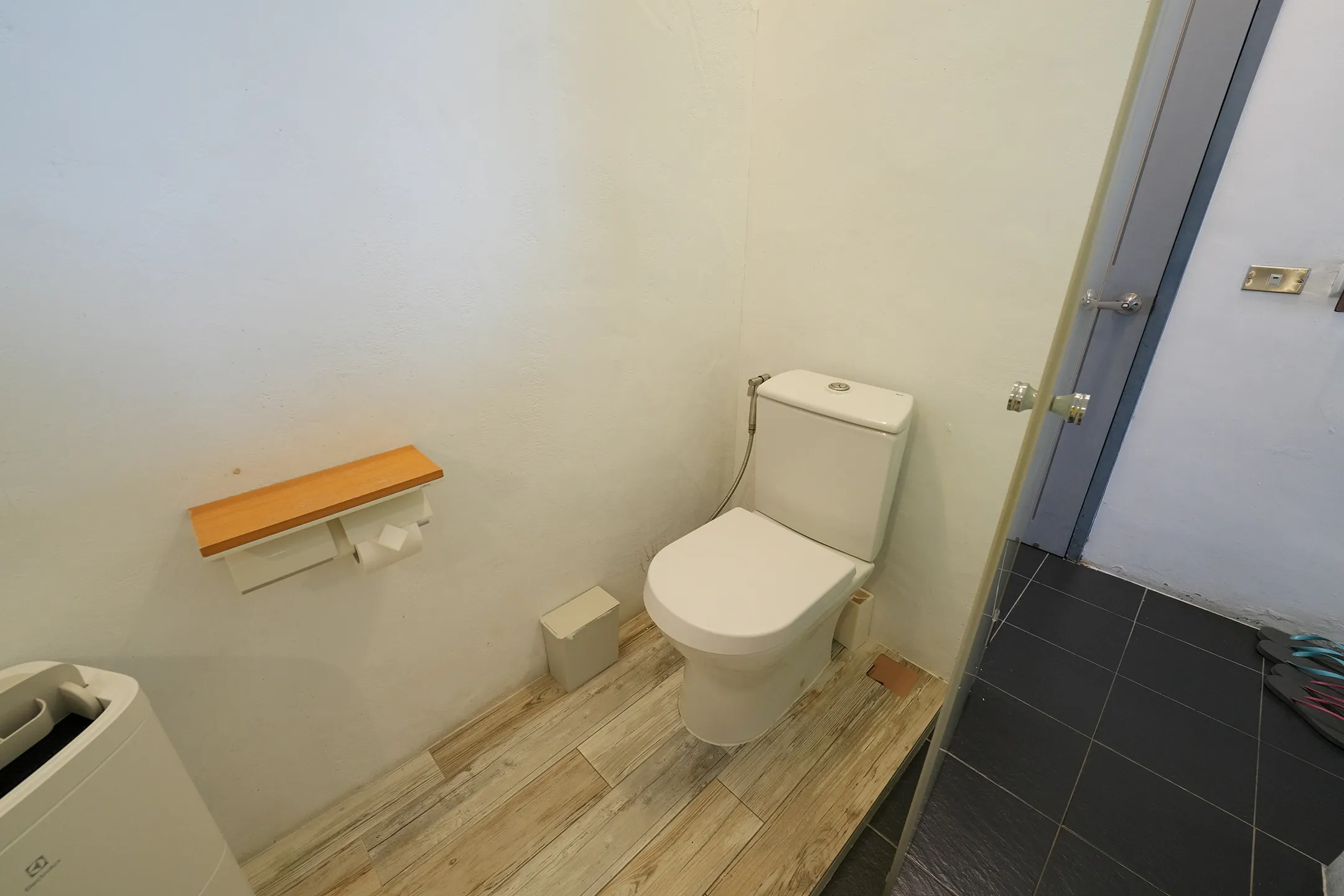 ▼浴室採用傳統座式馬桶,馬桶旁另外加裝了沖水器。
