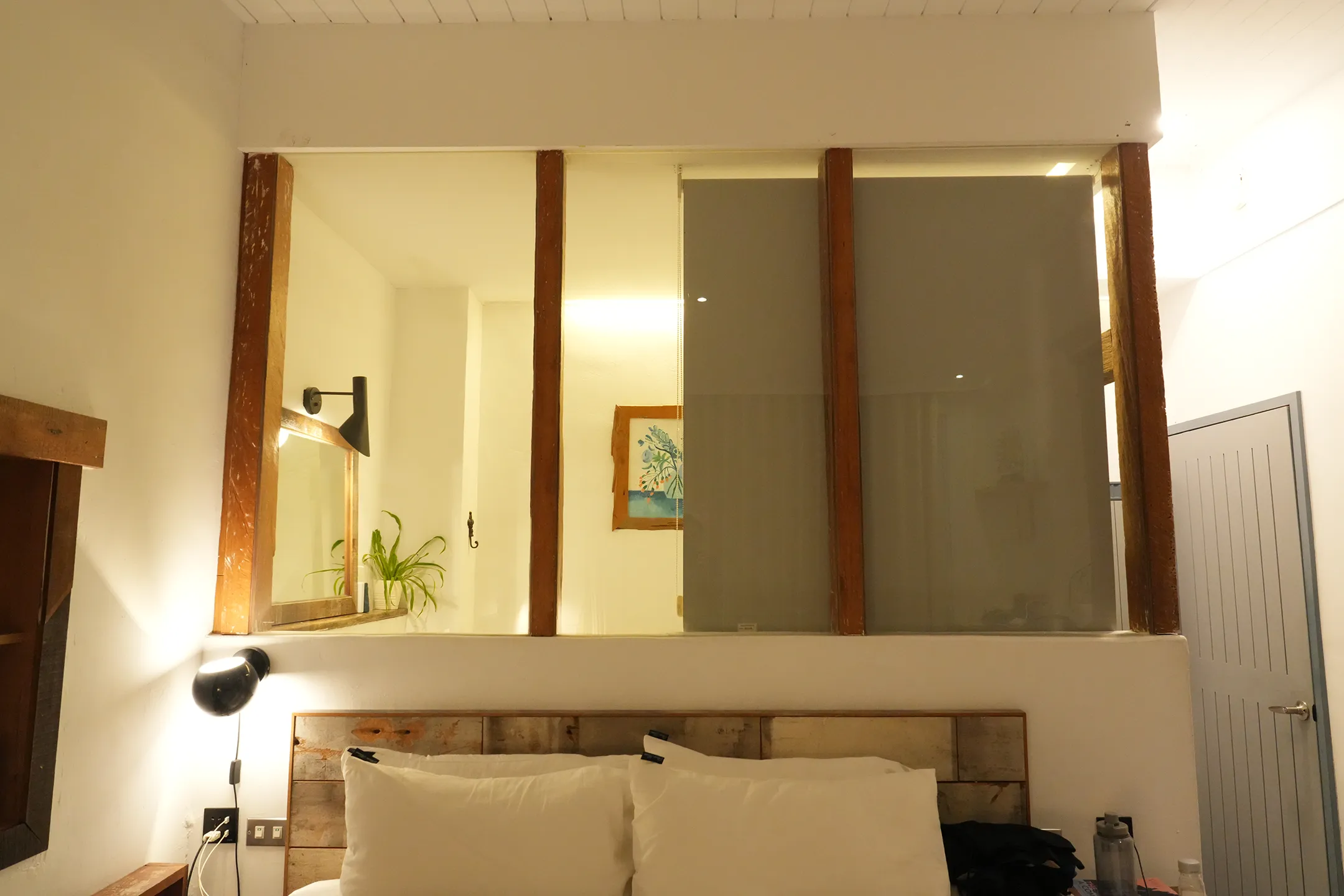 ▼廁所室的玻璃窗只能遮一半,這樣的配置對於與朋友或非伴侶同住的旅客而言,確實會造成使用上的尷尬與不便,隱私性略顯不足。
