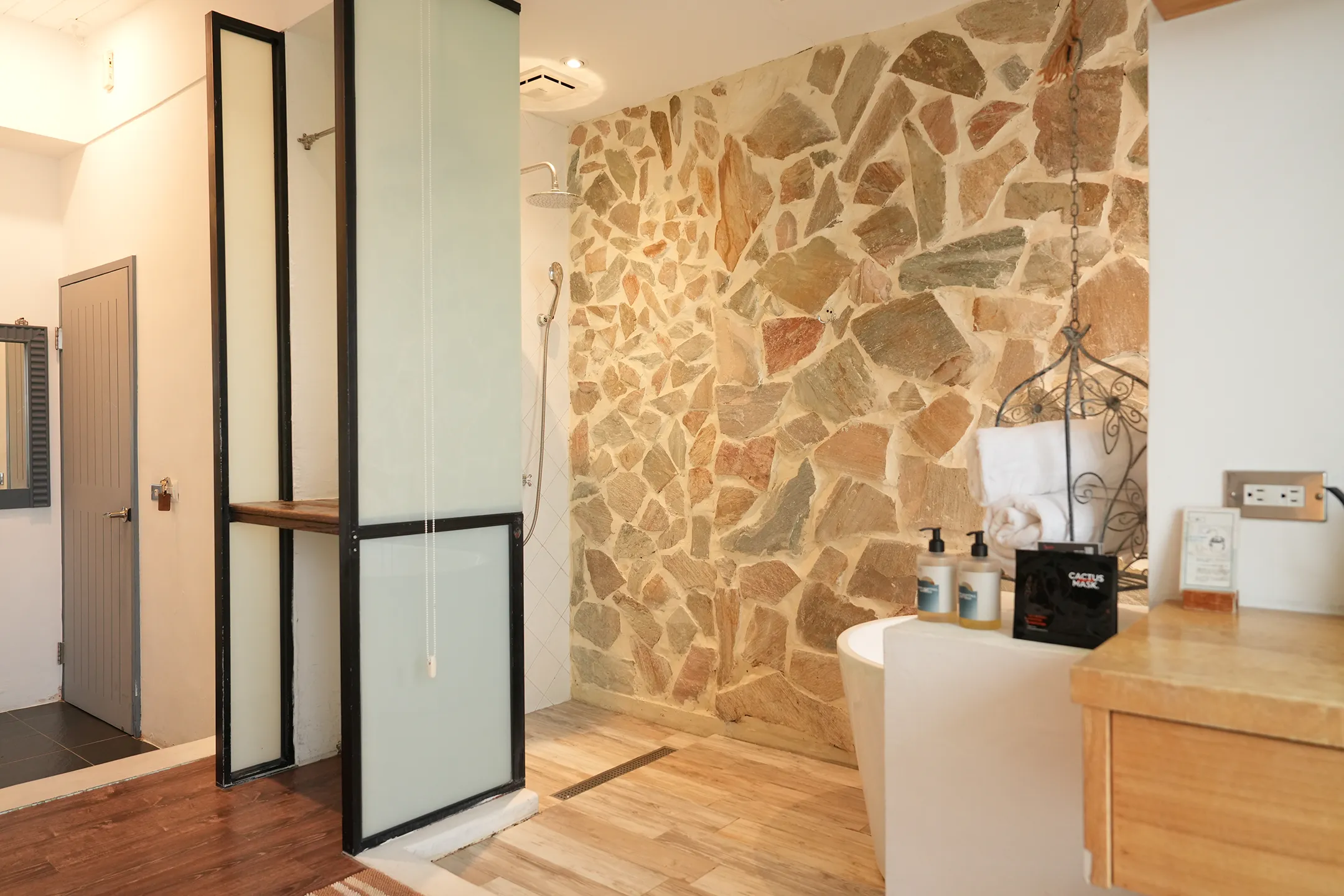 ▼淋浴區位置不太顯眼,以至於我們入住時還花了些時間才找到。實際盥洗時發現,可使用的站立區域相當受限,需要謹慎控制動作幅度,否則容易讓水濺出淋浴範圍。對於體型較高大的住客來說,使用上可能會更加不便。