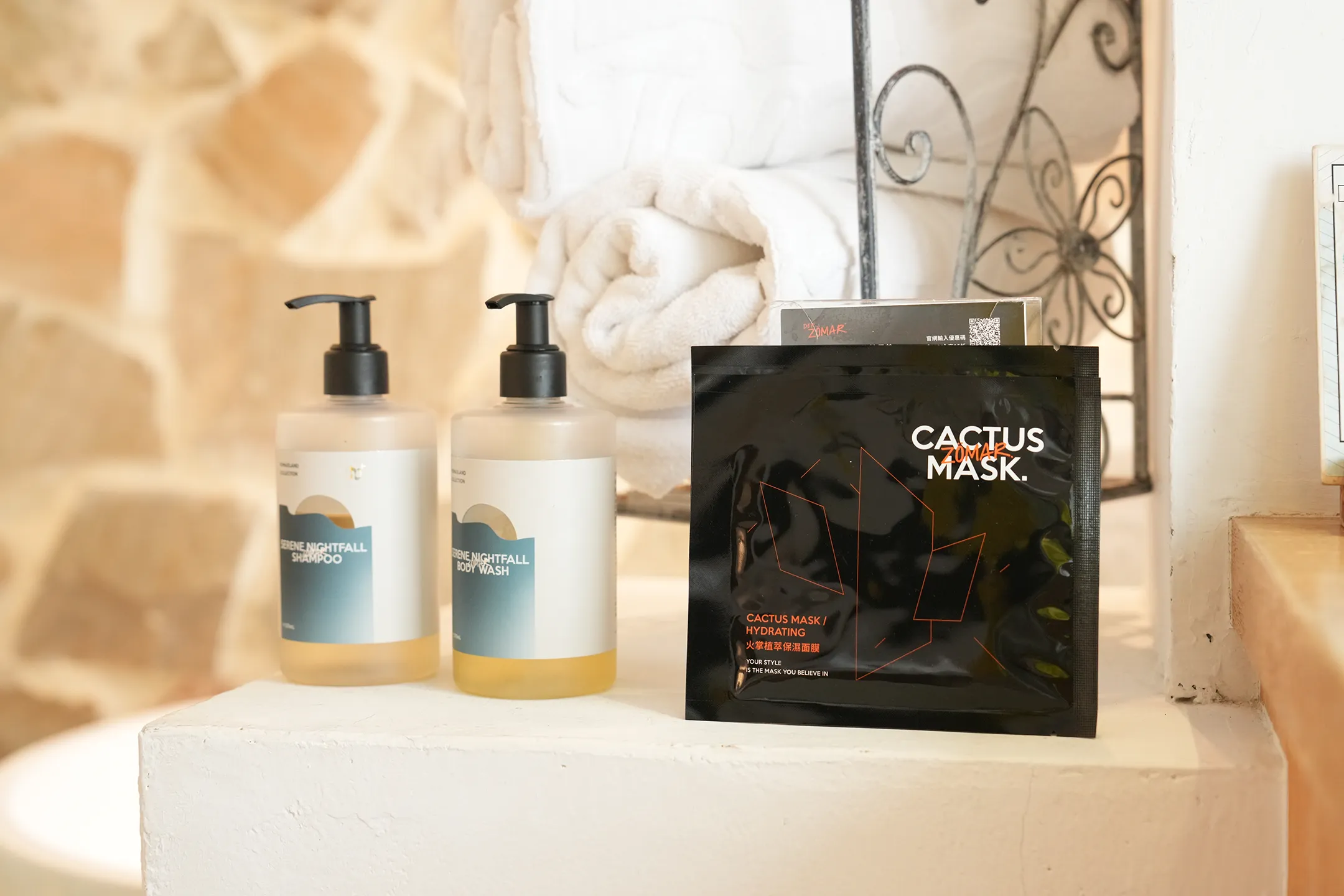 ▼旅館有提供洗髮精、沐浴乳,如果有潤髮或護髮需求的人,建議自己準備;除了基本的梳洗用品,還有提供面膜可以敷,真的相當貼心。