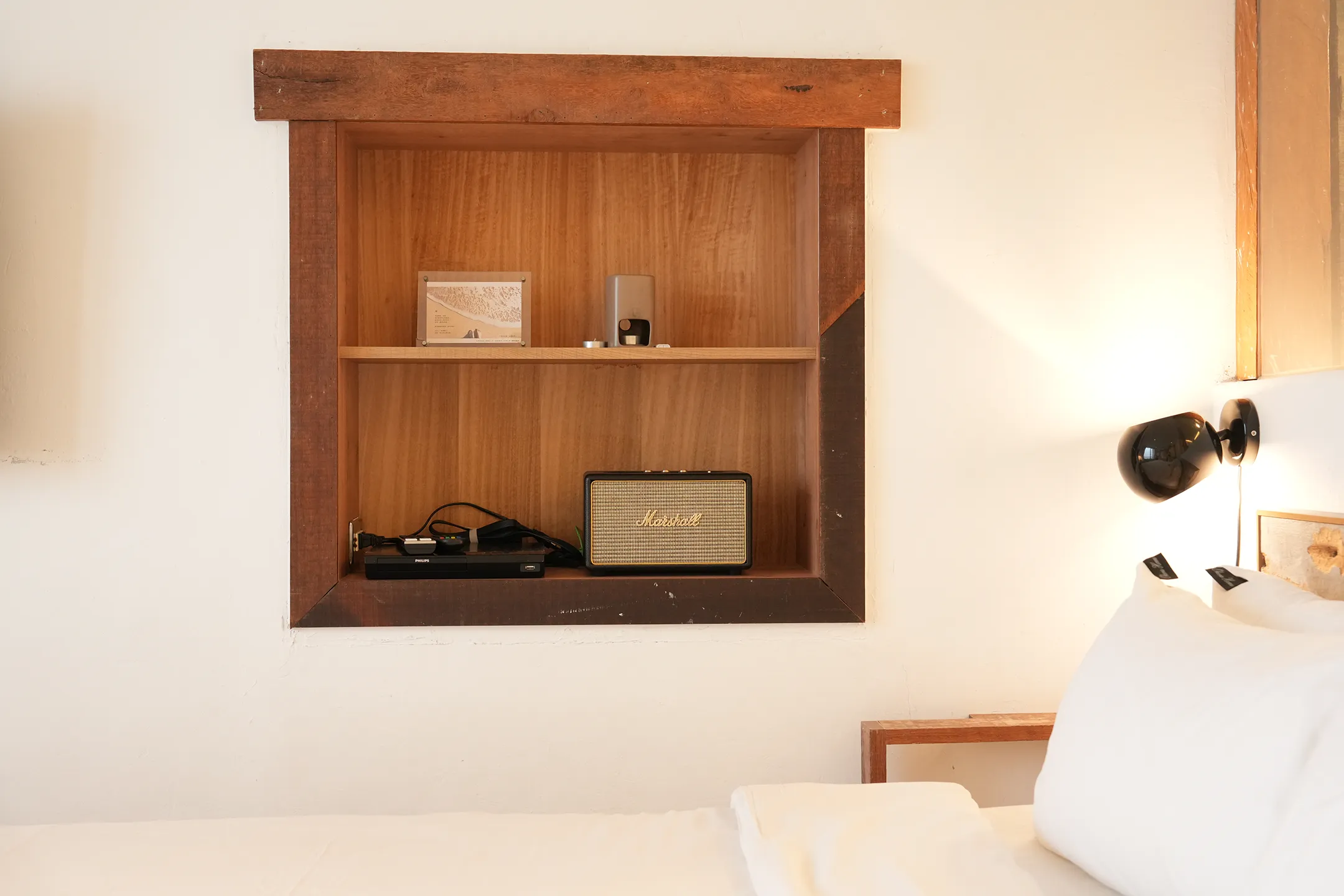 ▼床旁邊的櫃子上放有香氛蠟燭、藍芽音響、DVD播放機。
