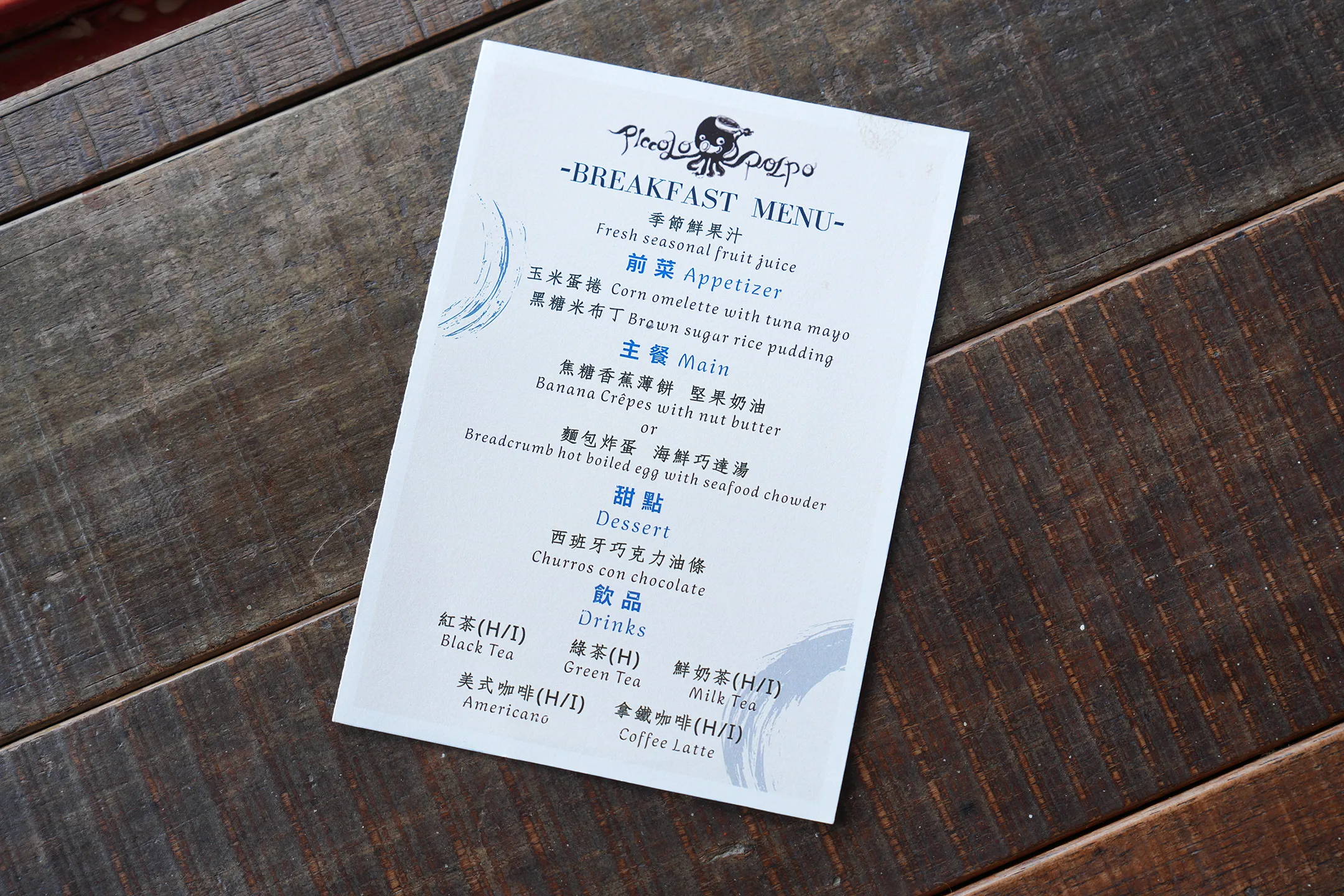 ▼「迷路小章魚小旅社」提供的早餐菜單,也是廣獲旅客好評的早餐,因為我們連住兩晚,所以會有兩天早餐。
