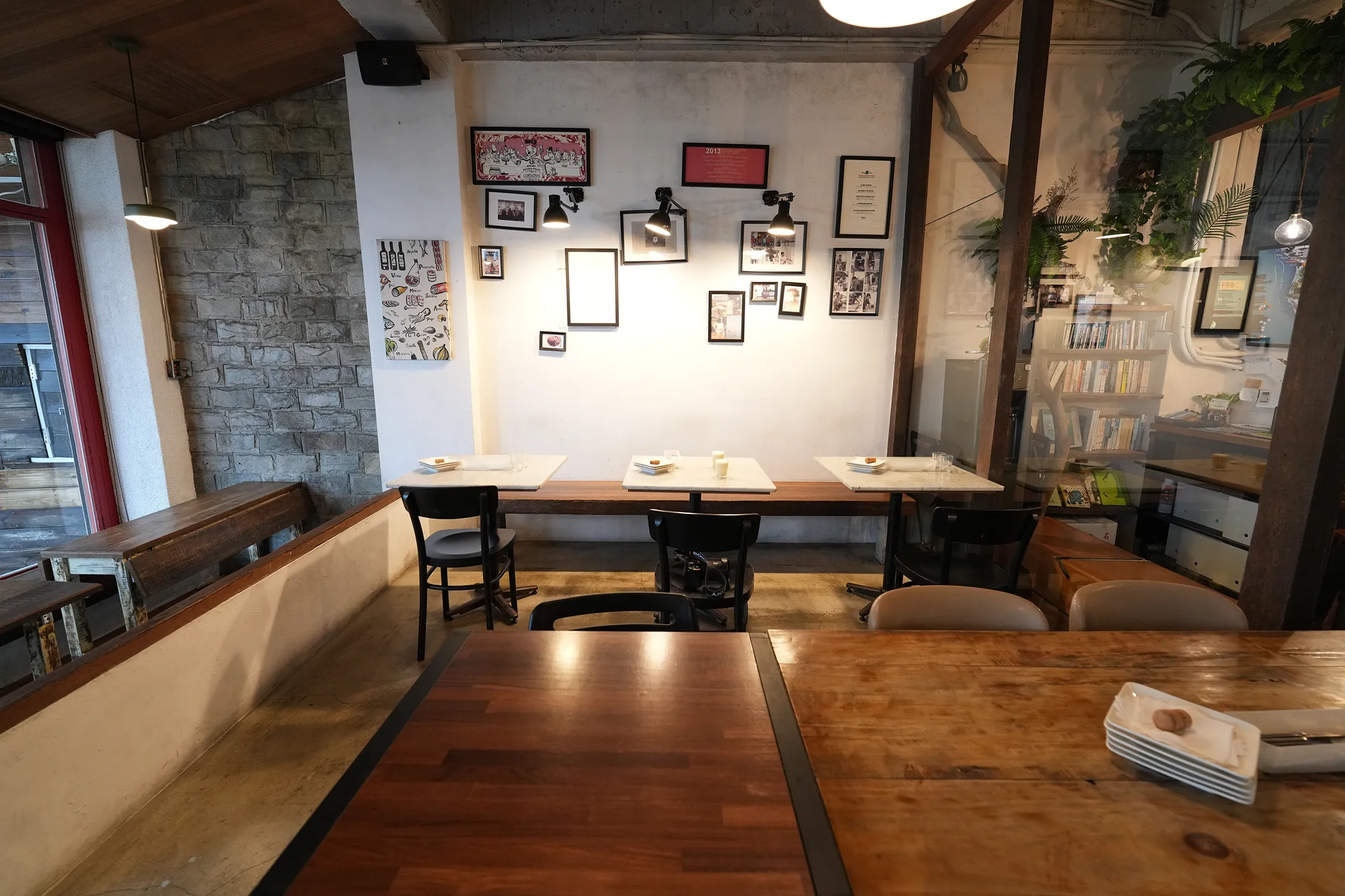 ▼進入餐酒館後,會看到透明玻璃隔出一個獨立空間,就是旅館的接待櫃台。櫃台以大片透明玻璃作為隔間,從這裡可以清楚望見餐酒館的空間。