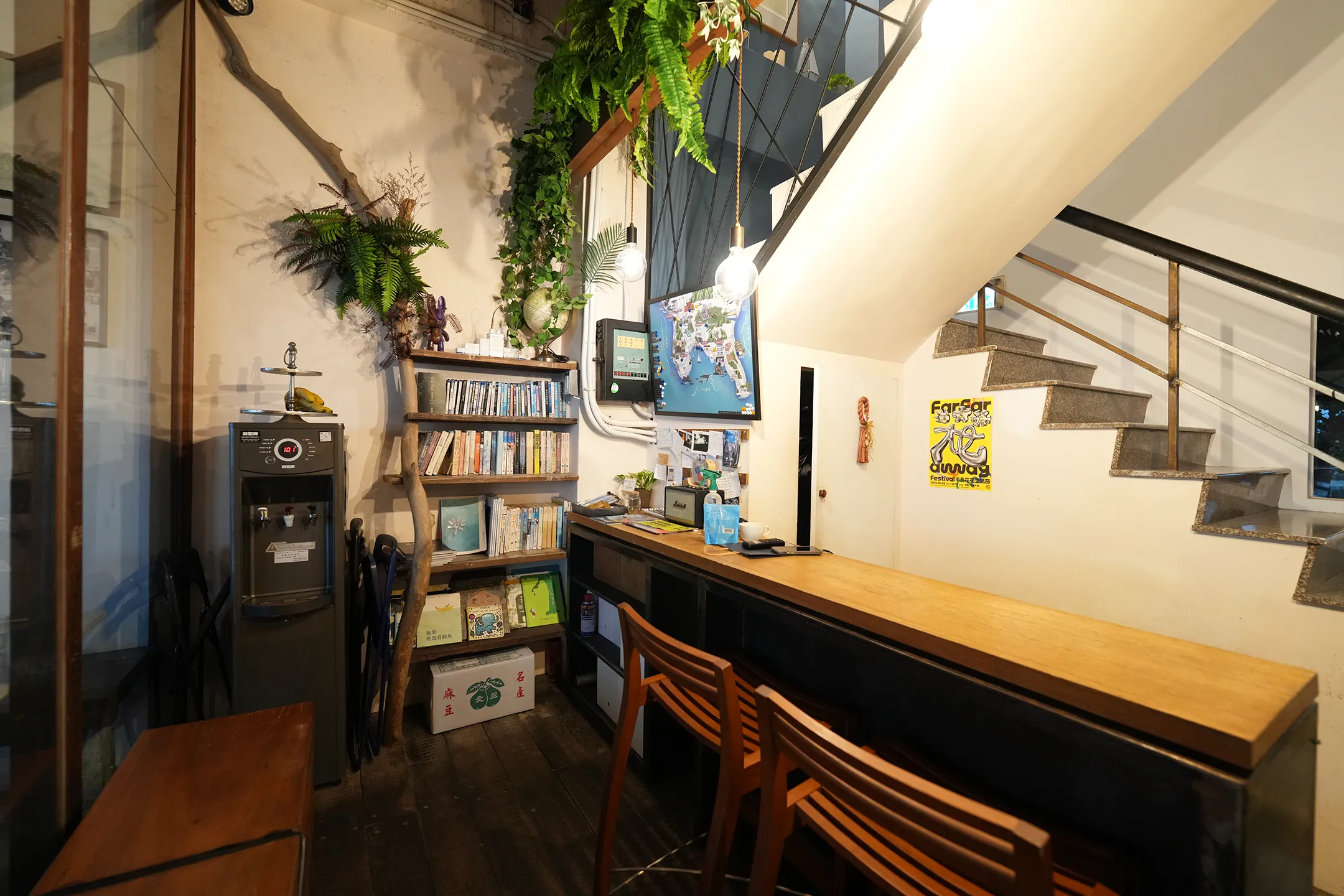 ▼接待櫃檯旁邊陳列著精選的書籍與DVD,歡迎客人自由借閱,可以帶回房間看,書櫃旁邊的飲水機也可以自由取用,櫃台後面的階梯往上走就是客房。另外,因應環保政策,民宿不主動提供一次性的牙刷、牙膏等盥洗用品。如有需要的旅客,可以在樂捐箱隨喜投入金額後,向櫃檯索取。