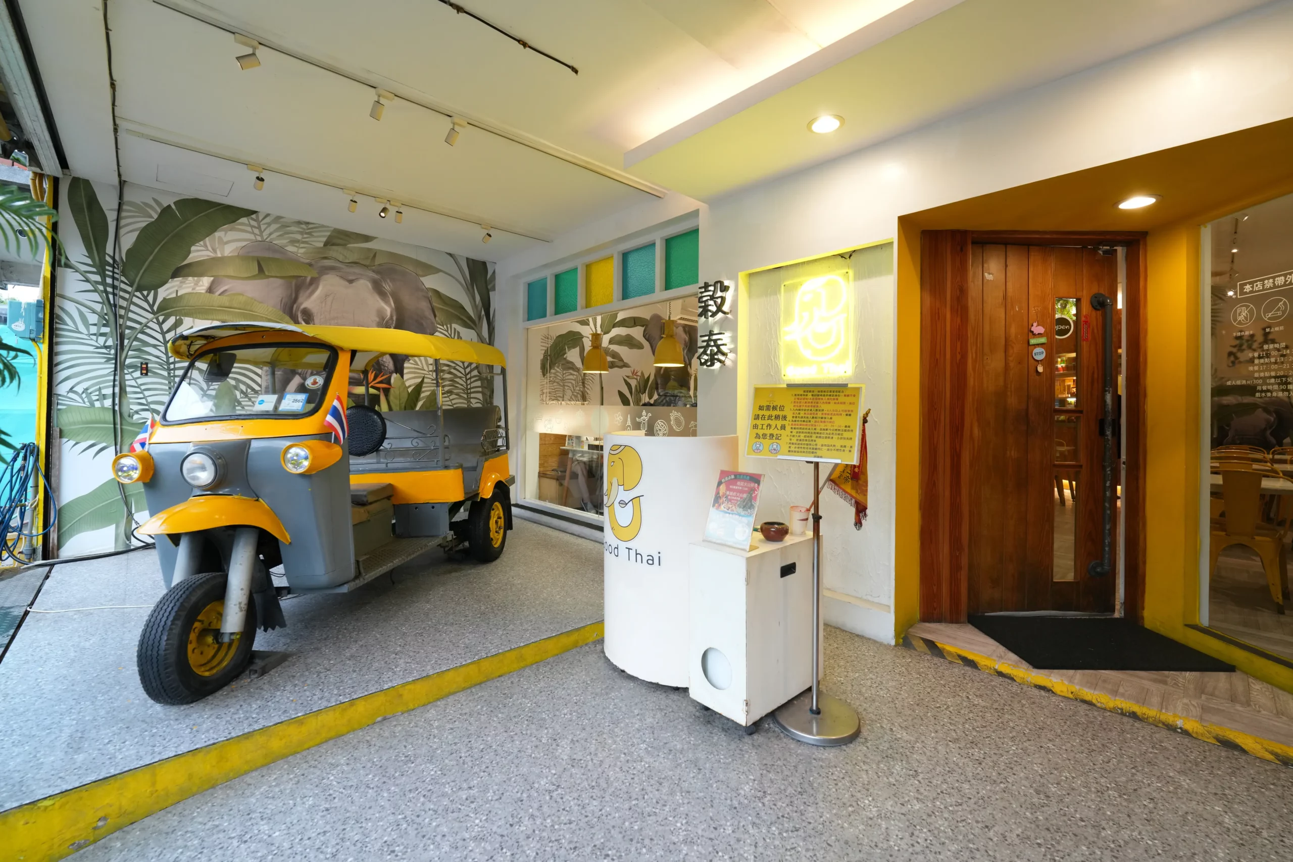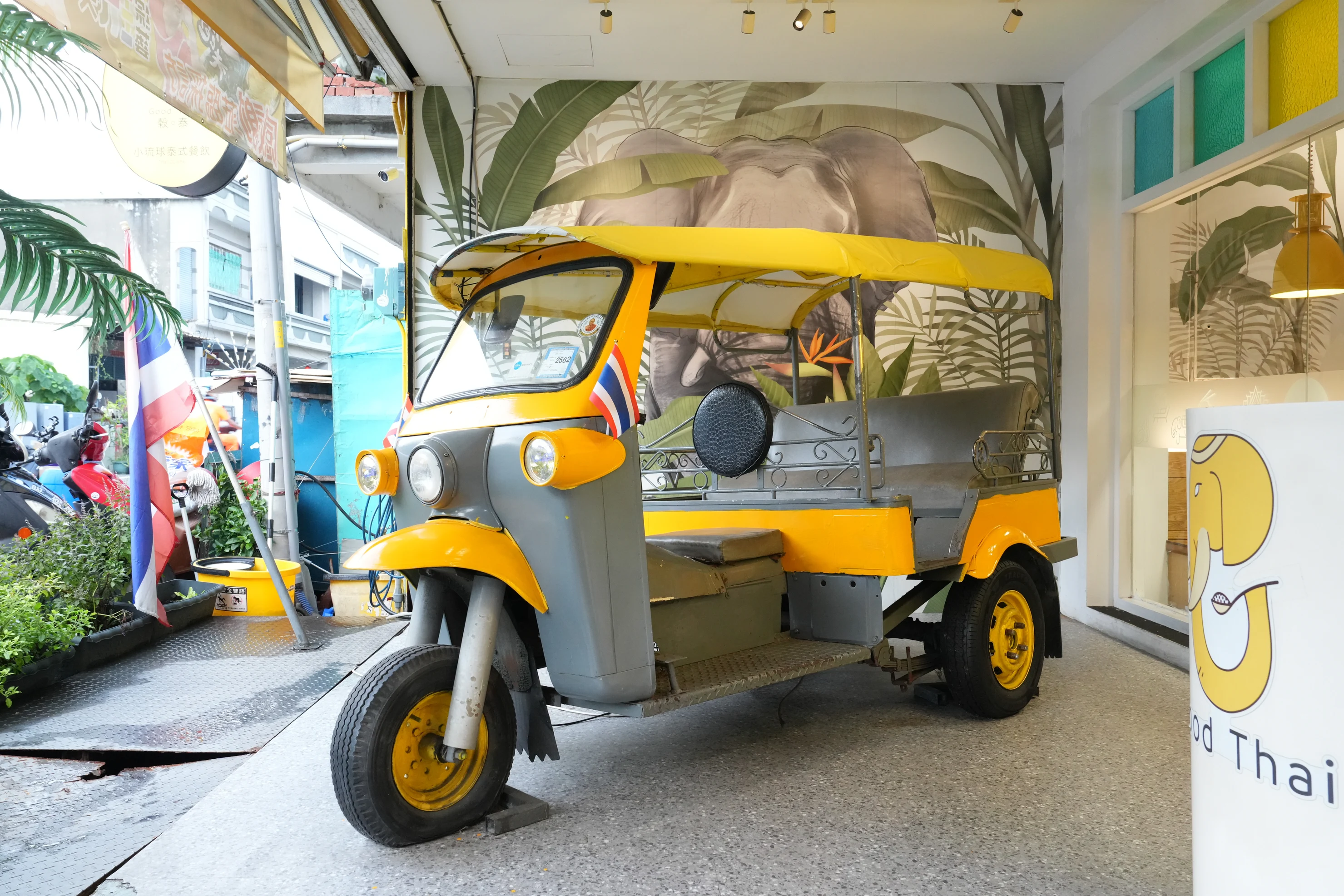 ▼走到餐廳門口,可以發現「穀泰」從餐廳外就瀰漫著濃濃的泰式氛圍,其中最吸引人注意的,莫過於門口這輛可愛的嘟嘟車,據說是老闆特地從泰國運回台灣的擺設,如今成了許多遊客到此用餐必拍的打卡景點,簡單拍照留念後,店員便會前來帶領我們入座。