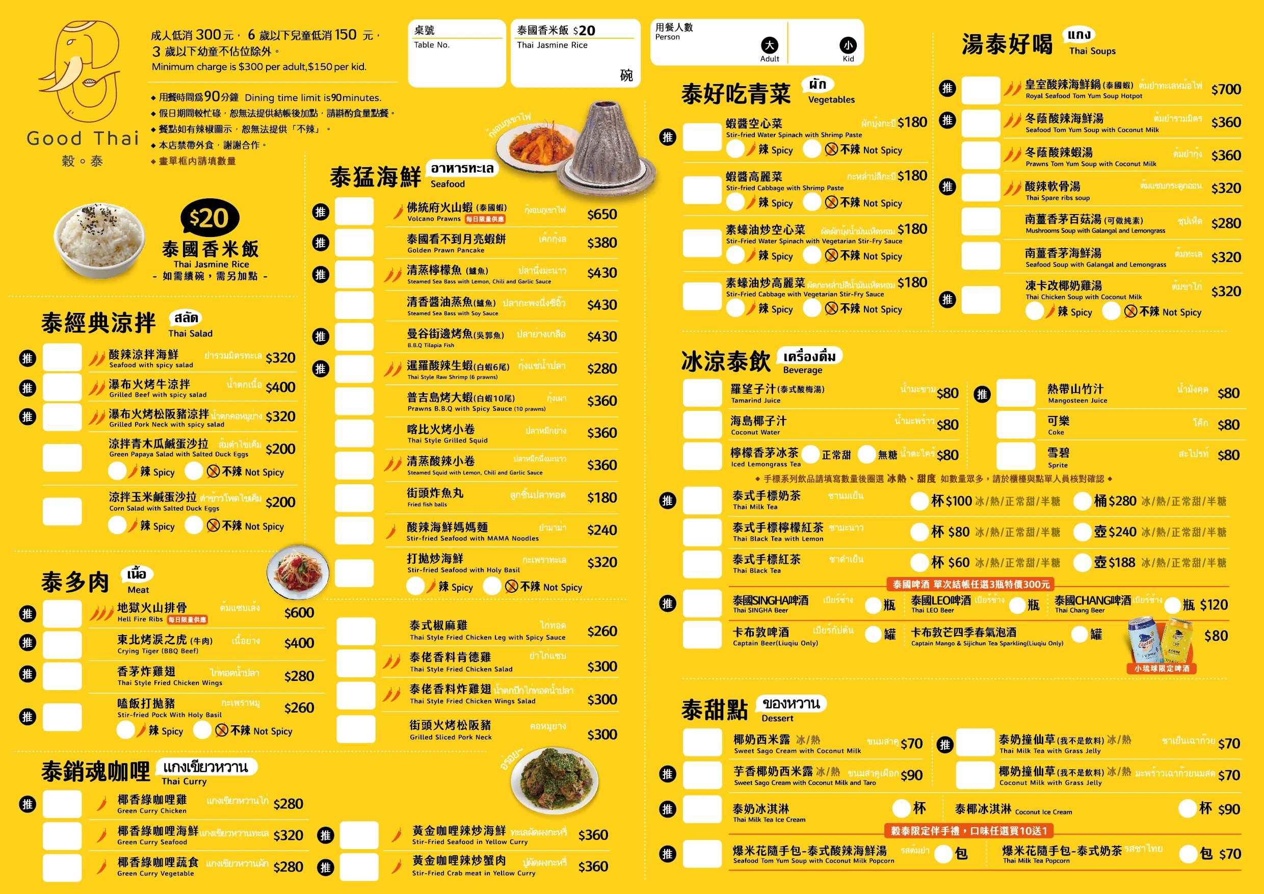 ▼以下為「穀泰」的菜單,除了必點的清蒸檸檬魚、地獄火山排骨外,還有椰香綠咖哩雞、香茅炸雞翅等餐點可以選擇,其他用餐規則也一併整理如下: