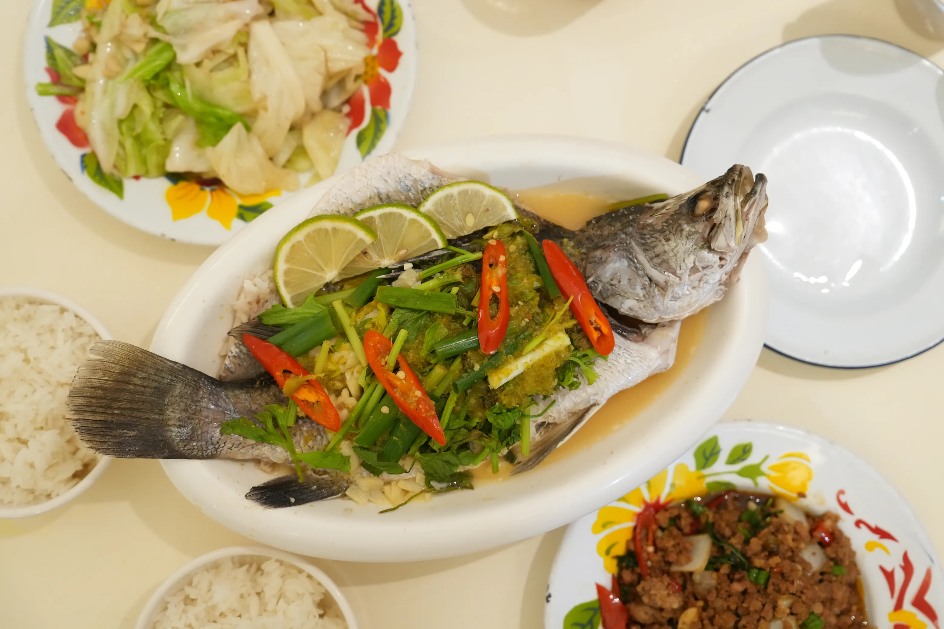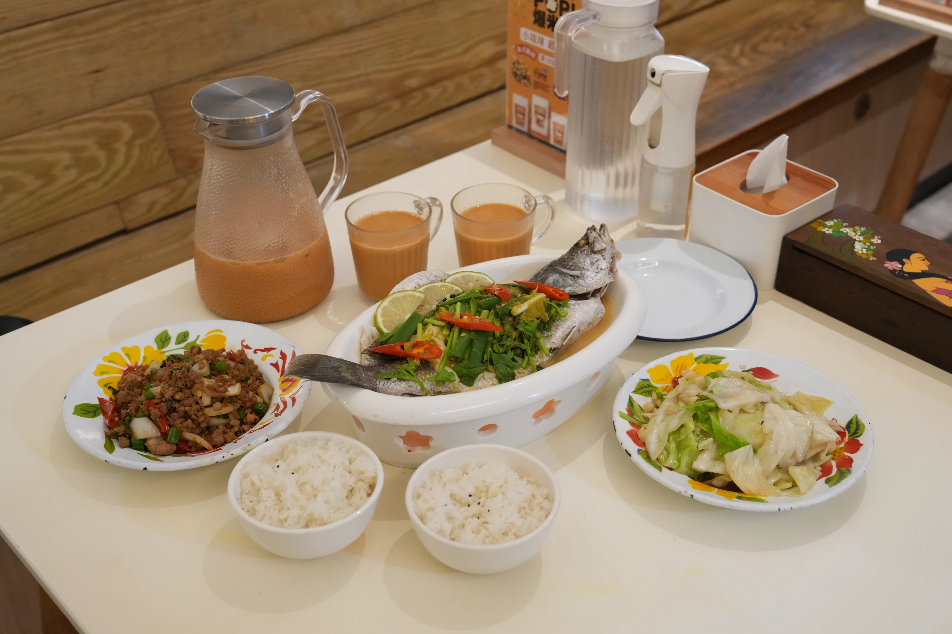 ▼這次我們簡單點了清蒸檸檬魚、嗑飯打拋豬、蝦醬高麗菜,兩碗泰國香米飯和泰式手標奶茶。