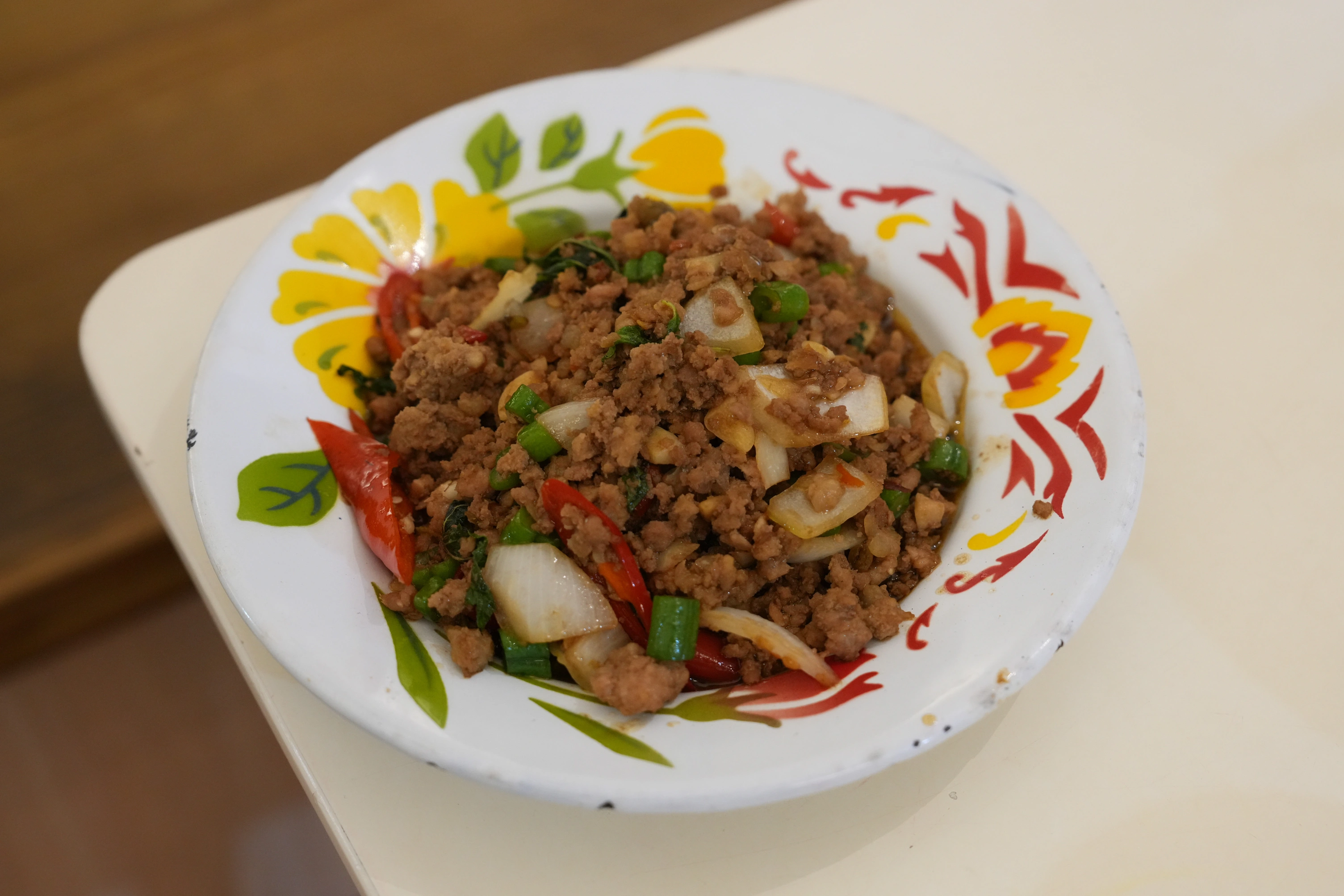 ▼嗑飯打拋豬雖然在菜單上標註了一根辣椒的辣度,但實際吃起來完全不辣,入口帶有濃郁的鍋香氣,隱約還帶著一抹特殊的香味,整體鹹度偏高、十分下飯,非常適合搭配著泰國香米飯一起享用。