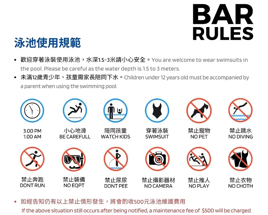 ▶ 如嘔吐於泳池,酌收換水費 $10000元。