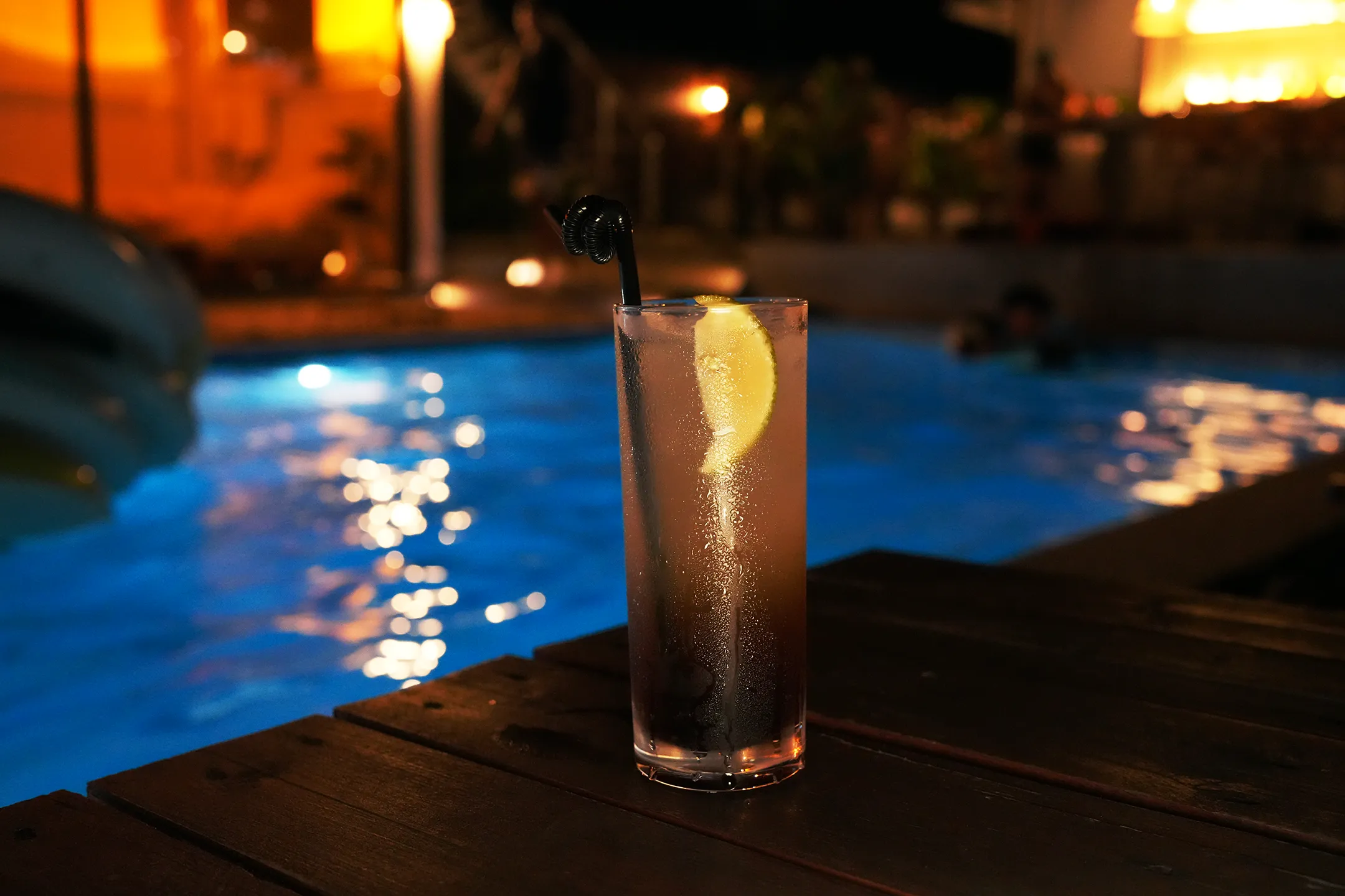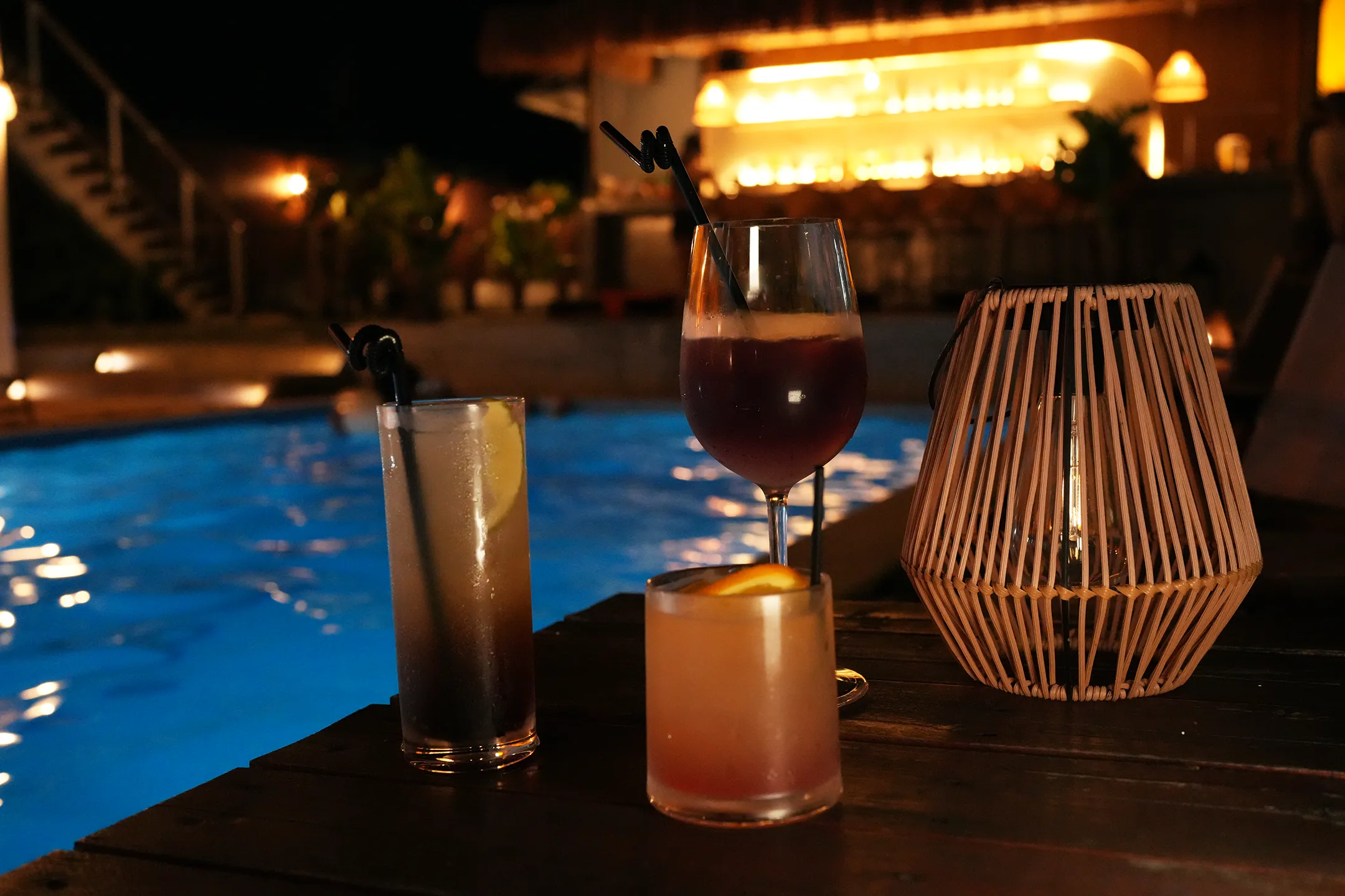 ▼既然來到酒吧,當然要好好享受一下!我跟朋友們各自依照喜好點了一杯,三杯調酒在泳池畔的桌上,背景映照著泳池的水光與遠處吧台透出的燈光,光是這個畫面就已經值回票價了,照片拍起來非常的有意境。