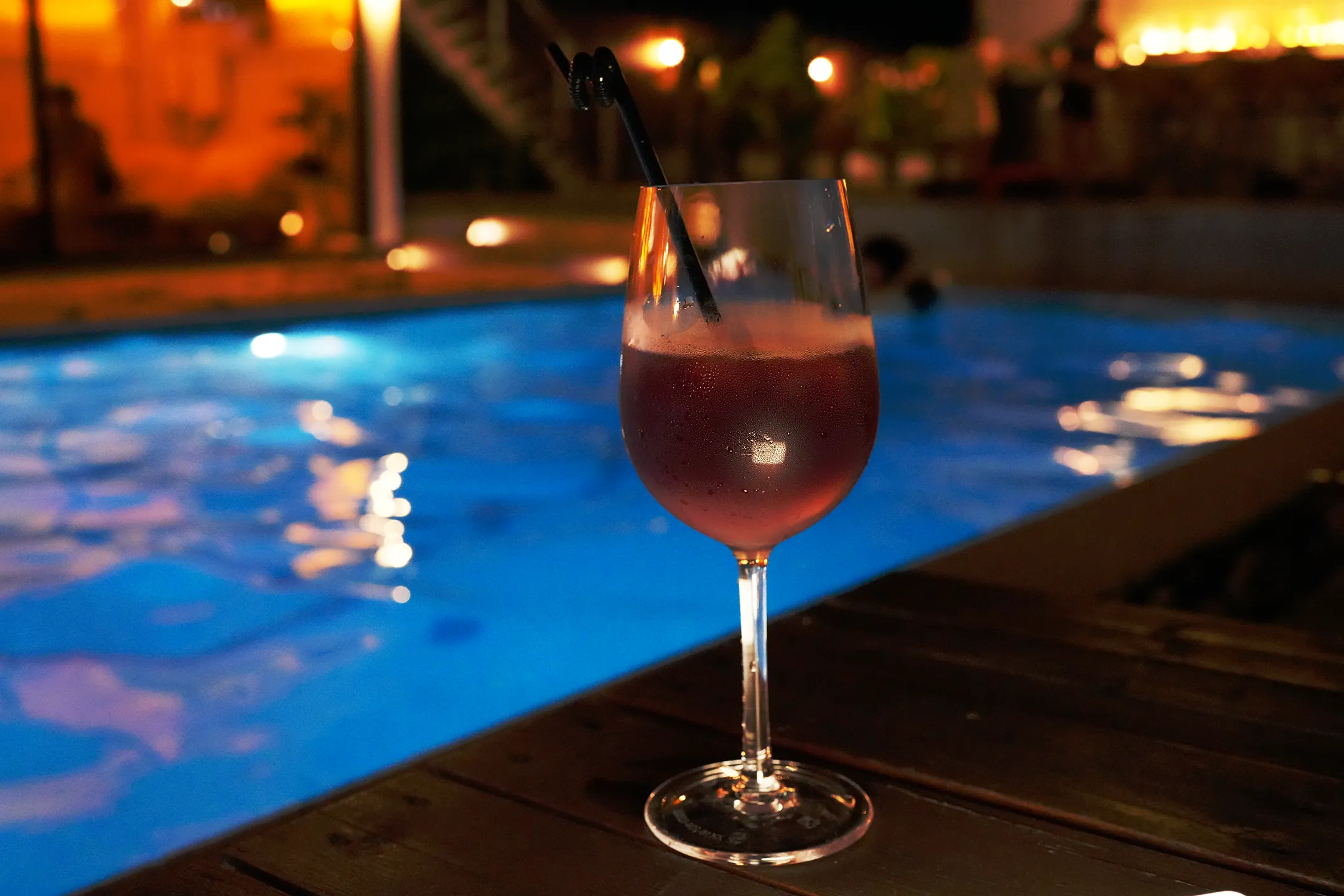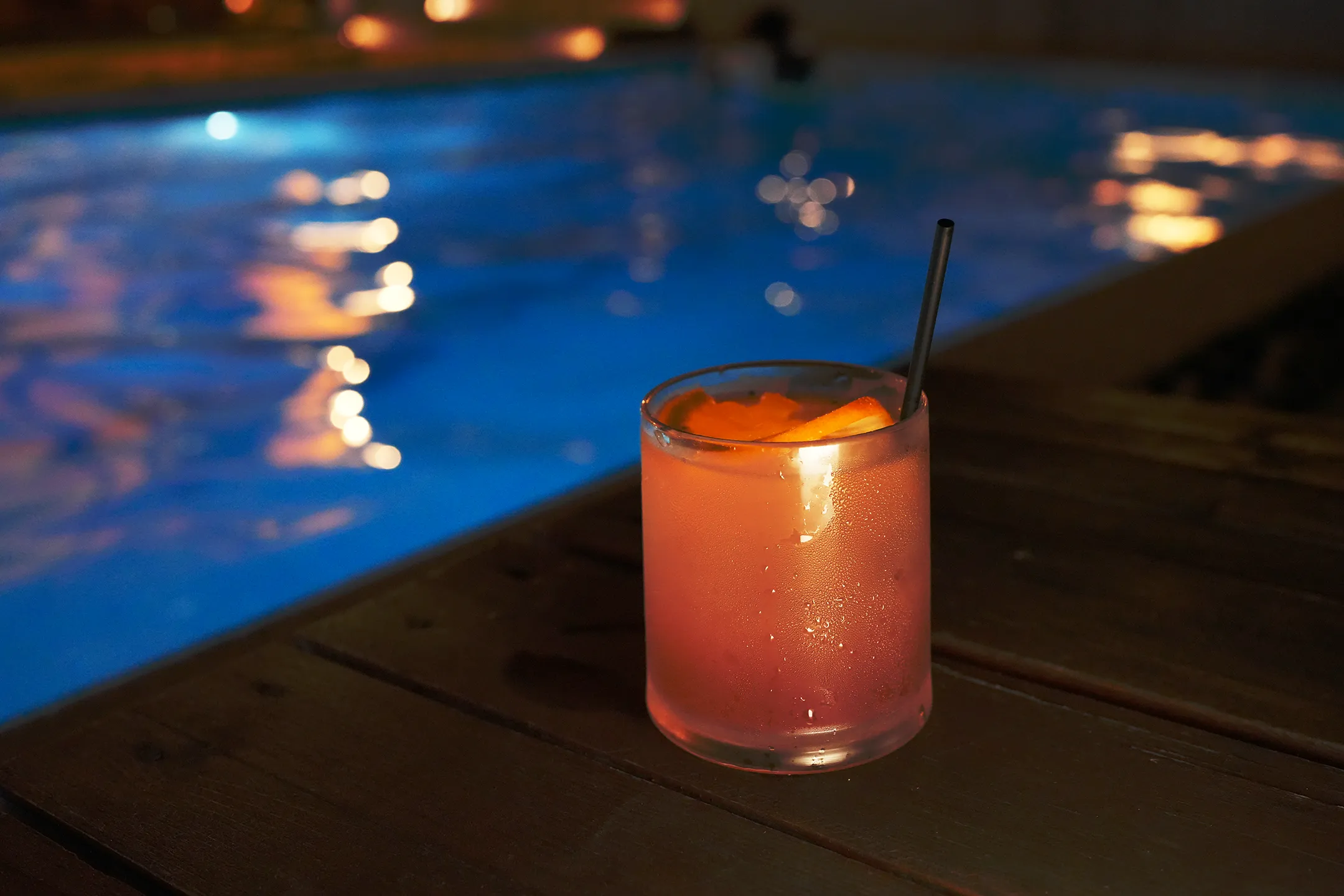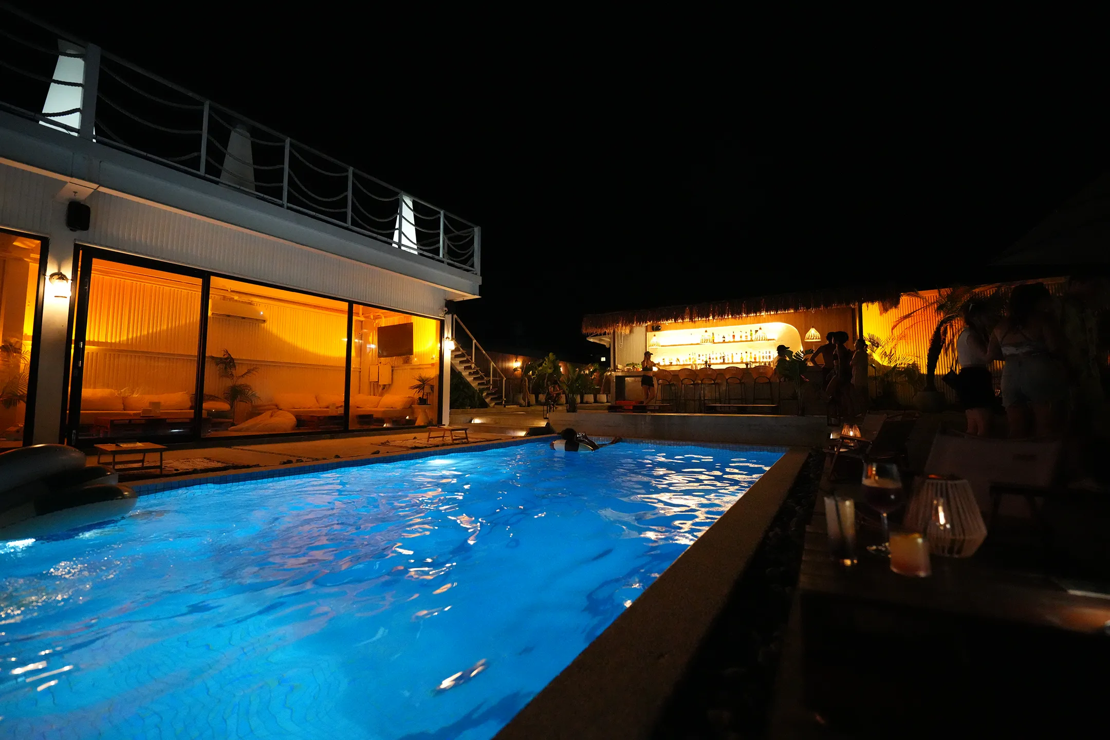 ▼入夜後,酒吧的氛圍瞬間蛻變,泳池在水下燈光的映照下散發出湛藍色的光芒,與四周黃色的燈光相互輝映,形成冷暖對比,波光粼粼的水面倒映著周圍的光影,畫面浪漫得像極了電影場景。