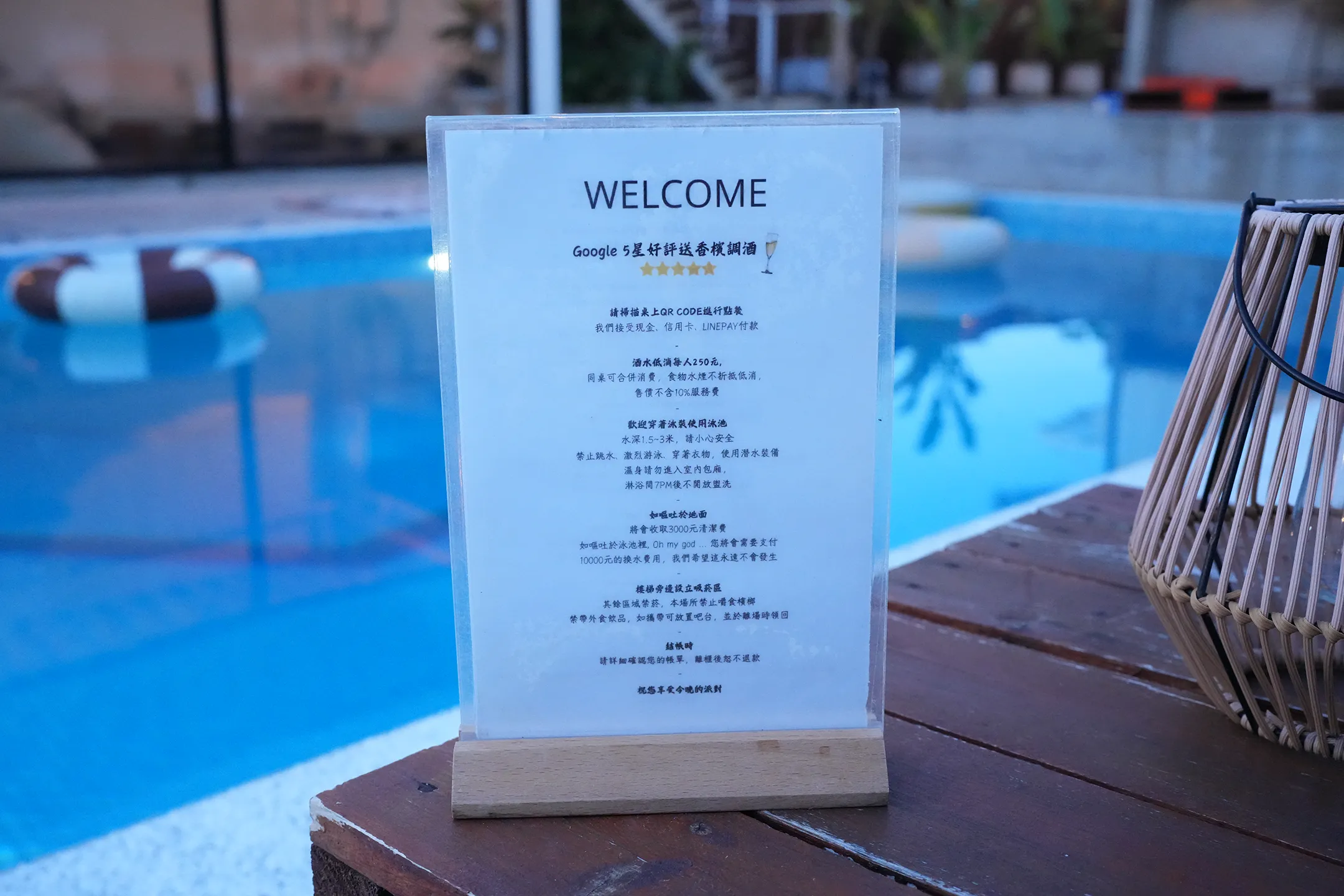 ▼我們挑選的是泳池畔區的座位,桌上會有一張注意事項的告示牌,建議詳細閱讀店家規範。