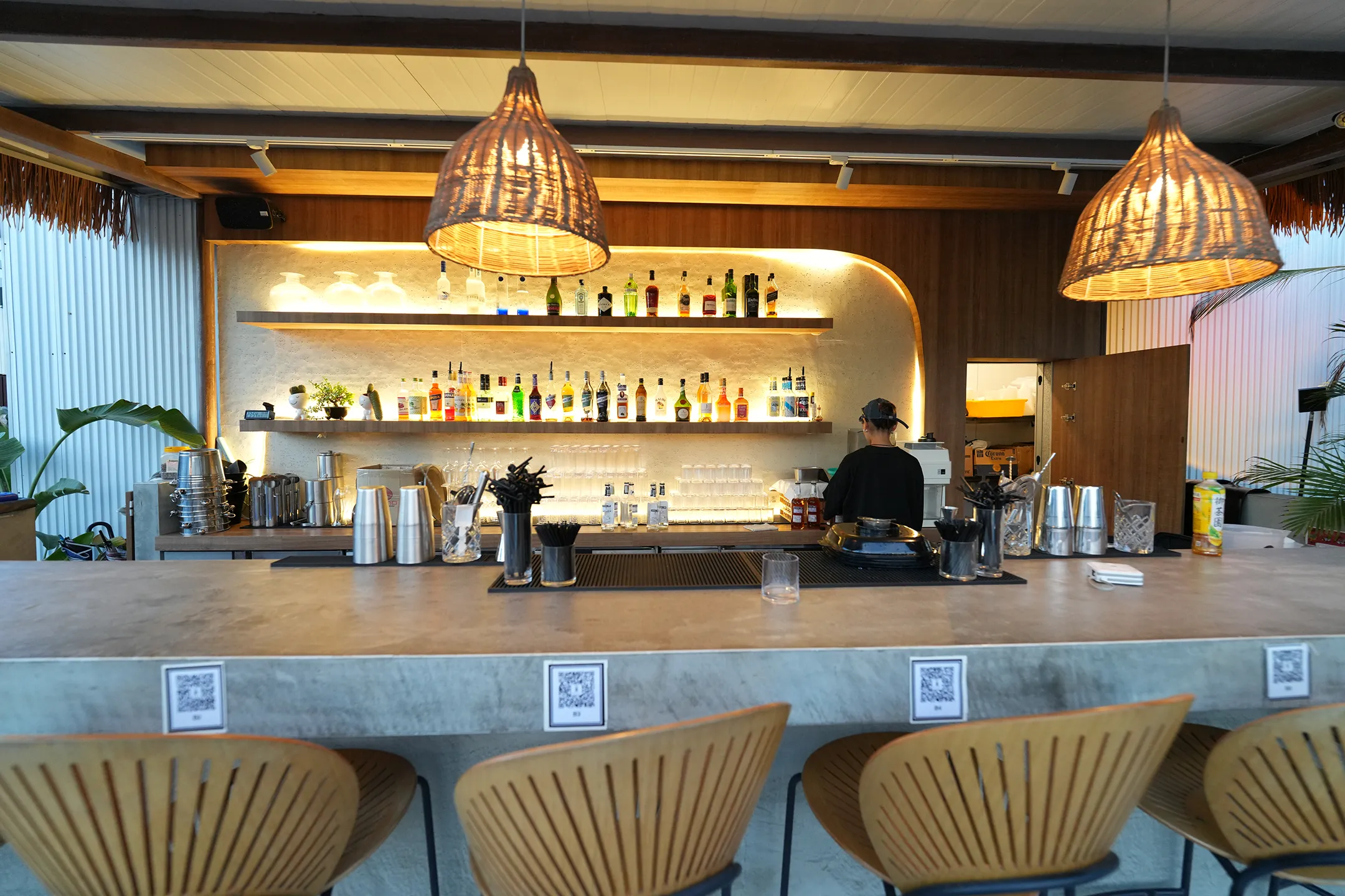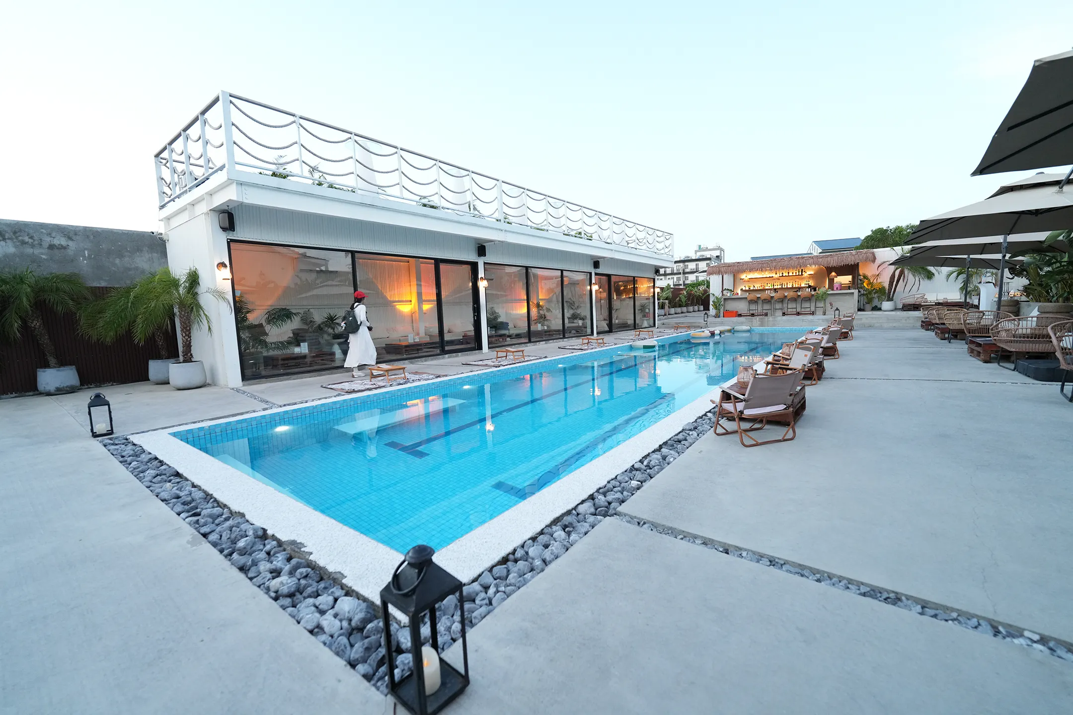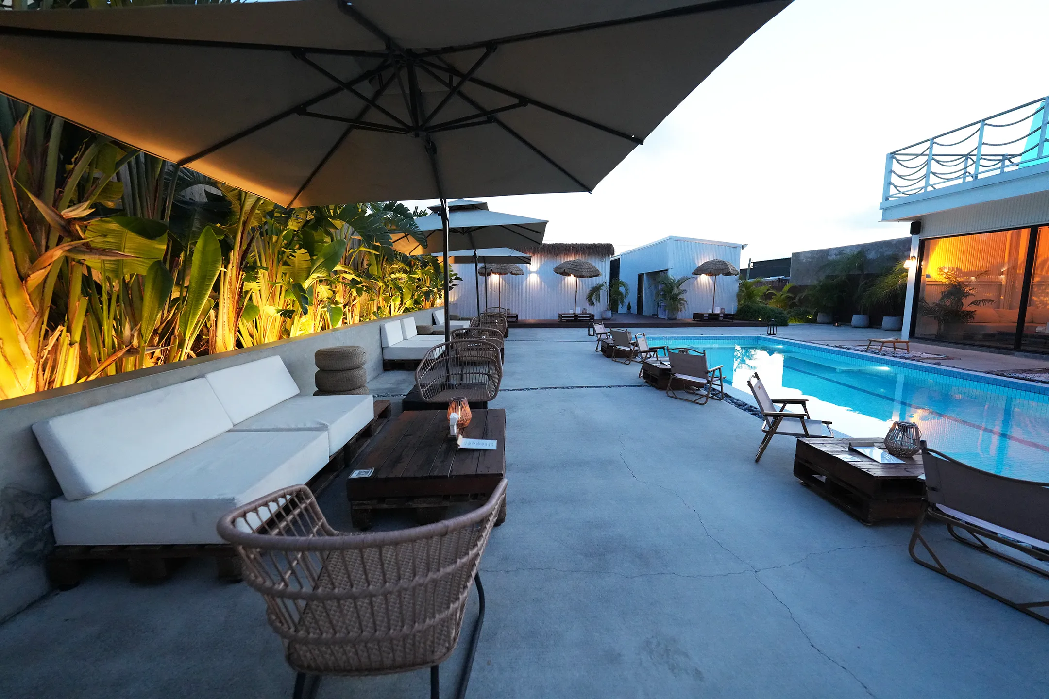 左側是落地玻璃窗的白色建築,室內透出溫暖的橙黃燈光,二樓還有造型獨特的波浪形白色欄杆,走到底就是茅草屋頂的戶外吧台區,右側的座位區是藤編椅以及大傘,整體氛圍慵懶又有放鬆。