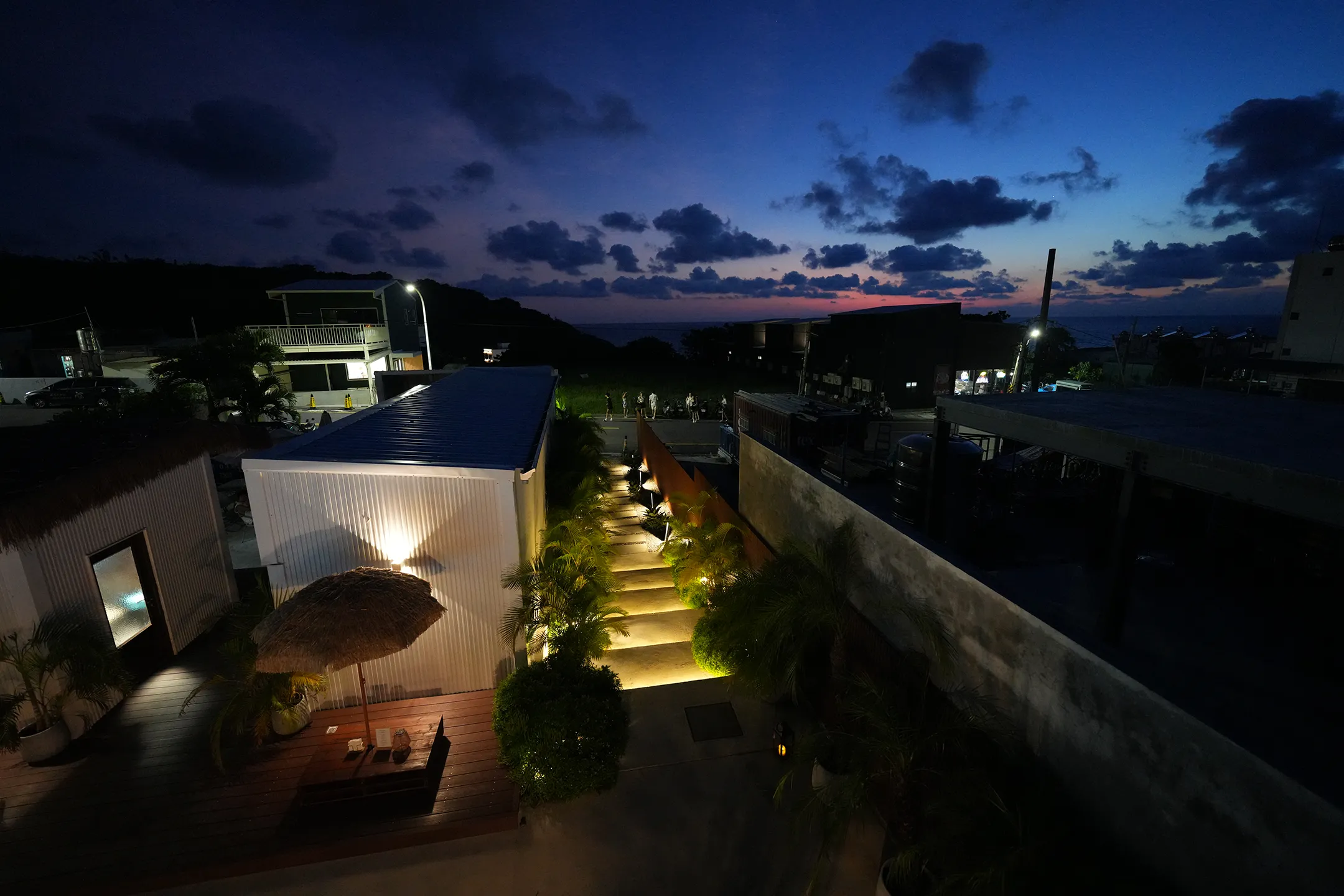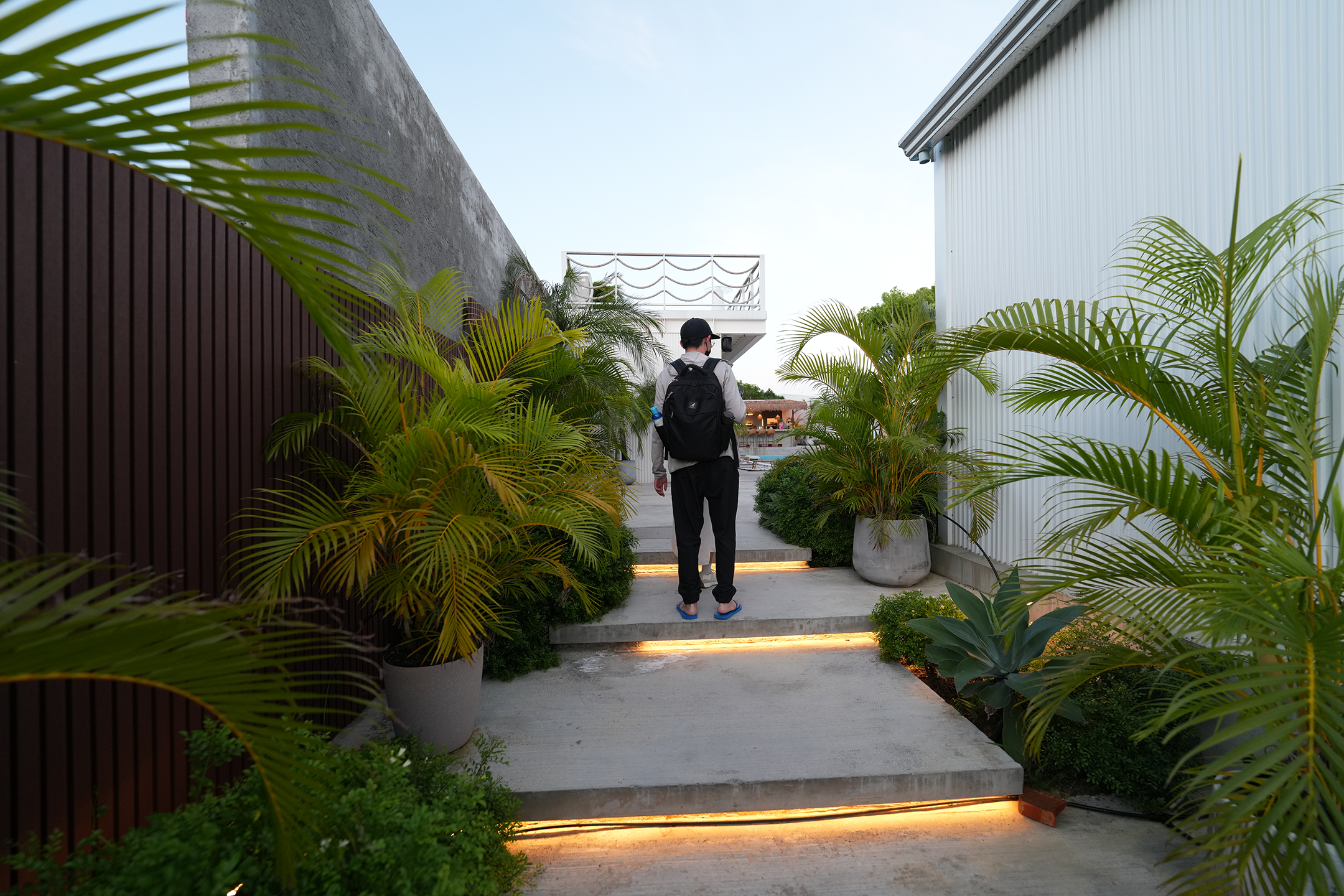 ▼走進入口,兩側種滿了茂密的植栽,階梯邊緣還設有燈,光線柔和而有氛圍,遠處隱約可見吧台與戶外座位區,整條走道瀰漫著一股南洋渡假的悠閒氣氛。