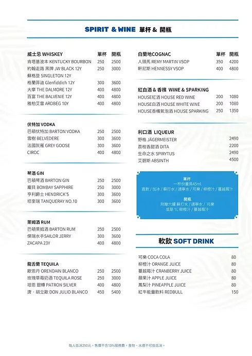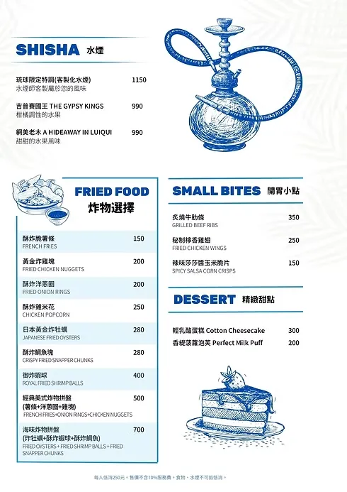 ▶ 每人低消$250元,同桌可合併消費,食物水煙不可折抵低消。