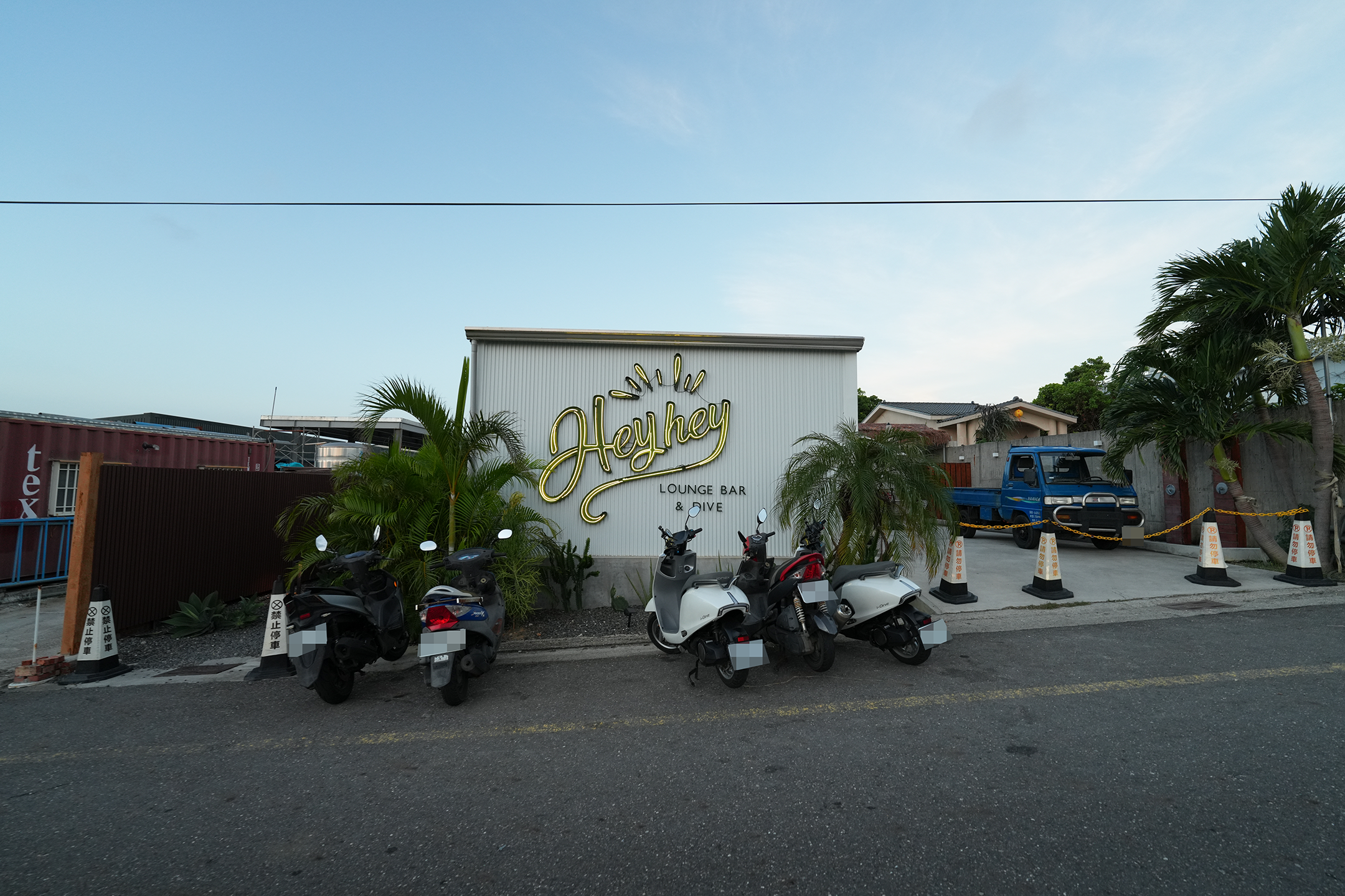 ▼「Heyhey Bar」門口可以停機車,入口從左側進入。白色的外牆上掛著金黃色霓虹燈招牌,字體設計復古又時髦,招牌兩側種有高大的棕櫚樹,帶有一點南洋度假風情。