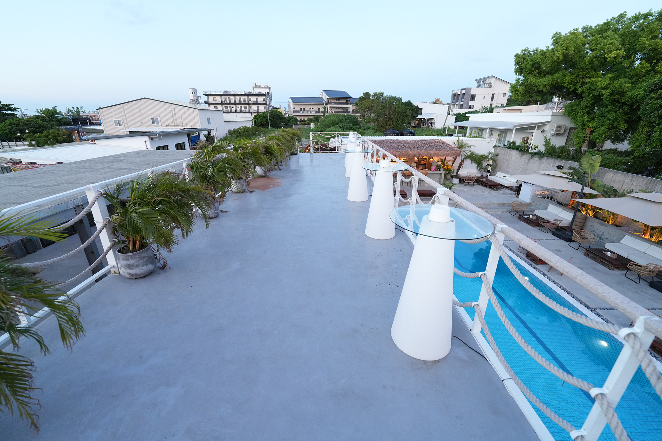 ▼二樓的露天區域,視野相當開闊,可以俯瞰整個一樓的泳池與座位區,一覽無遺。白色麻繩欄杆沿著泳池邊緣延伸,充滿濃濃的航海風情,搭配幾張造型簡約的白色喇叭形狀的高腳桌,另一側有一整排植栽妝點,讓整個空間更添熱帶島嶼的度假氛圍。