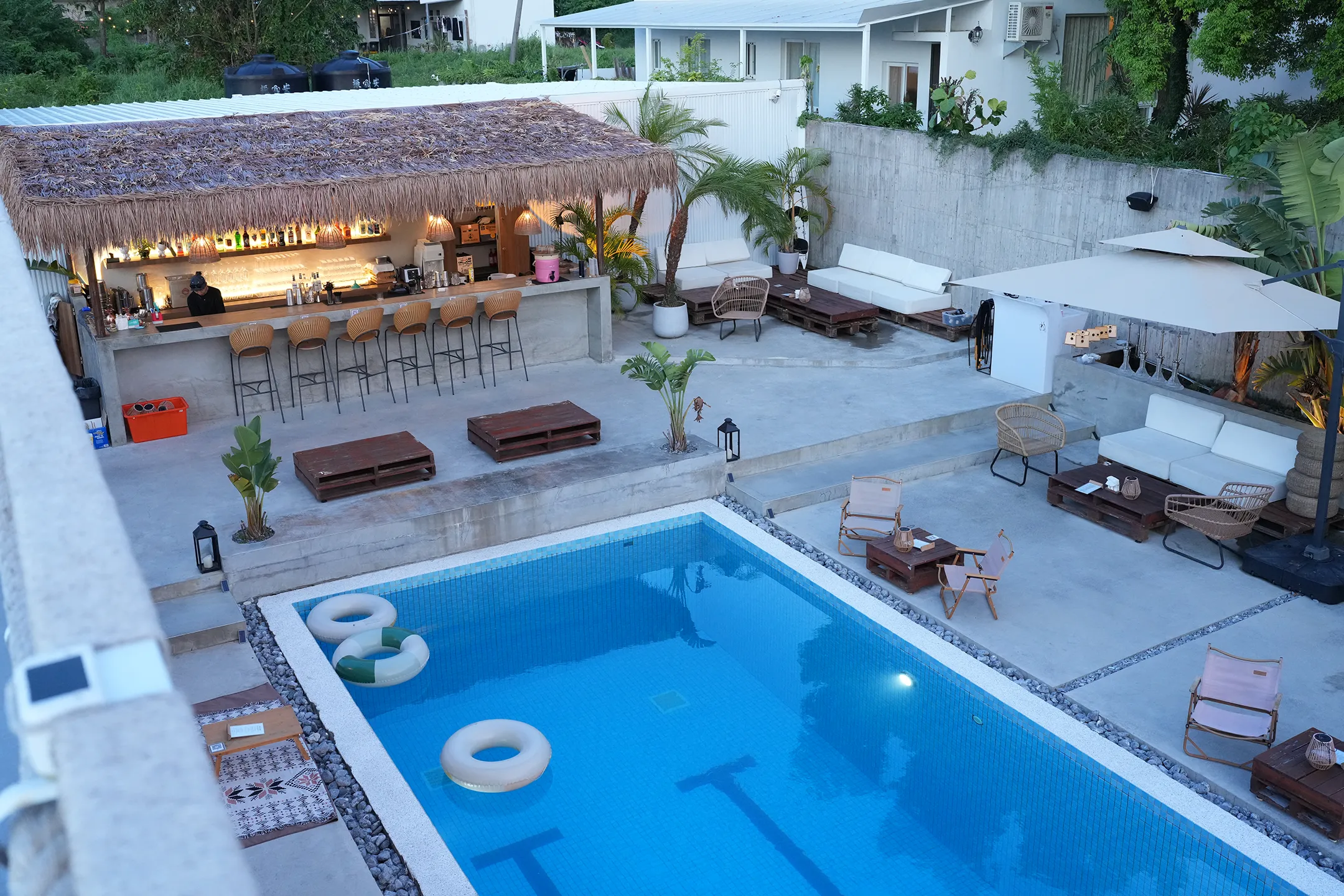 ▼進入泳池酒吧區映入眼簾的是一座清澈湛藍的戶外泳池,池邊鋪著鵝卵石,泳池內還有游泳圈可以玩水,旁邊整齊排列著椅子,讓人忍不住想坐下來放空。