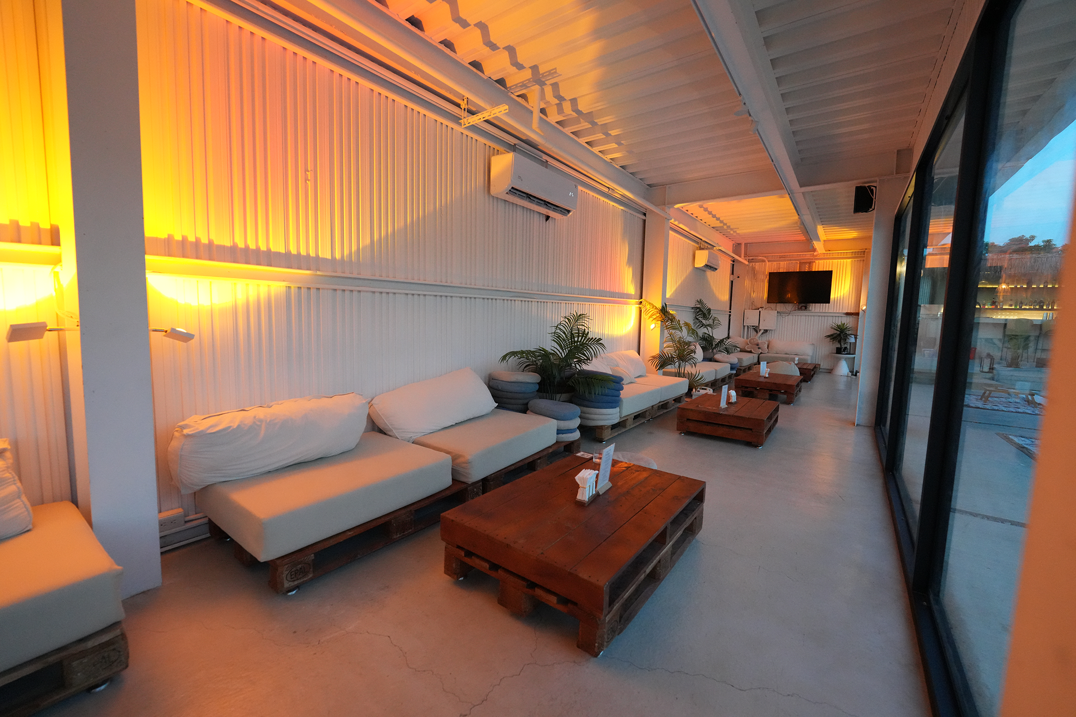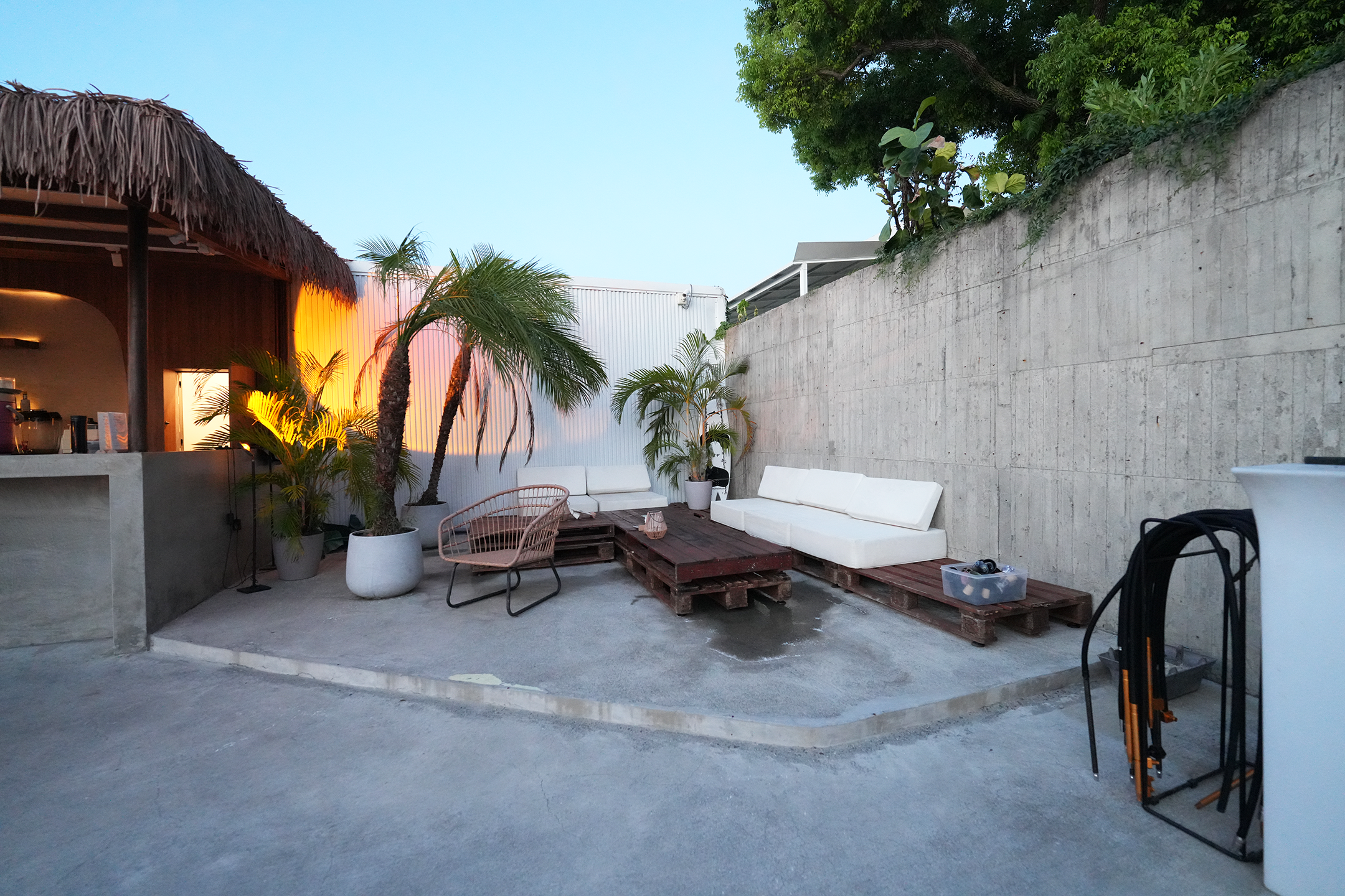 ▼吧台旁邊還有一處戶外座位區,這區以木棧板拼接而成的低矮茶几搭配白色長沙發,角落裡種著高挺的棕櫚樹與各式熱帶植栽,非常適合和三五好友窩在這裡,邊喝酒邊聊天。