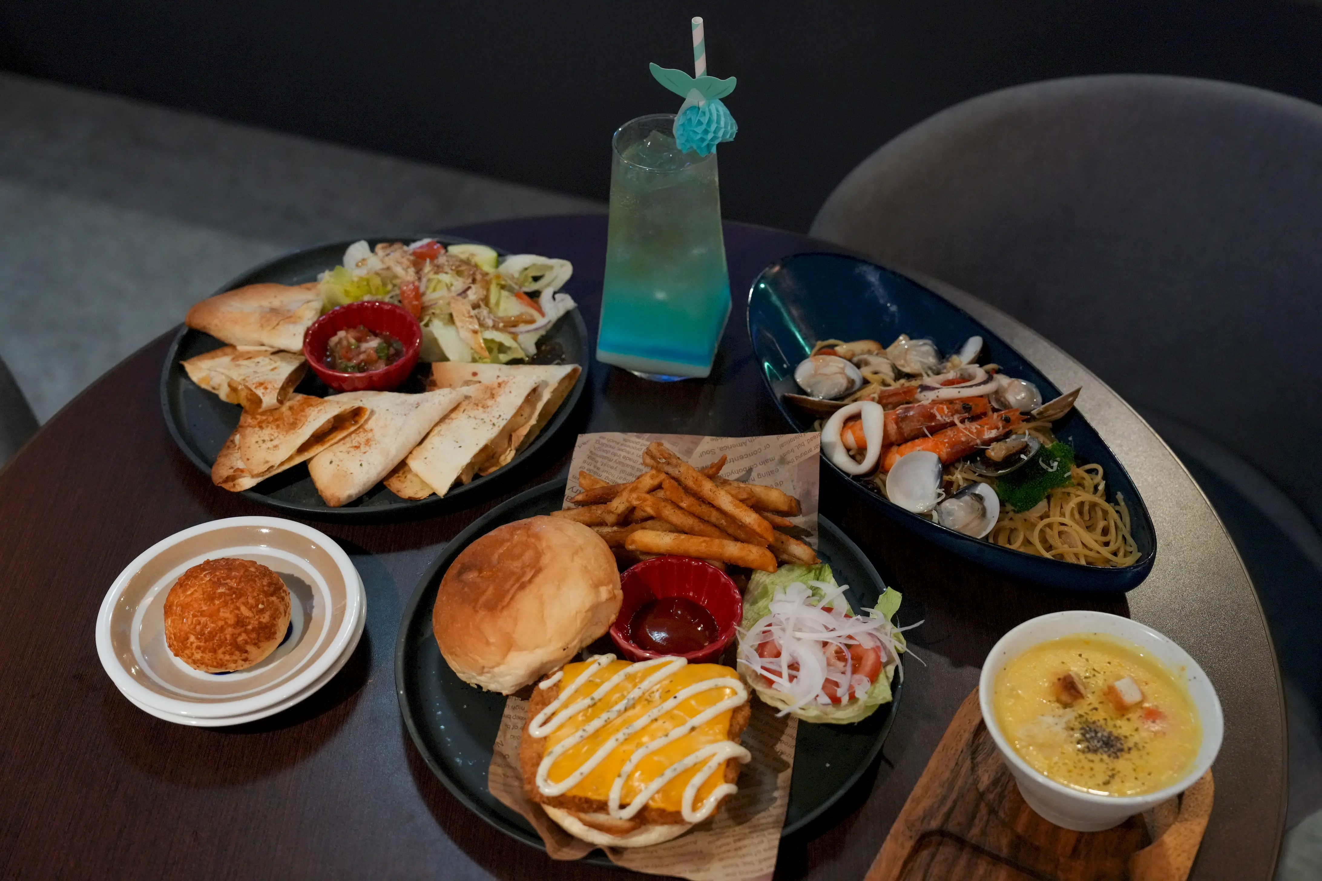 ▼這次我們點了自製墨西哥雞肉起士烤餅、特製鬼頭刀漢堡(附薯條)、辣炒海鮮義大利麵,還有每日濃湯(附麵包),以及一杯特調飲品「美人魚的眼淚」,滿滿一桌看起來超豐盛。