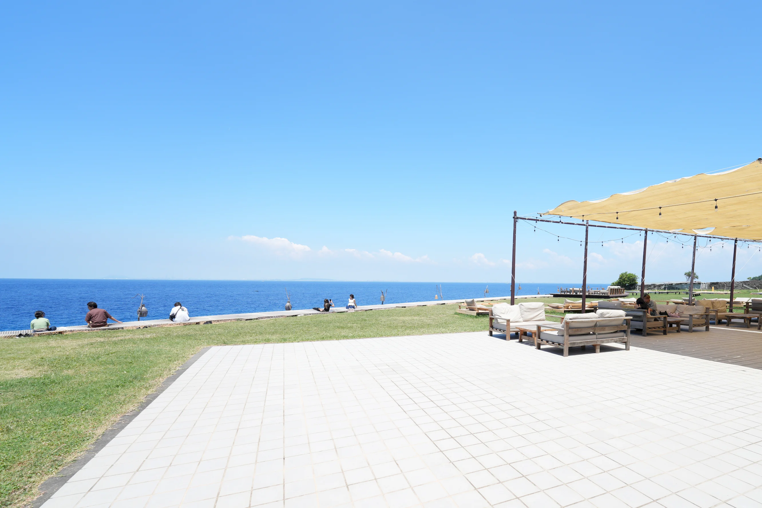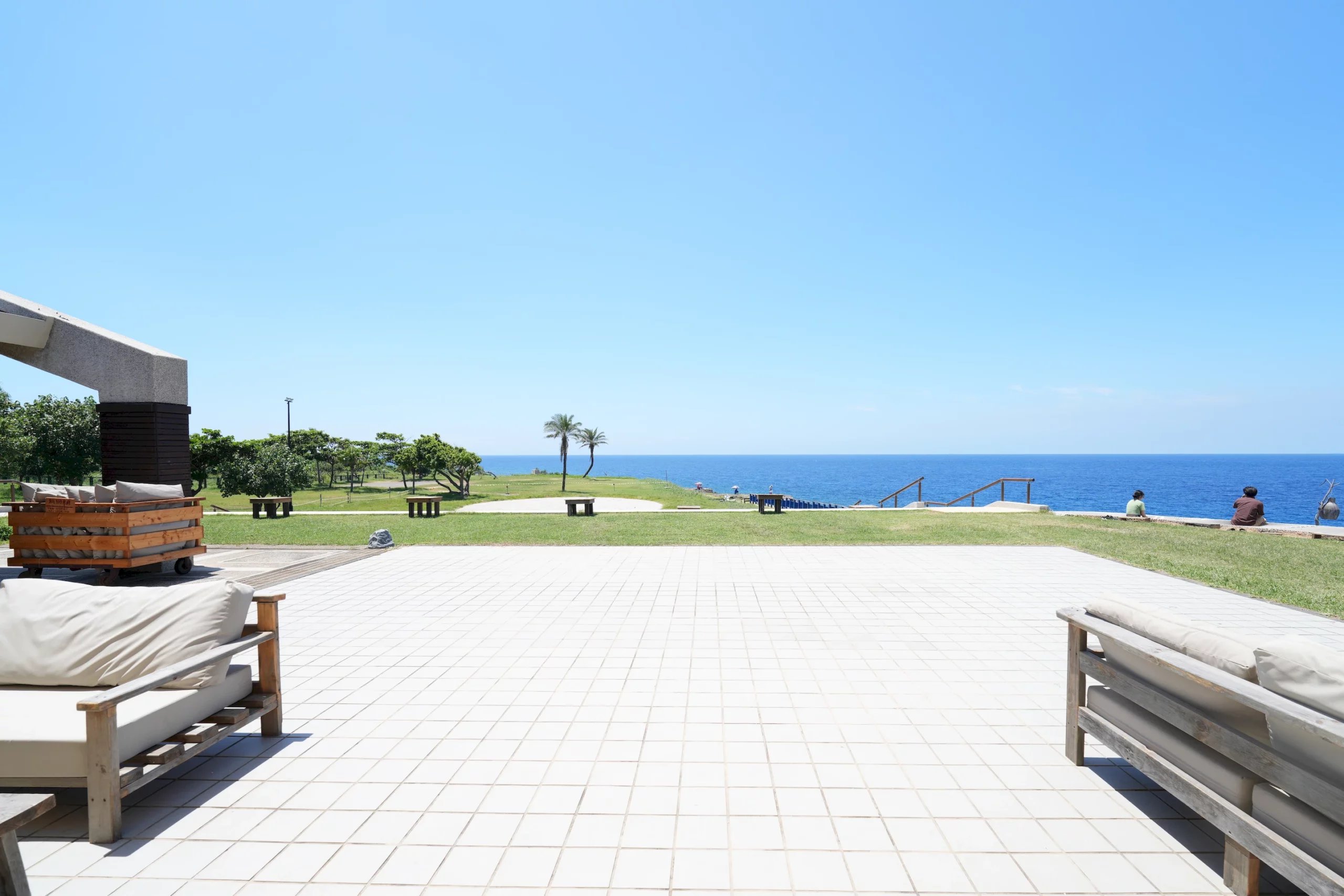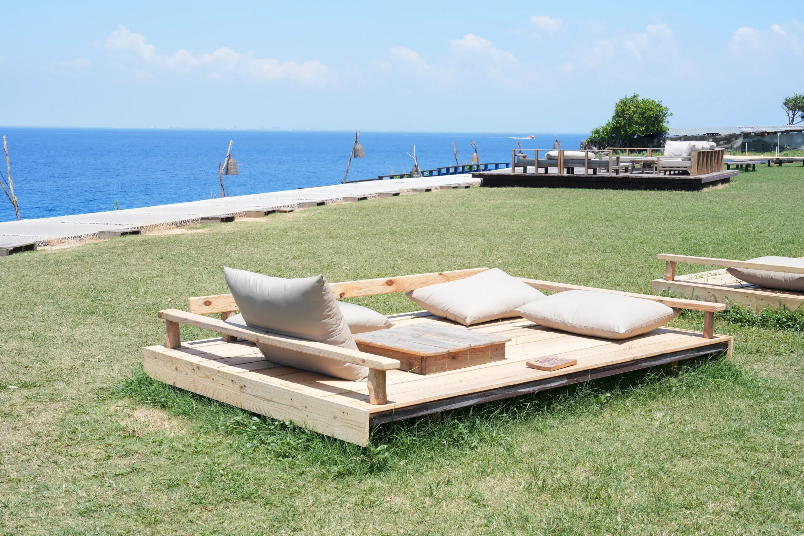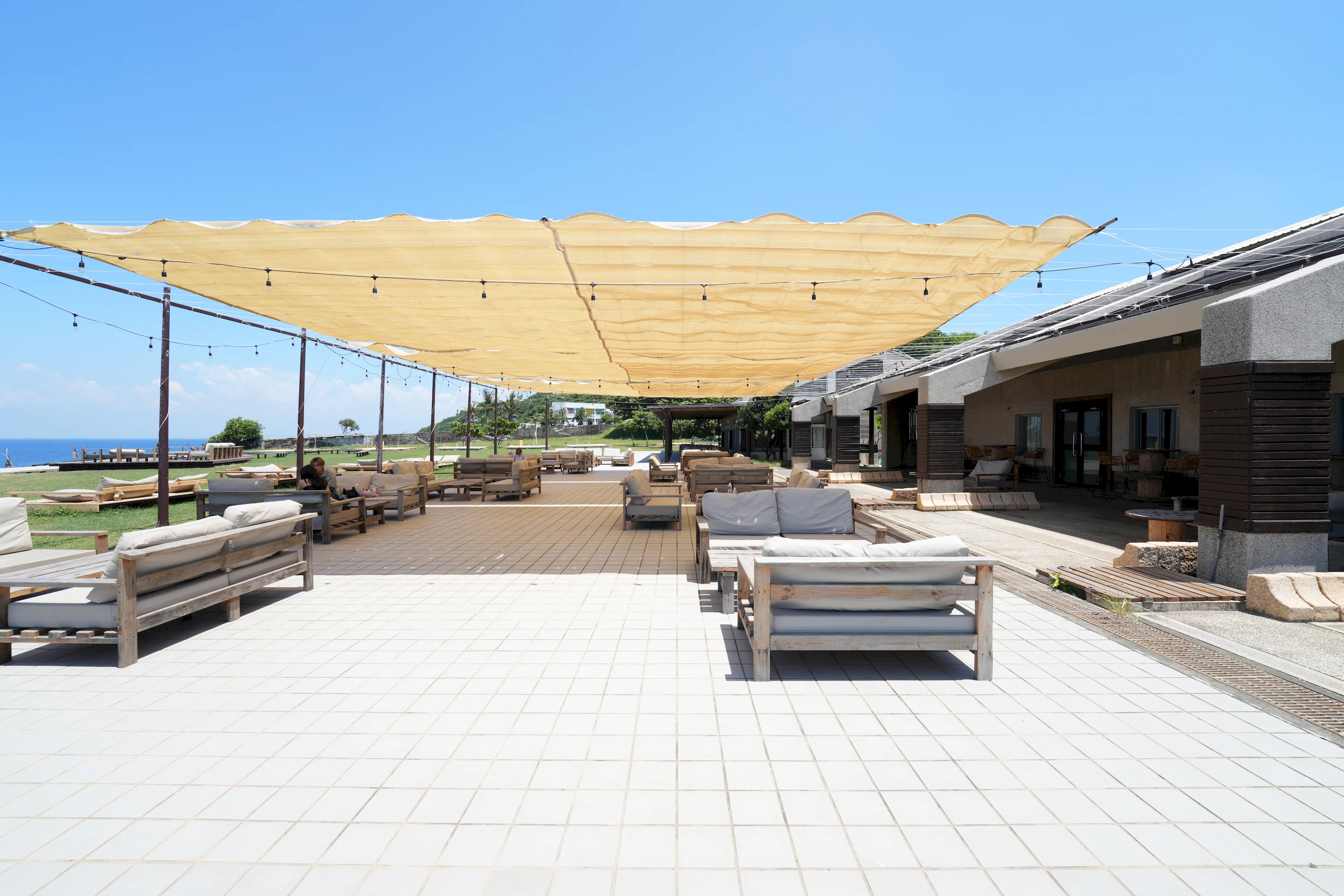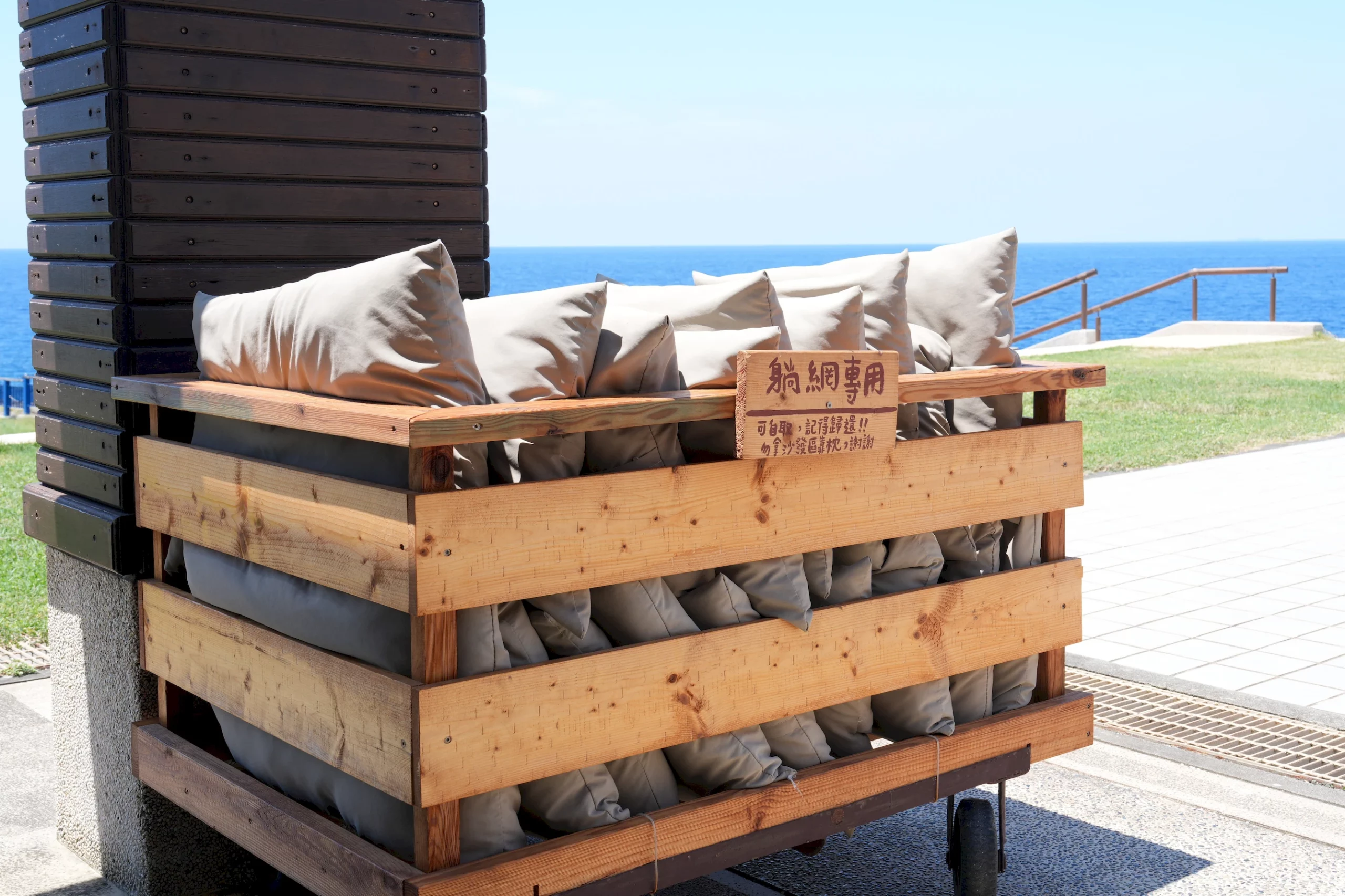 ▼從展區往外走便能看見一望無際的汪洋大海,以及療癒的躺網區和戶外座位區,其中戶外座位區有些設有遮陽帆布,有些則沒有,遊客可以依照個人喜好自由挑選想要的座位,坐下來靜靜享受這片迷人的海景。