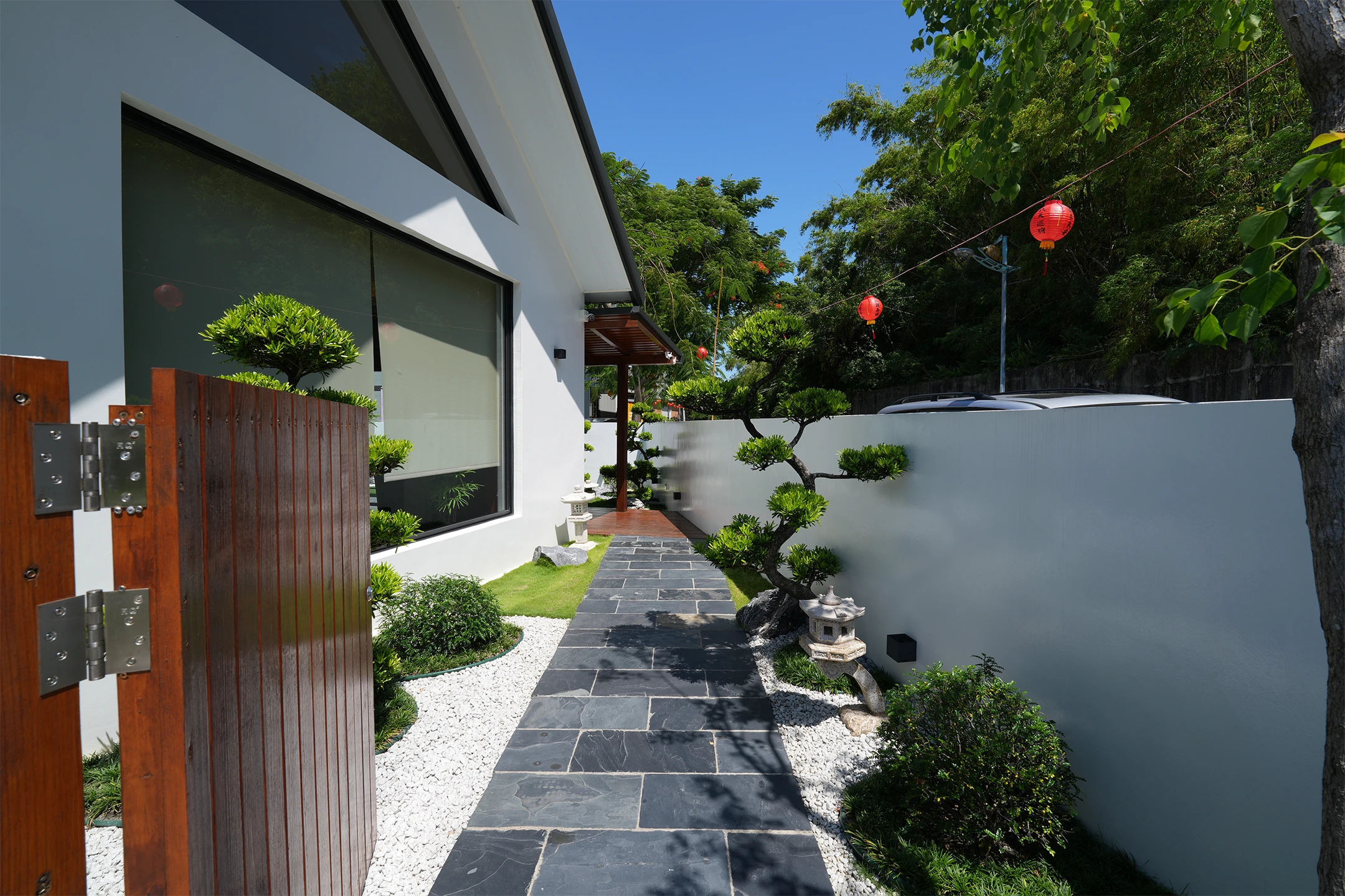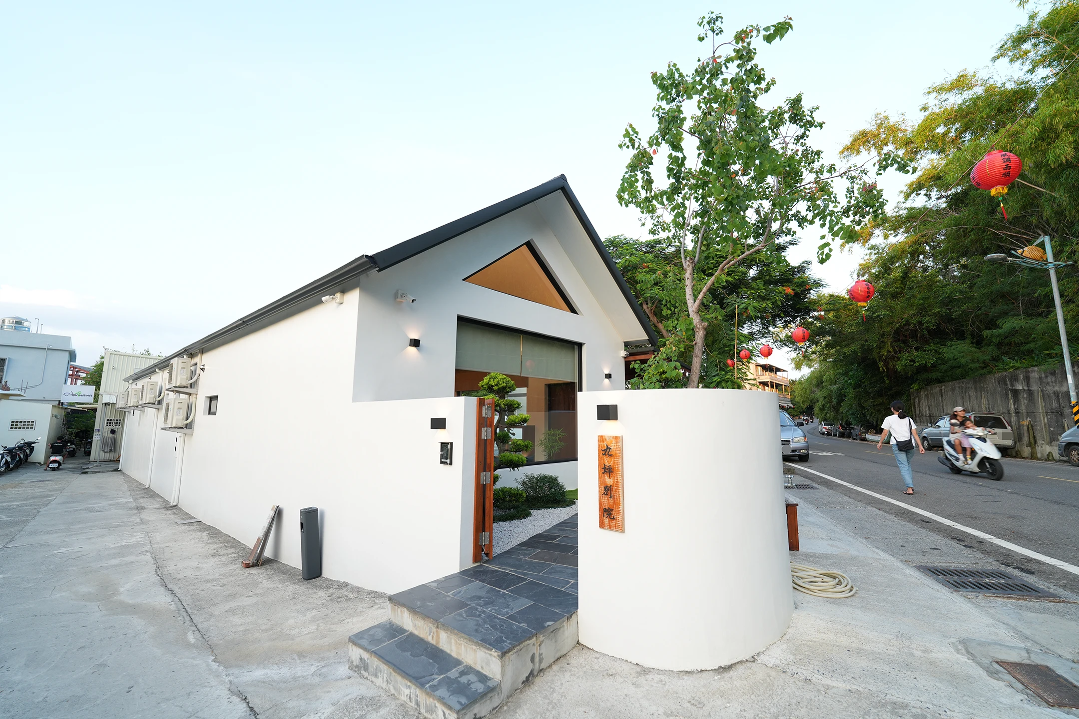 ▼「九坪別院」純白外牆搭配深灰斜屋頂,線條簡約俐落,入口的原木門與竹木牌匾透露出濃濃的日式禪意,圓弧形的外圍矮牆柔化了建築的稜角,搭配石板階梯與簡約壁燈,非常的簡約典雅。
