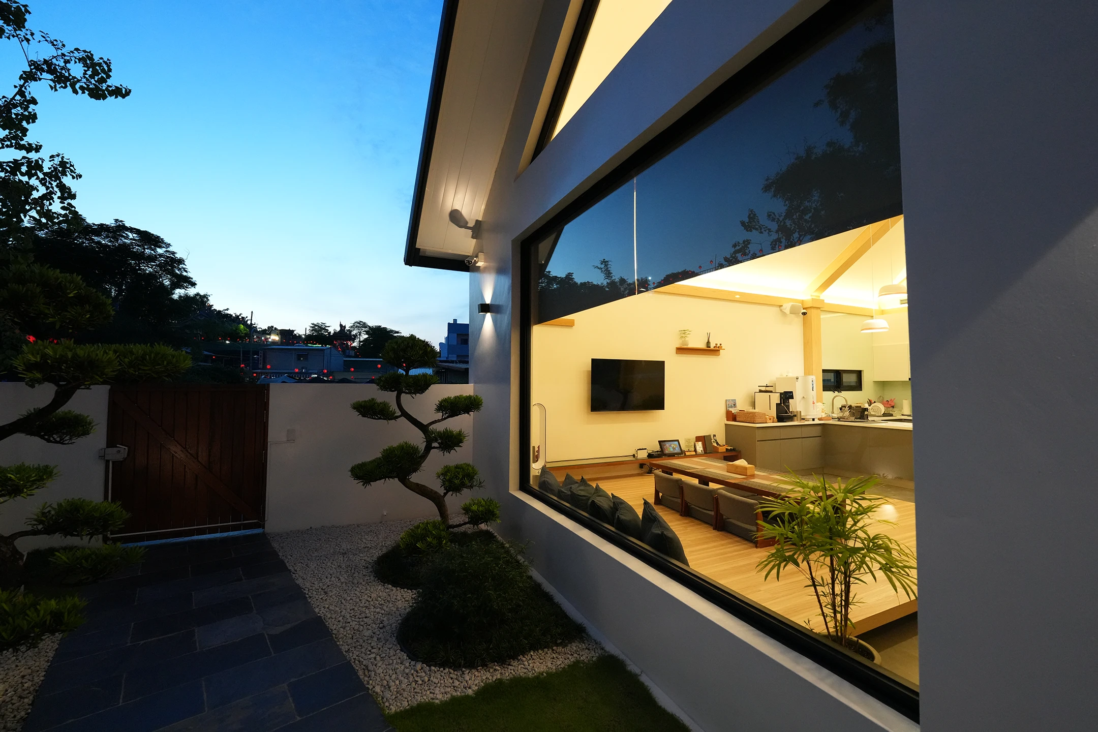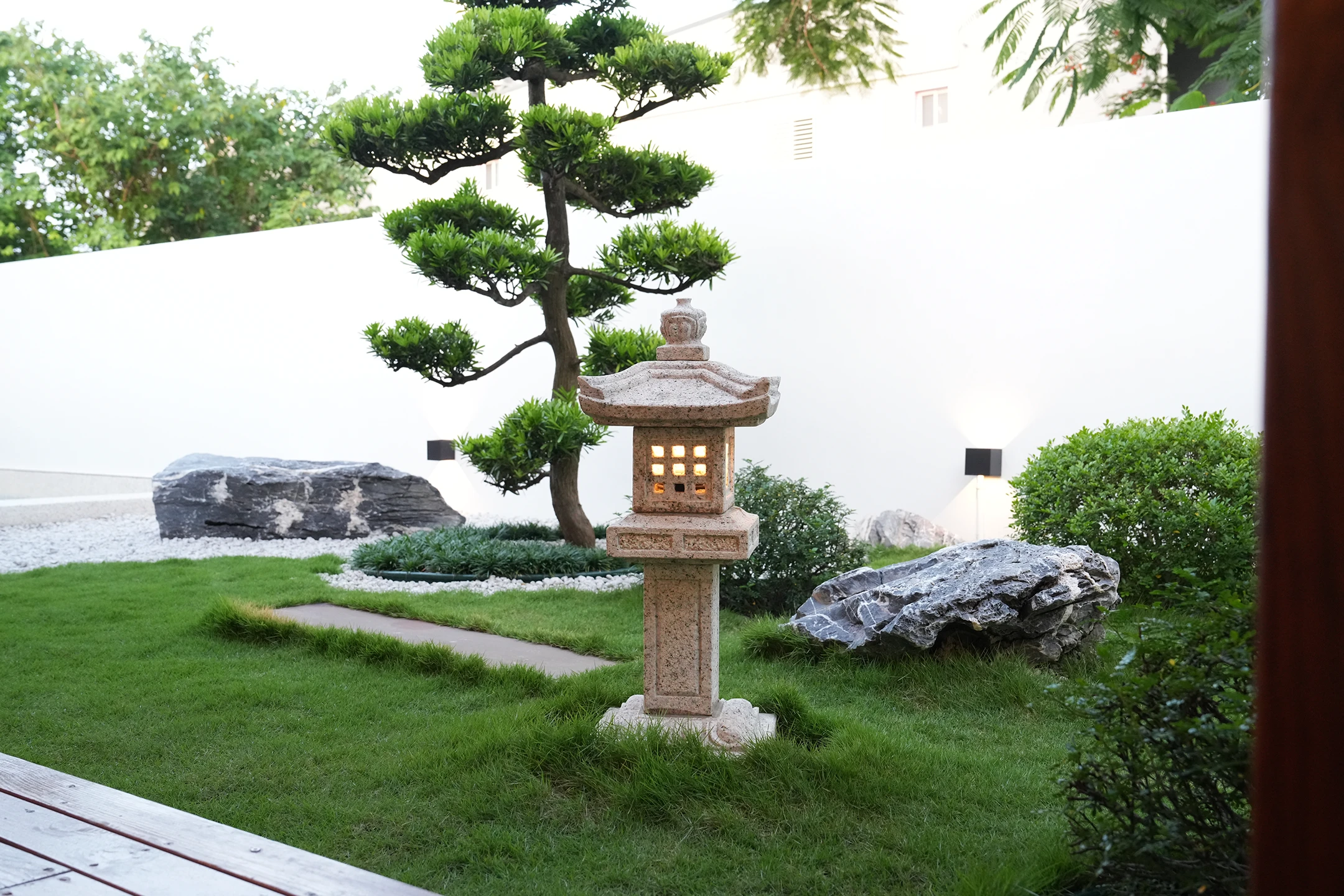 ▼日式庭院真的設計得太美了!石燈籠透出溫暖的光,旁邊一棵造型松樹姿態優雅,灰色山石與白色碎石錯落其間,踩在柔軟的翠綠草坪上,整個人瞬間就靜下來了,感覺真的像走進了日本庭園一樣。
