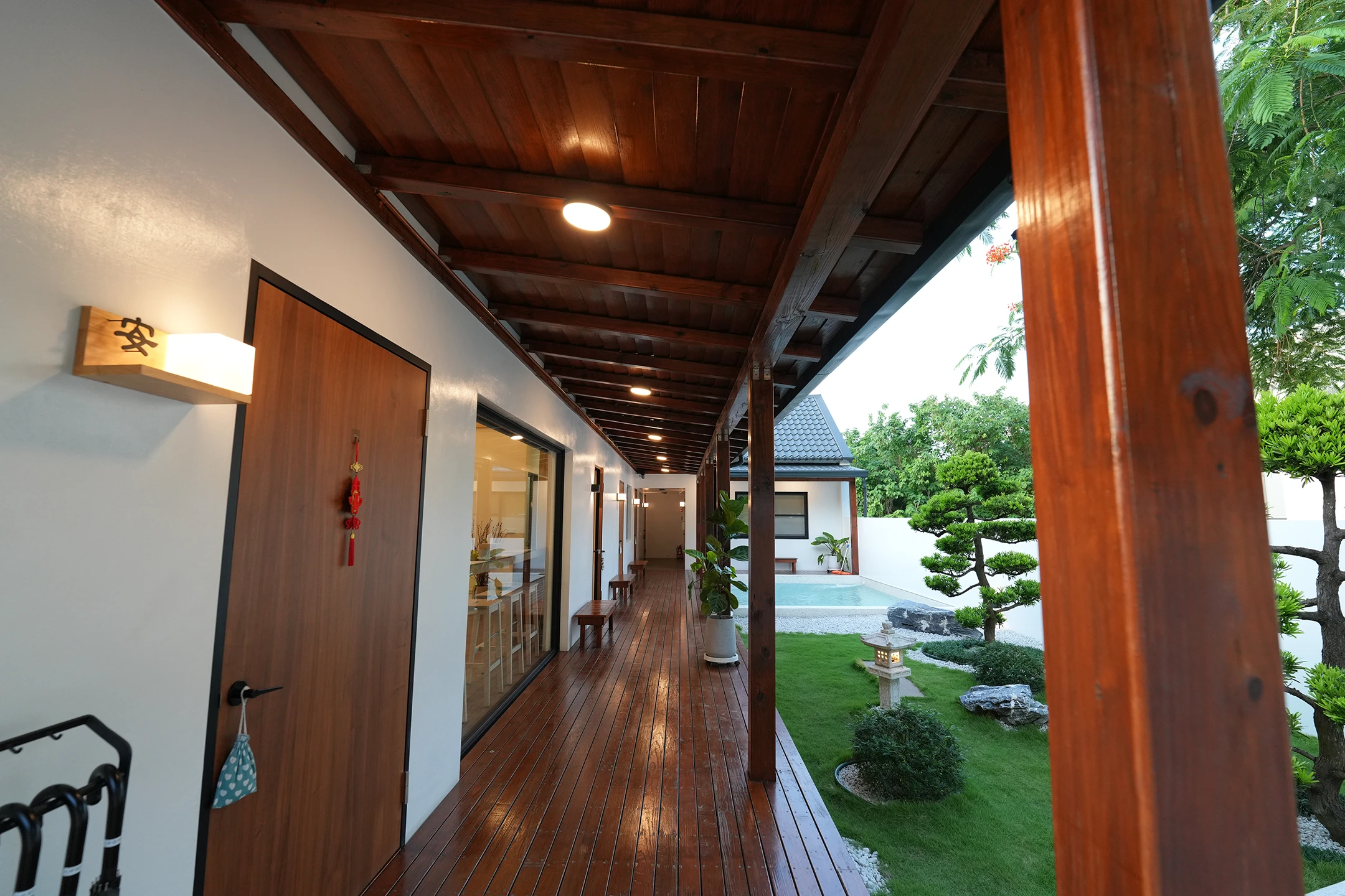 ▼深色原木打造的長廊,天花板的木樑結構搭配暖光燈,長廊面向中央庭院,有碧藍的泳池、石燈籠與修剪整齊的草坪,非常的有質感。