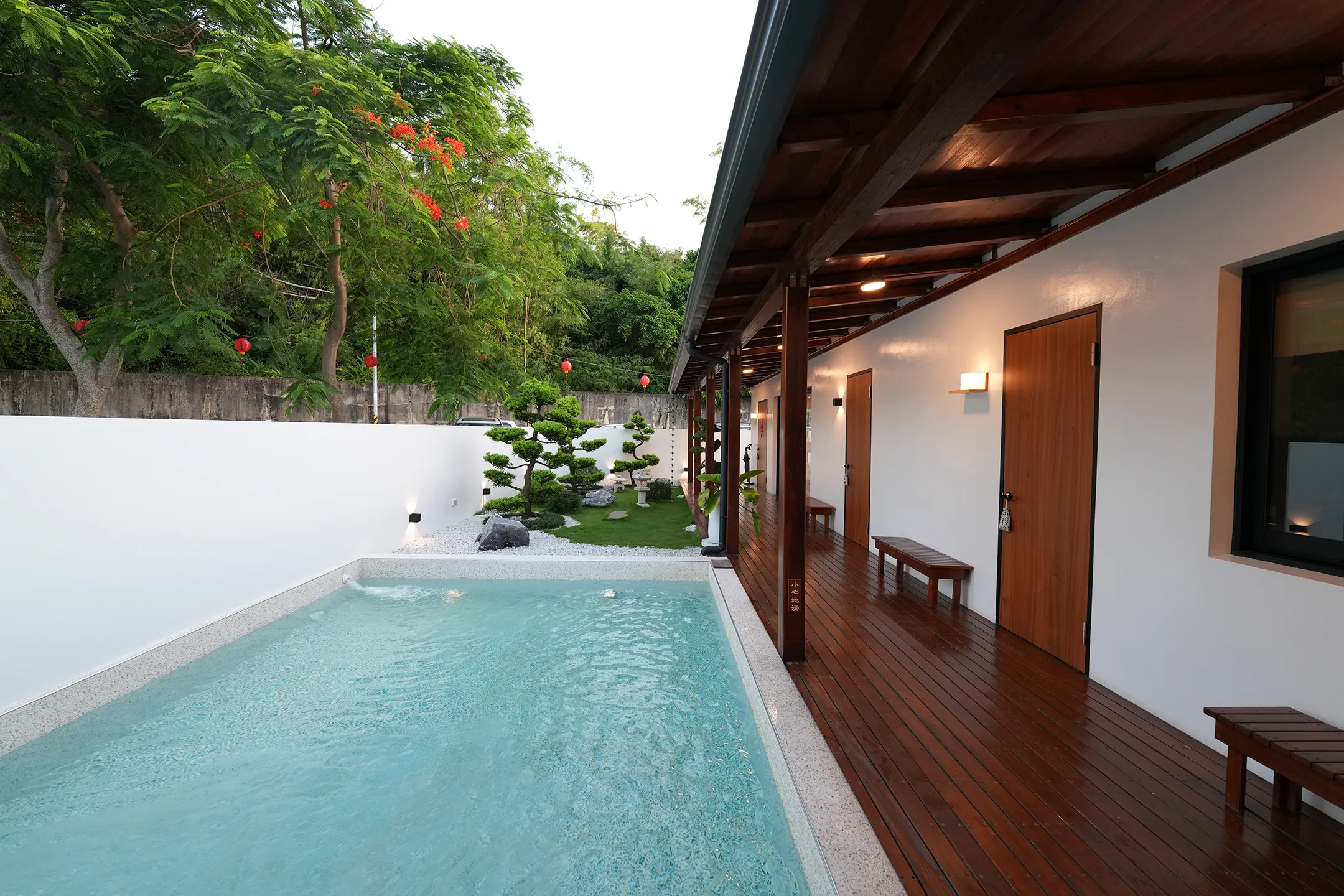 ▼日式庭園旁就是整個別院最吸睛的亮點「戶外泳池」,池底鋪設水藍色石子,在光線的折射下泛著清透的水藍色澤,清涼感十足,讓人看了就想直接跳進去。長廊緊鄰池邊,泡完水隨手拿條毛巾坐在廊下吹風,身旁還有日式庭園相伴,這環境也太愜意了吧。