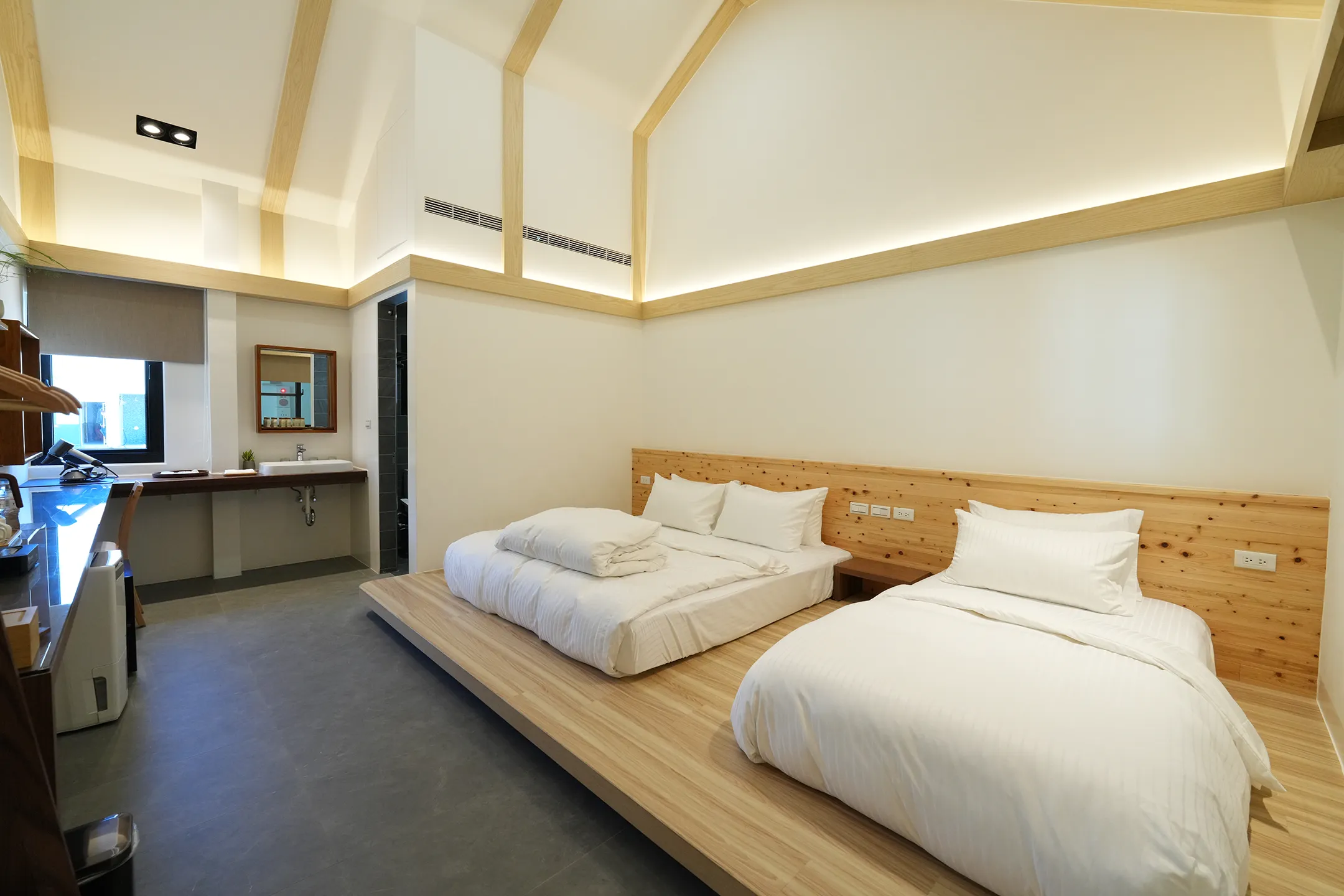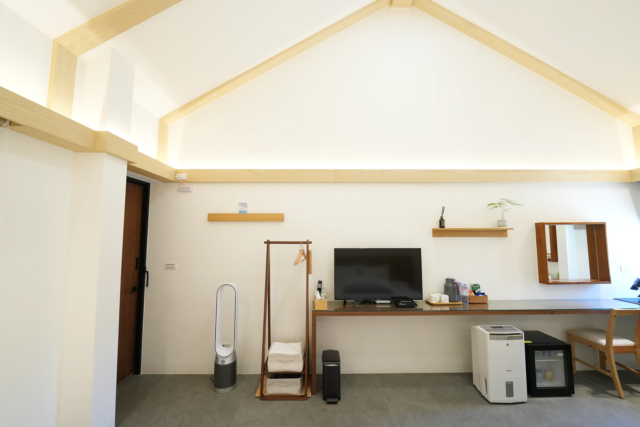 ▼房間採挑高三角屋頂設計,原木色的屋樑搭配白色牆面,空間感十足又帶著溫潤的日系氛圍。房內配備一應俱全,電視、木質衣架、Dyson涼暖空氣清淨機、除濕機、小冰箱一字排開,機能相當完善,住起來舒適又安心。