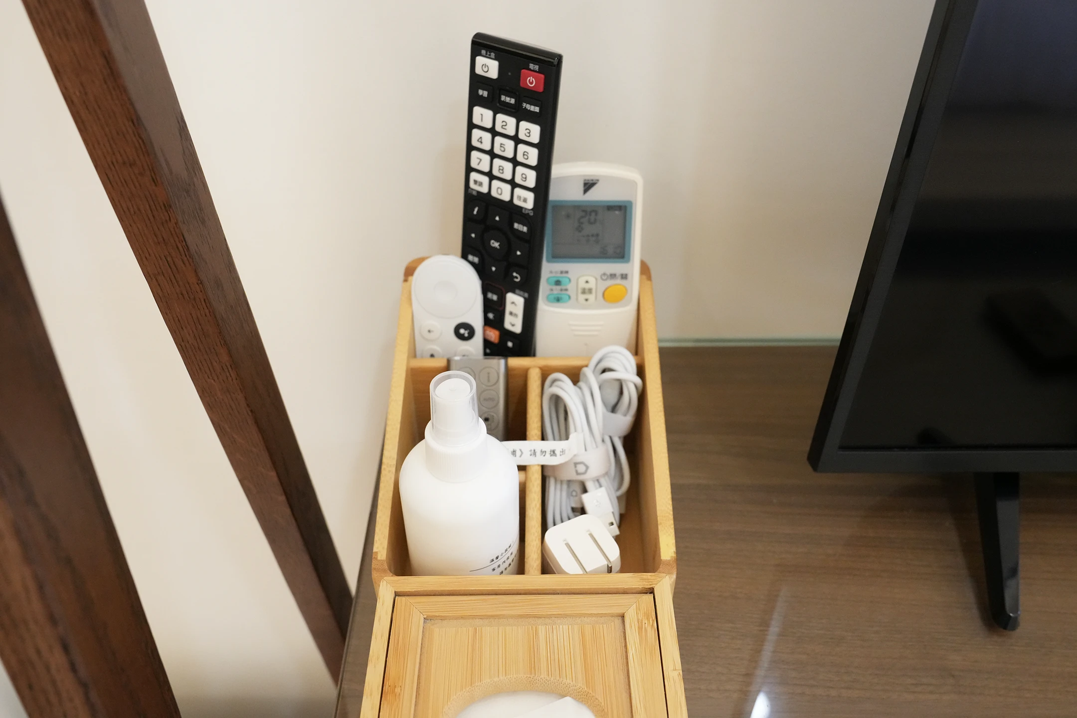 ▼電視旁的雜物區也收納得很整齊,內容物有:電視、冷氣遙控器、充電線、酒精。