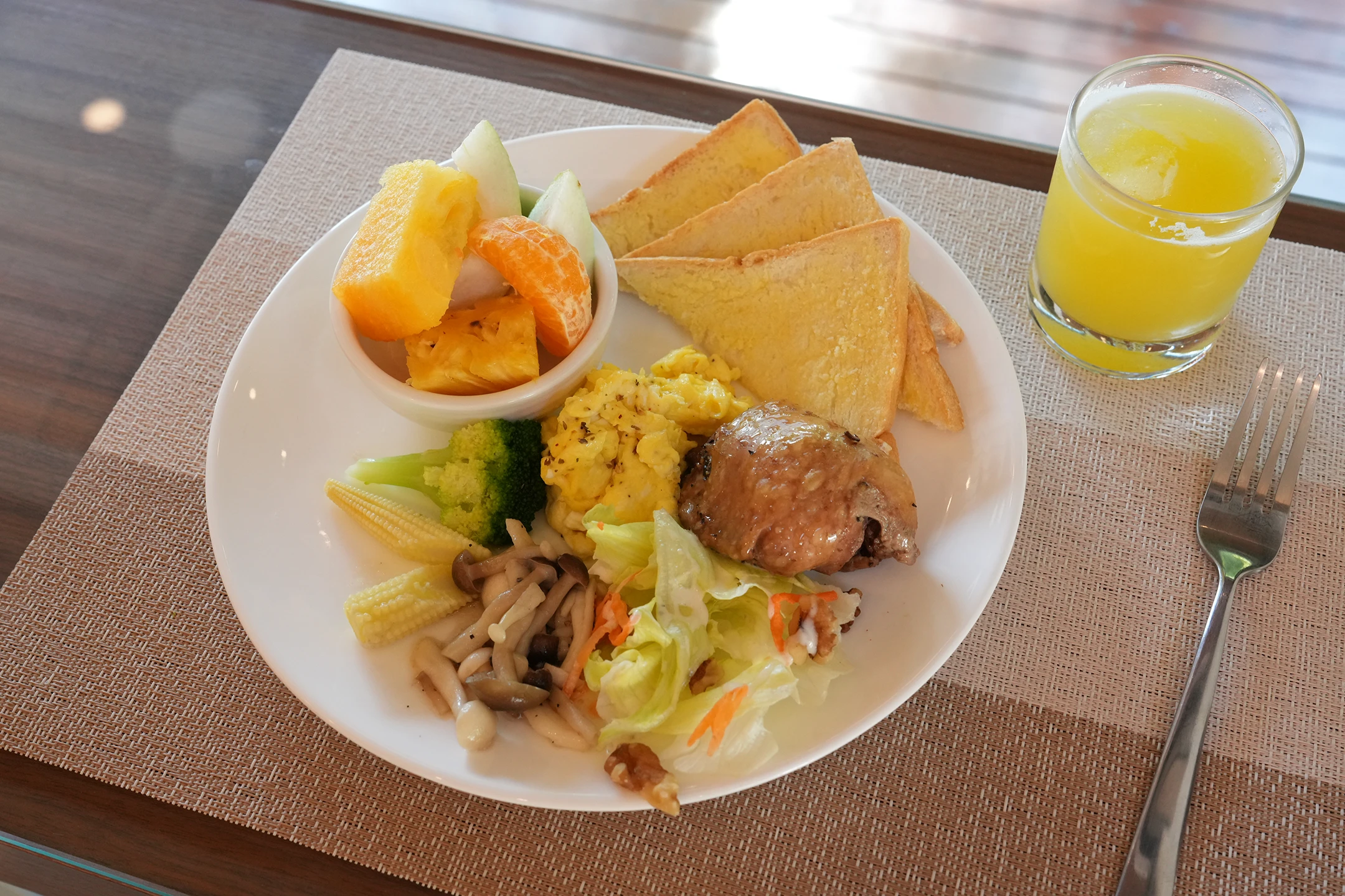 ▼每天的早餐都不一樣,採現點現做的方式,每一份都是精心擺盤的早午餐拼盤,光是視覺上就已令人食慾大開。第一天的拼盤豐富而均衡,奶油吐司烤得表面微酥,搭配軟嫩的雞肉與清爽的時蔬、水果,再配上一杯柳橙汁,整體而言,這是一份清爽不油膩的拼盤,份量也恰到好處,口味上中規中矩,但勝在食材新鮮,很適合作為開啟小琉球一日行程的第一餐。