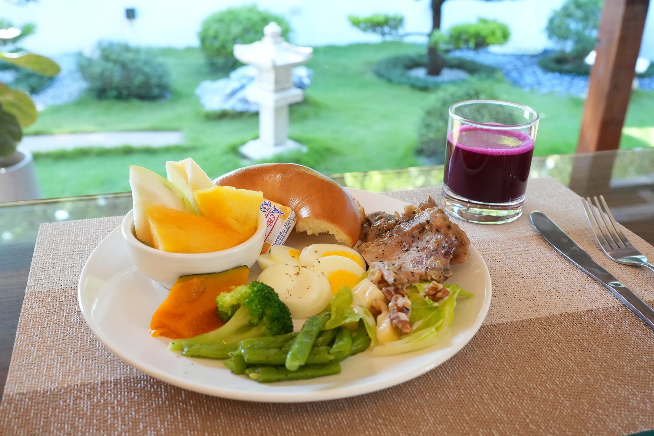▼第二天吃貝果早午餐,同樣是份量十足的拼盤,主角貝果紮實有嚼勁,抹上果醬後甜而不膩,搭配豬排與爽口時蔬、水果、水煮蛋,營養均衡,飲品則搭配了一杯深紫色的紅龍果汁,與整體清爽的餐點風格相得益彰。