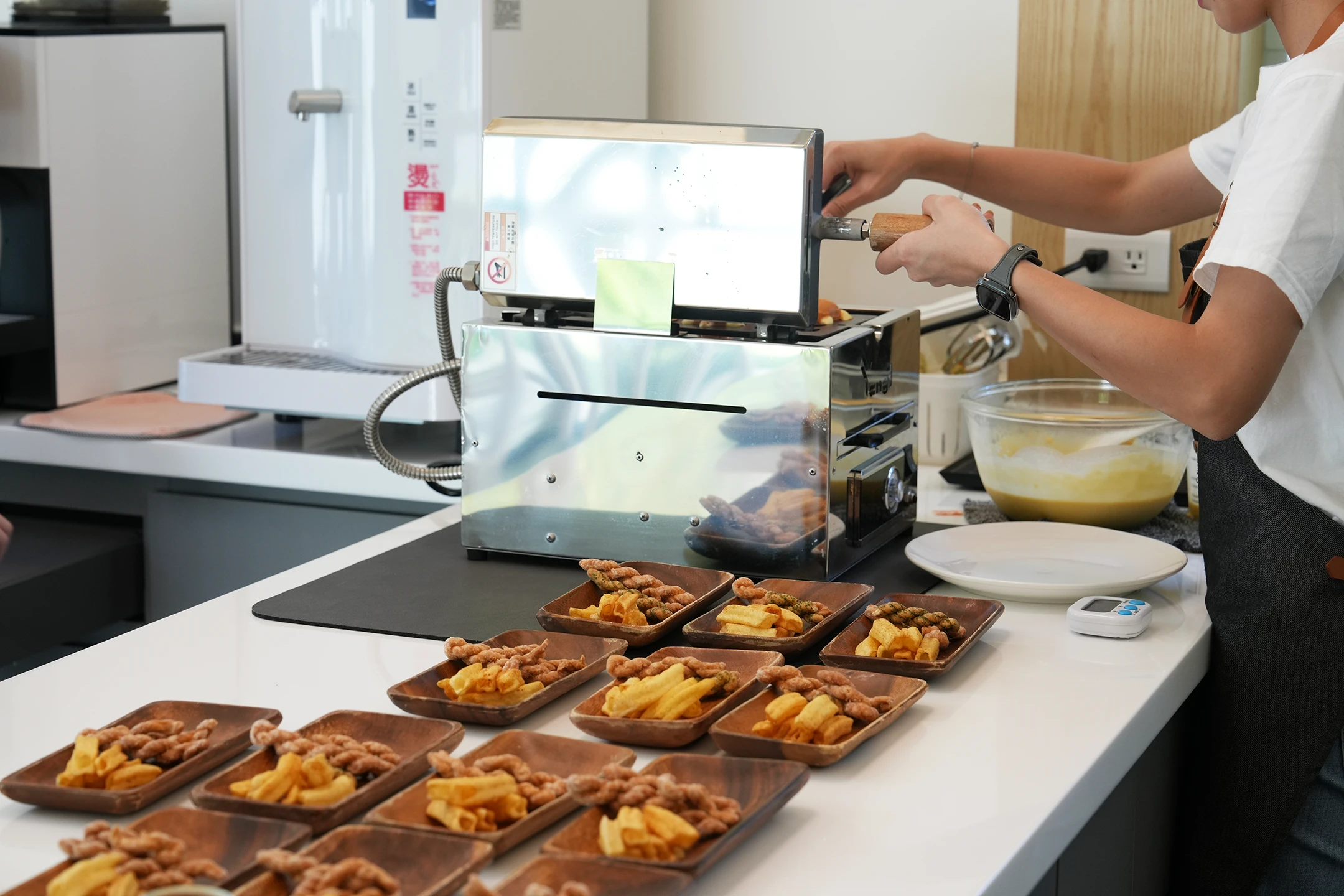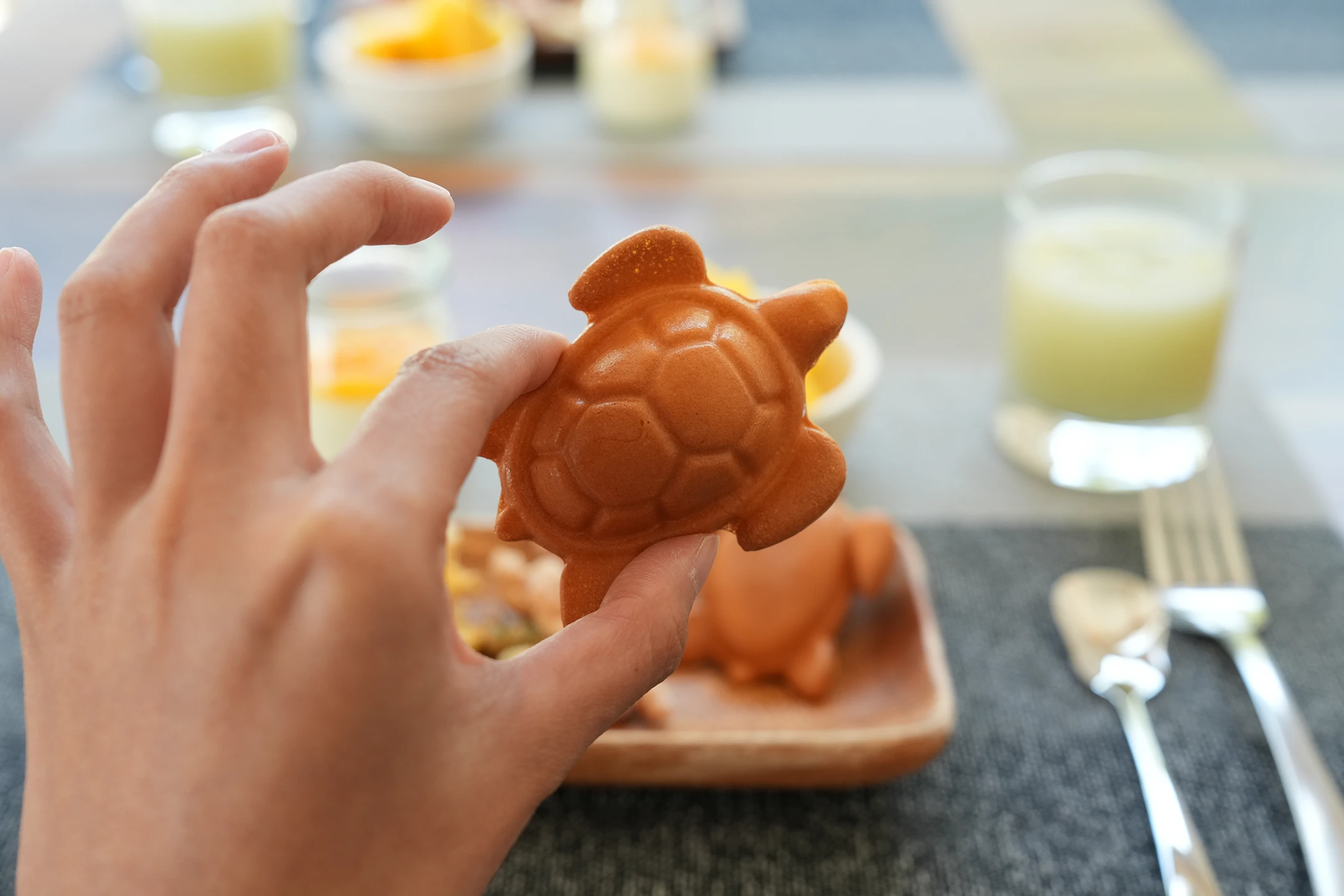 ▼下午茶的點心組合豐富多樣,金黃酥脆的薯條餅乾,鹹香好吃;小琉球特產麻花捲口感酥脆,越嚼越香,讓人忍不住一口接一口;最吸睛的莫過於現烤的海龜造型的雞蛋糕,外皮金黃微酥、內裡鬆軟綿密,完美呼應了小琉球以海龜聞名的島嶼特色;清甜多汁的西瓜切片消暑解膩,芒果奶酪則以滑順細膩的口感,甜而不膩;再搭配一杯現打果汁,這份下午茶吃出了滿滿的島嶼悠閒風情。