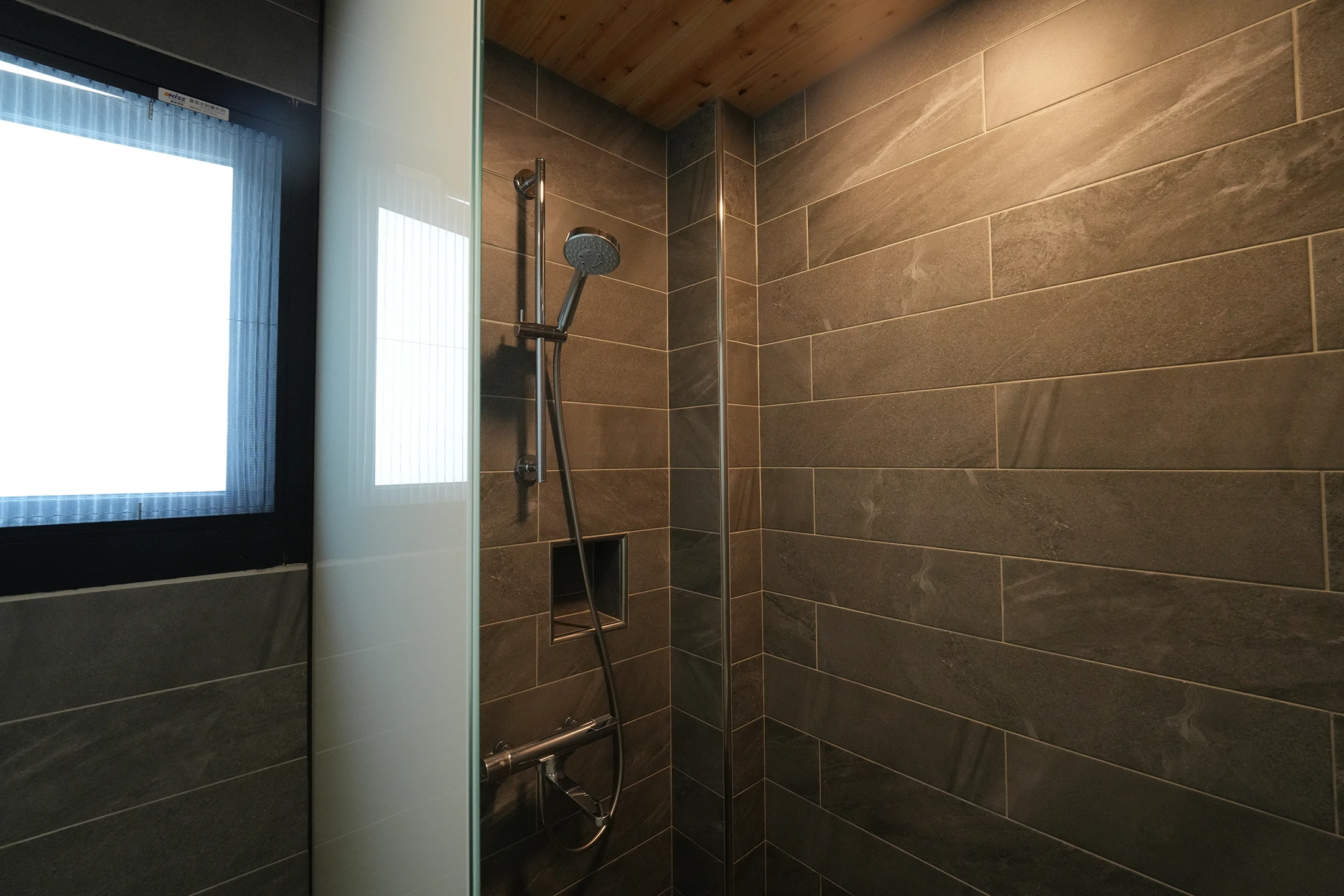 ▼衛浴空間以深灰色石紋磚牆打造,風格沉穩又有質感。馬桶與淋浴區之間雖然有磨砂玻璃隔板做區隔,但兩者其實還是在同一個空間內,並沒有真正的乾濕分離。對於習慣乾濕分離的人來說,使用起來可能要稍微注意一下。