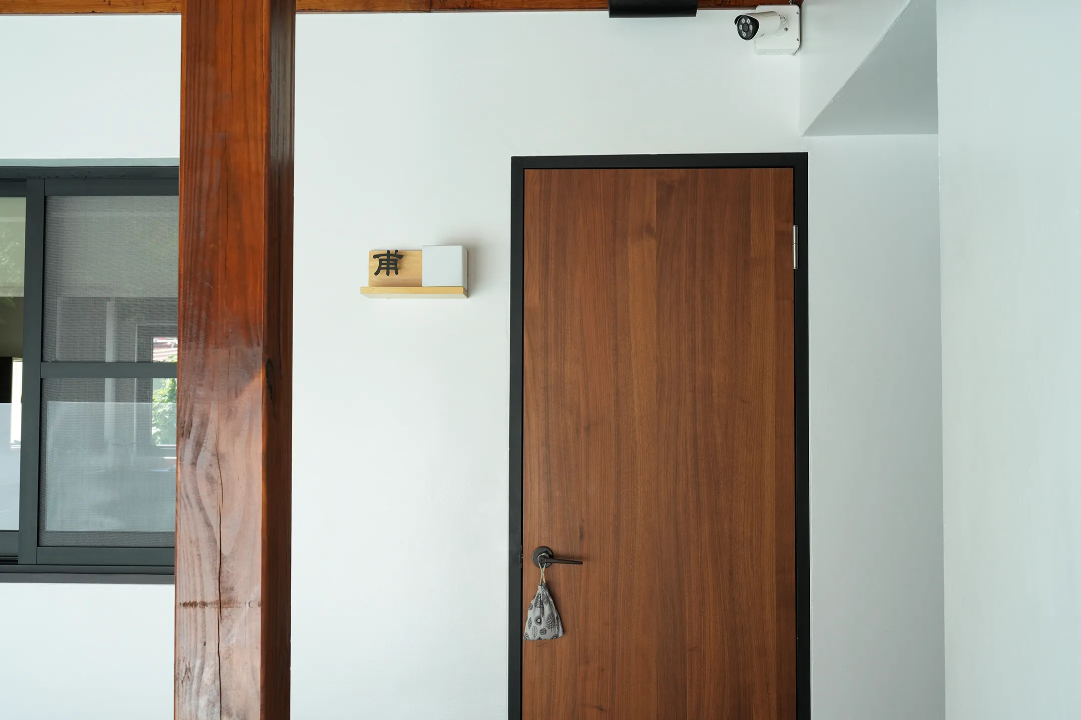 ▼我們入住的三人房名為「甫」,光是走廊上那扇木頭房門搭配充滿設計感的房名牌,就讓人忍不住駐足欣賞,還沒進房便已留下好印象,房門口掛著一個小巧的束口袋,雖然民宿沒有特別說明用途,但我們推測應該是驅蚊相關的東西。