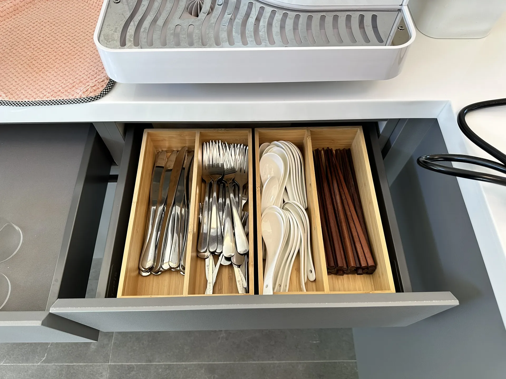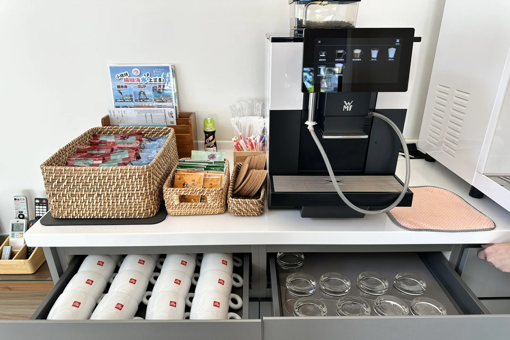 ▼大廳設有開放式 MINI BAR,所有房客皆可自由取用,隨時想喝都十分方便。備有多款茶包與餅乾供選擇,並貼心配置了咖啡機,讓咖啡愛好者也能隨時沖上一杯香濃現煮咖啡;拉開下方抽屜,玻璃杯、咖啡杯與各式餐具也一應俱全。