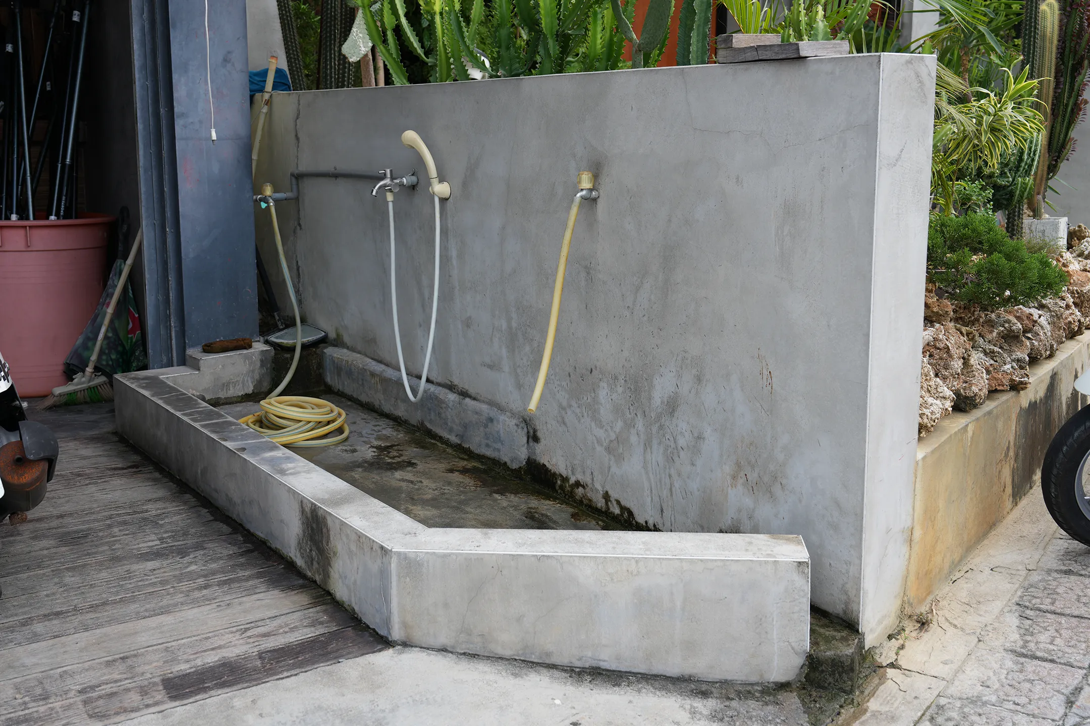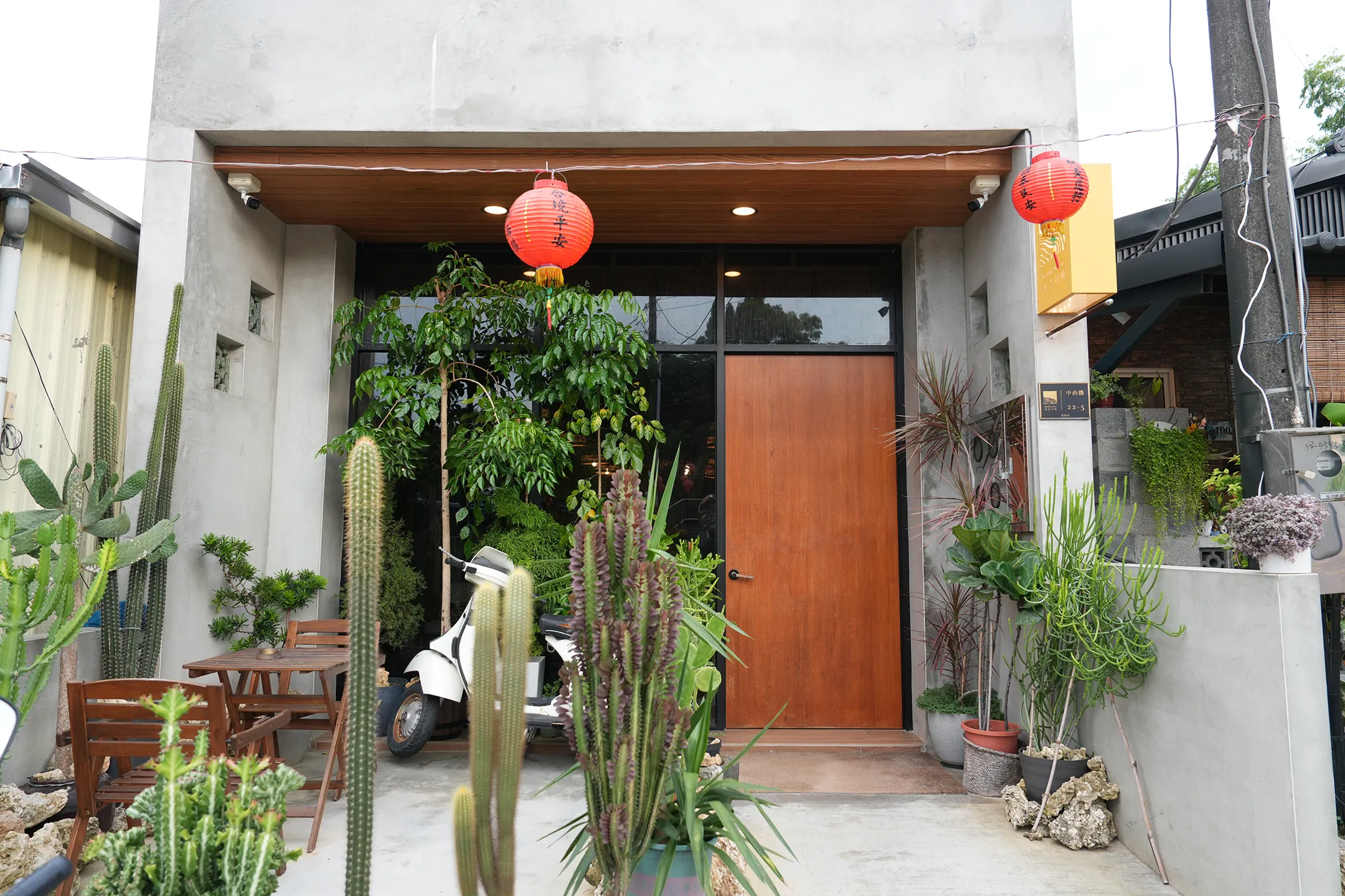 ▼走近入口才發現另有驚喜,玄關前種滿了各式熱帶植物,仙人掌、棕櫚、多肉植物高高低低錯落排列,木質大門搭配清水模外牆,冷與暖的材質對比,非常的有質感。