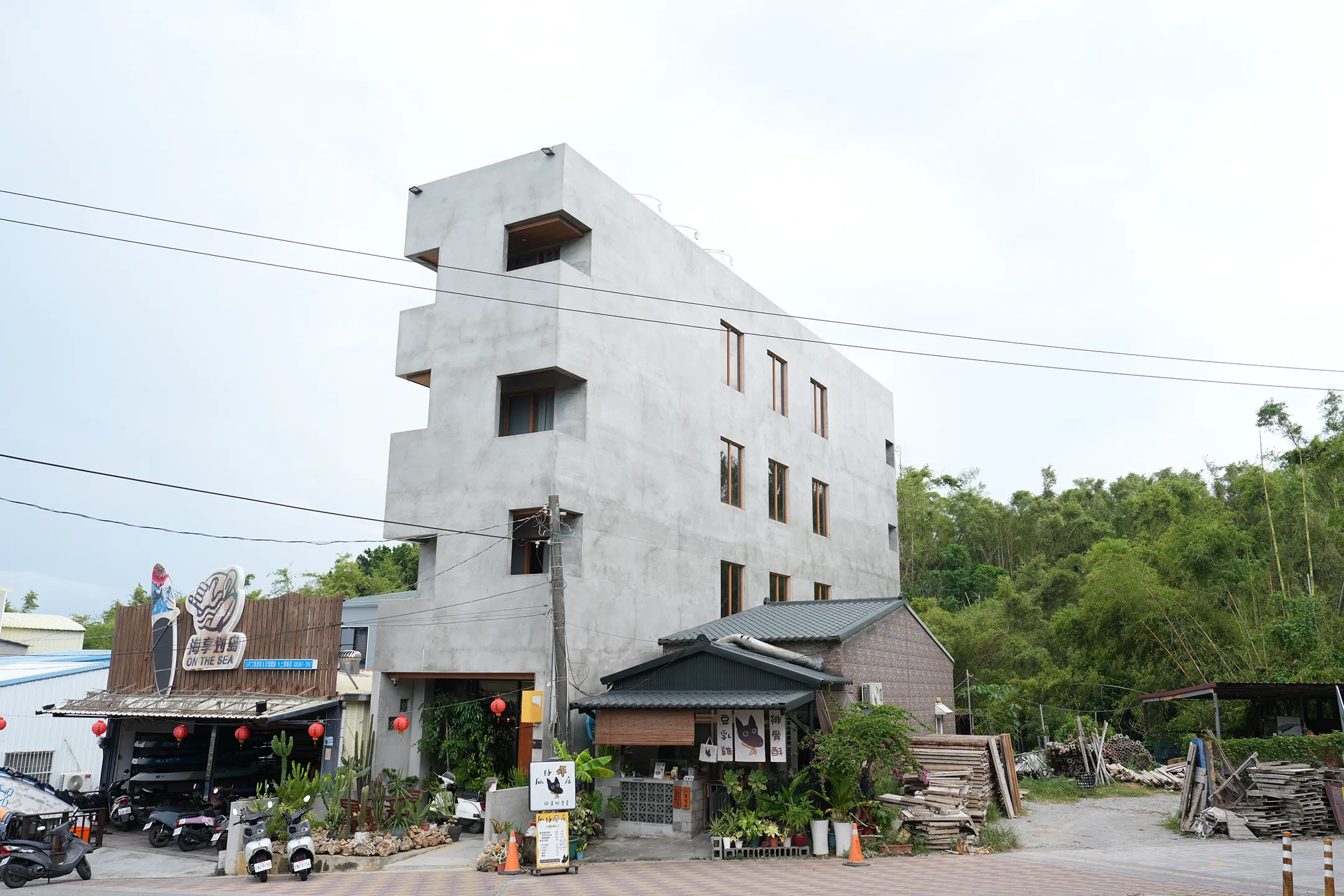 ▼「海邊打盹」整棟建築以清水模風格的灰色外牆為主體,線條俐落方正,在小琉球的街道上顯得相當搶眼,和一般印象中的海島民宿截然不同。