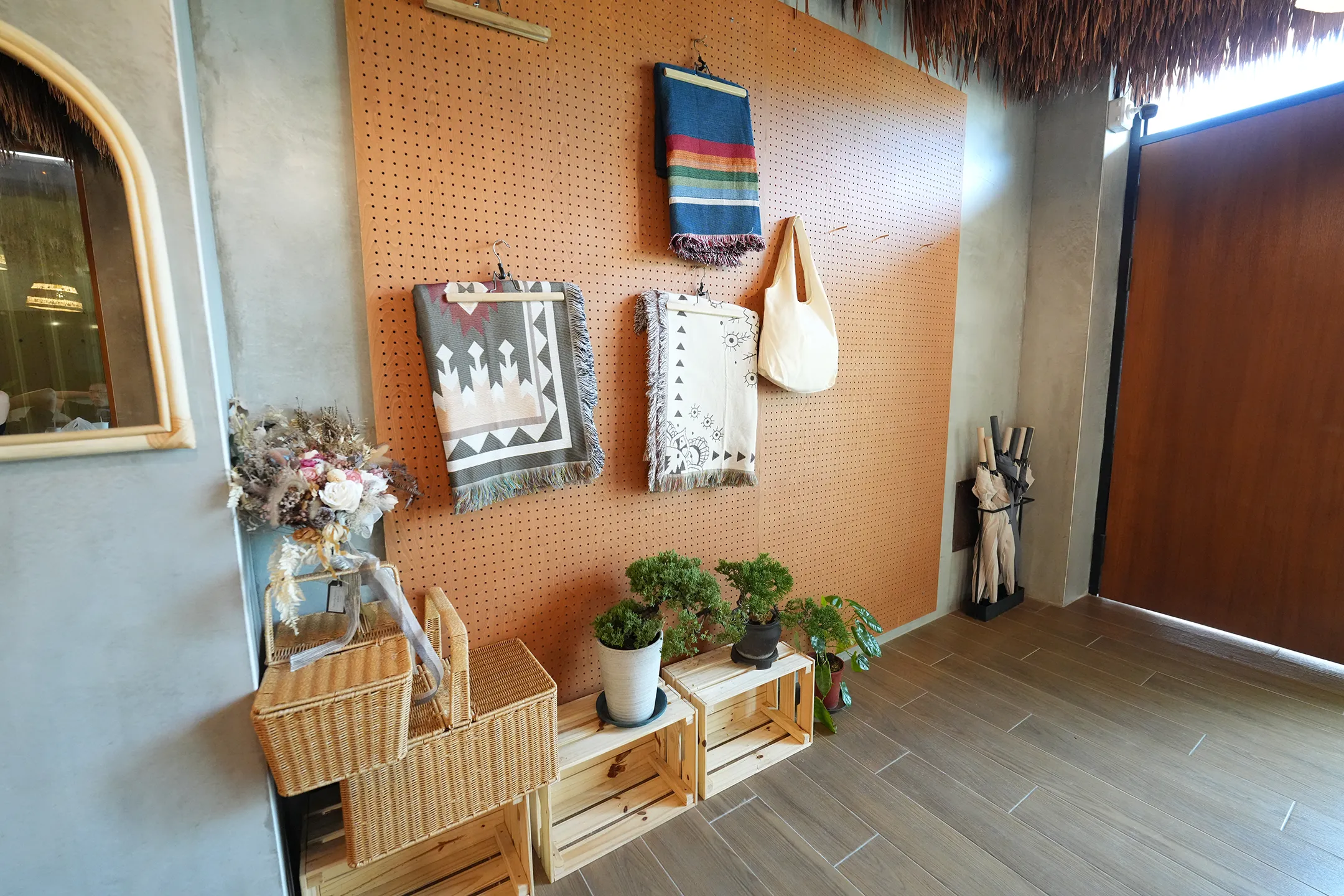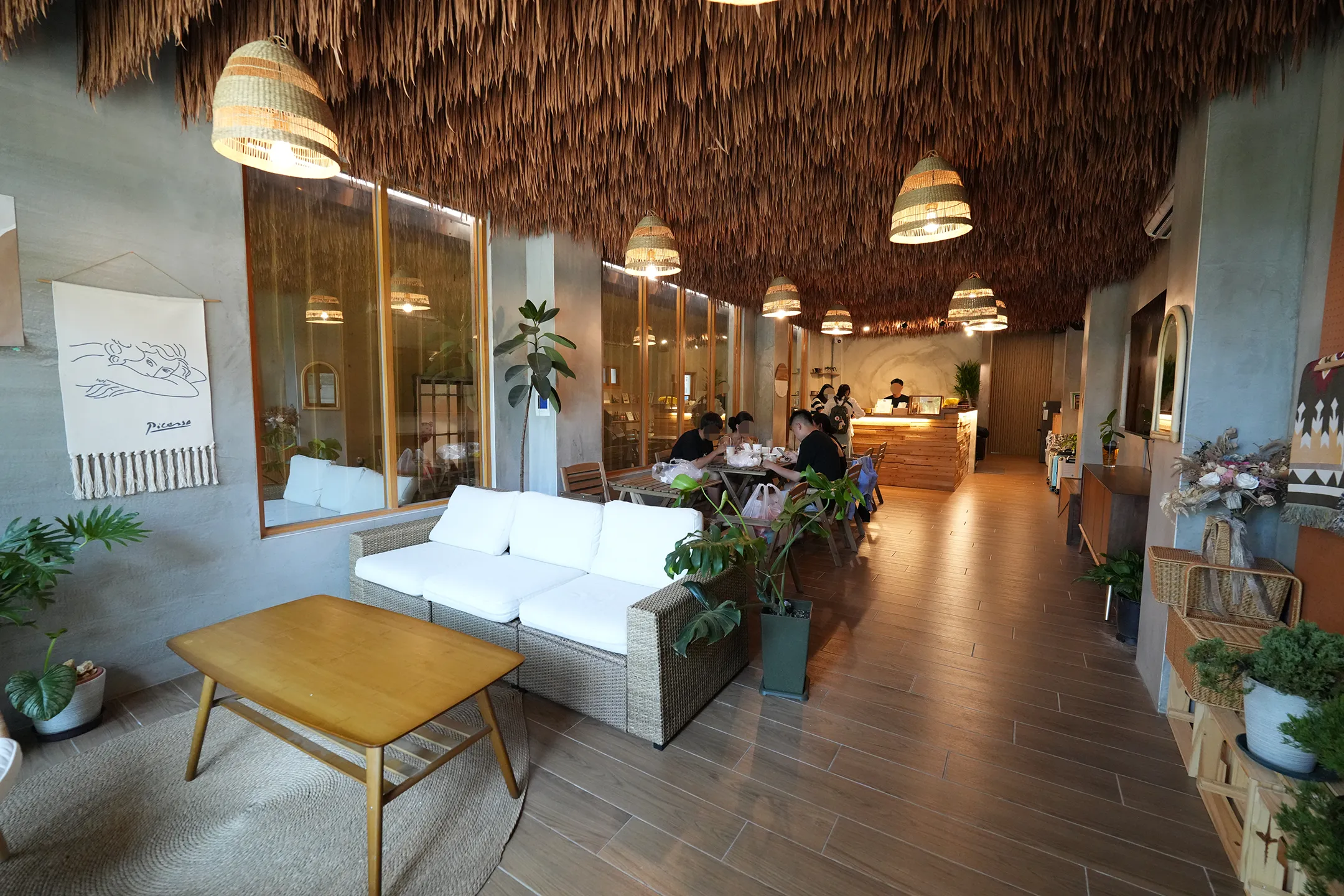 ▼走進大廳的瞬間,最先注意到的一定是天花板,整片乾草編織鋪滿頂部,配上幾盞藤編吊燈垂掛其中,有一種置身東南亞度假村的錯覺,空間整體以灰牆為基底,木紋地板延伸整個大廳。牆上掛著一幅線條畫的布幔,充滿了文藝氣息。大廳9:00~17:00是作為咖啡廳營業,如果這段時間住客要使用大廳,需要低消一杯飲品。