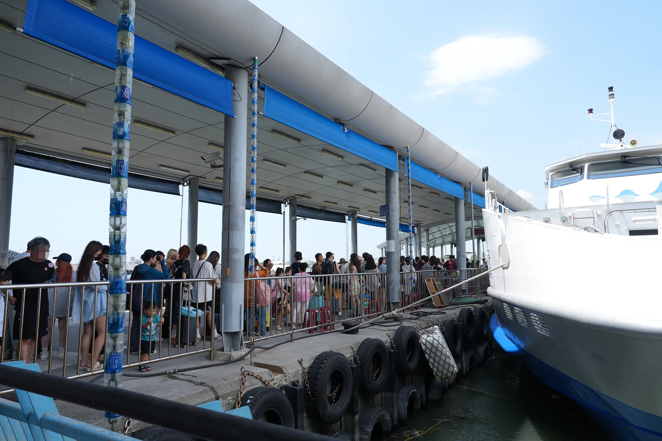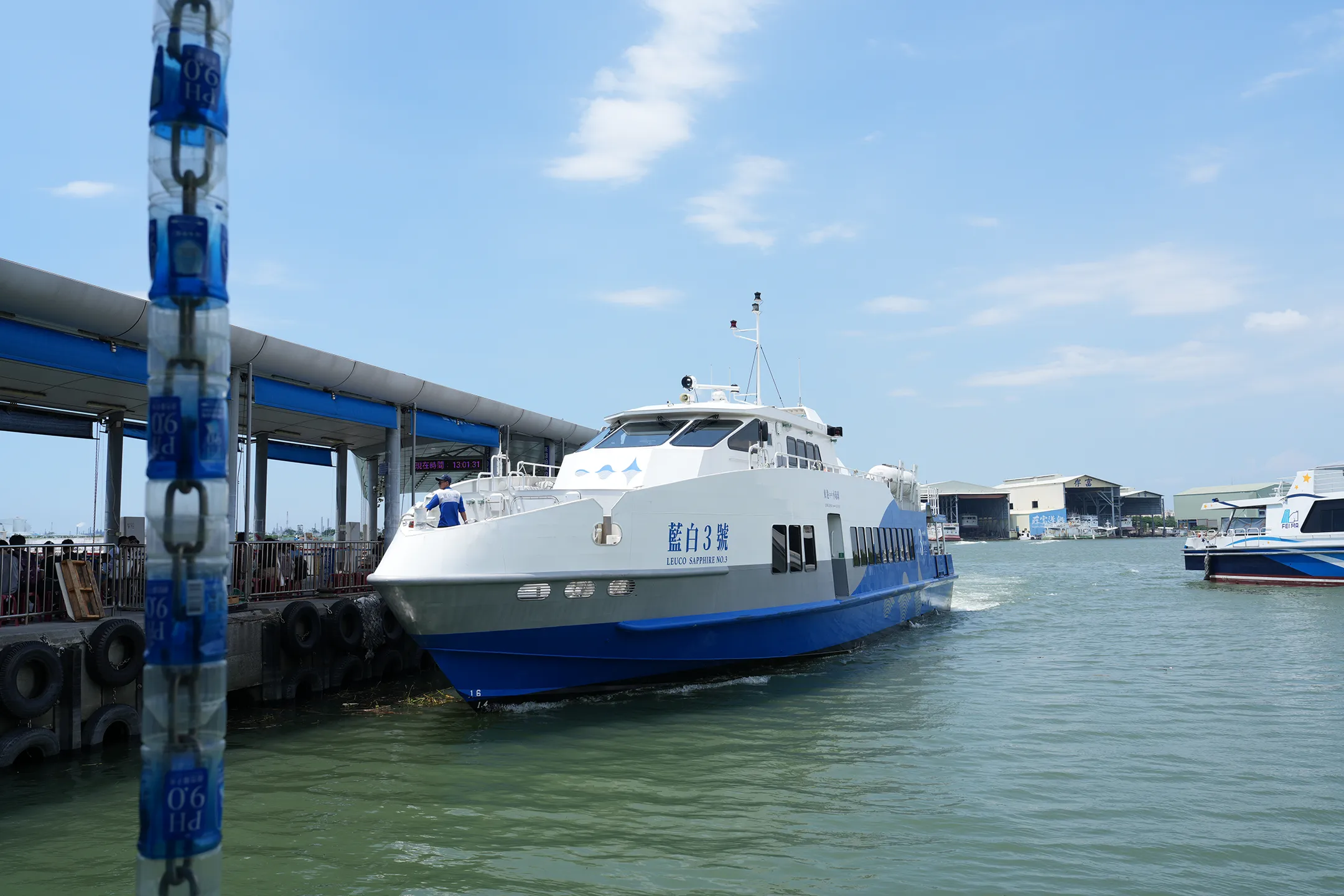 ▼我們搭乘的是「藍白3號」,藍白相間的船身清爽好看,停在碼頭邊就已經很上鏡,還沒出發就先拍了幾張。