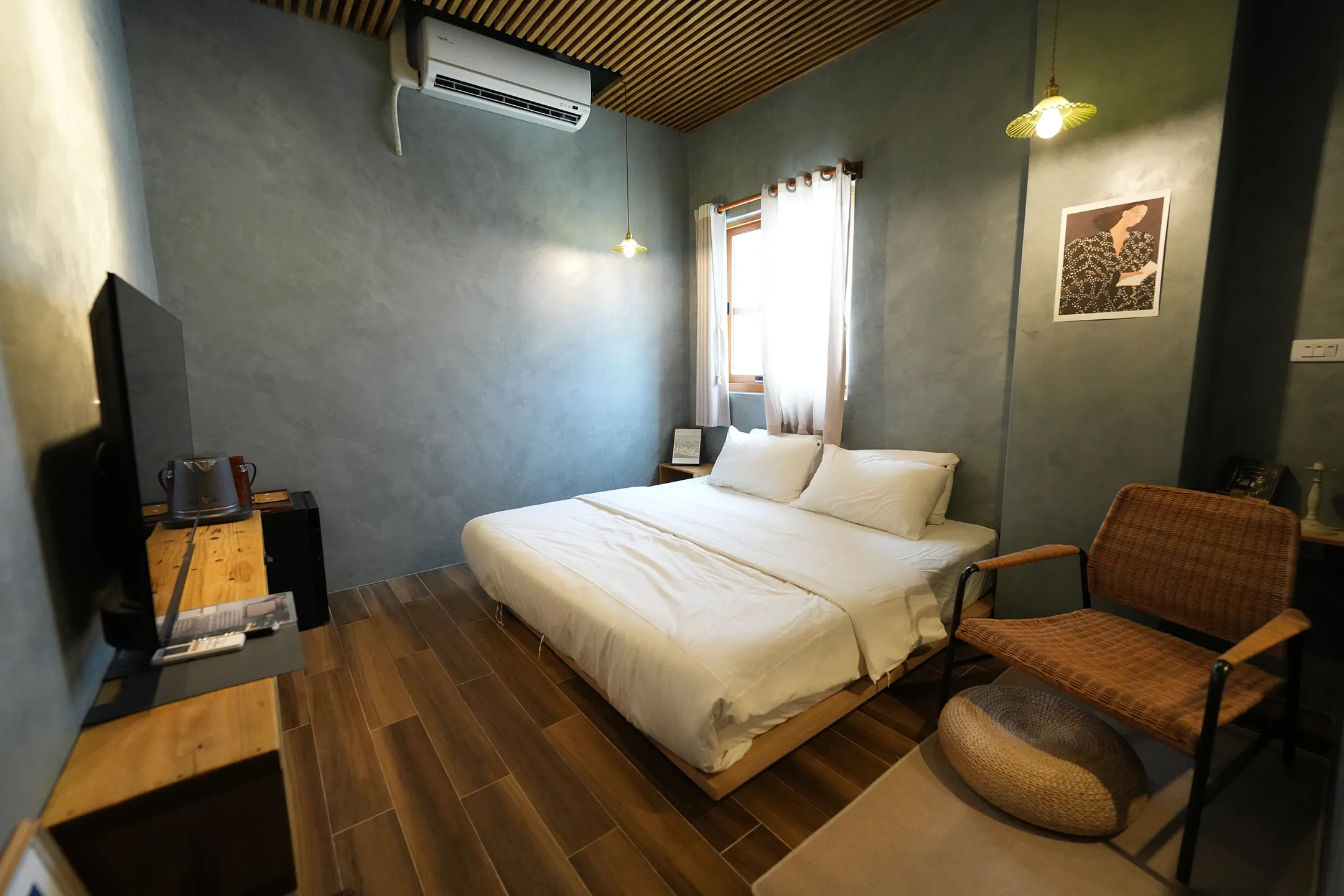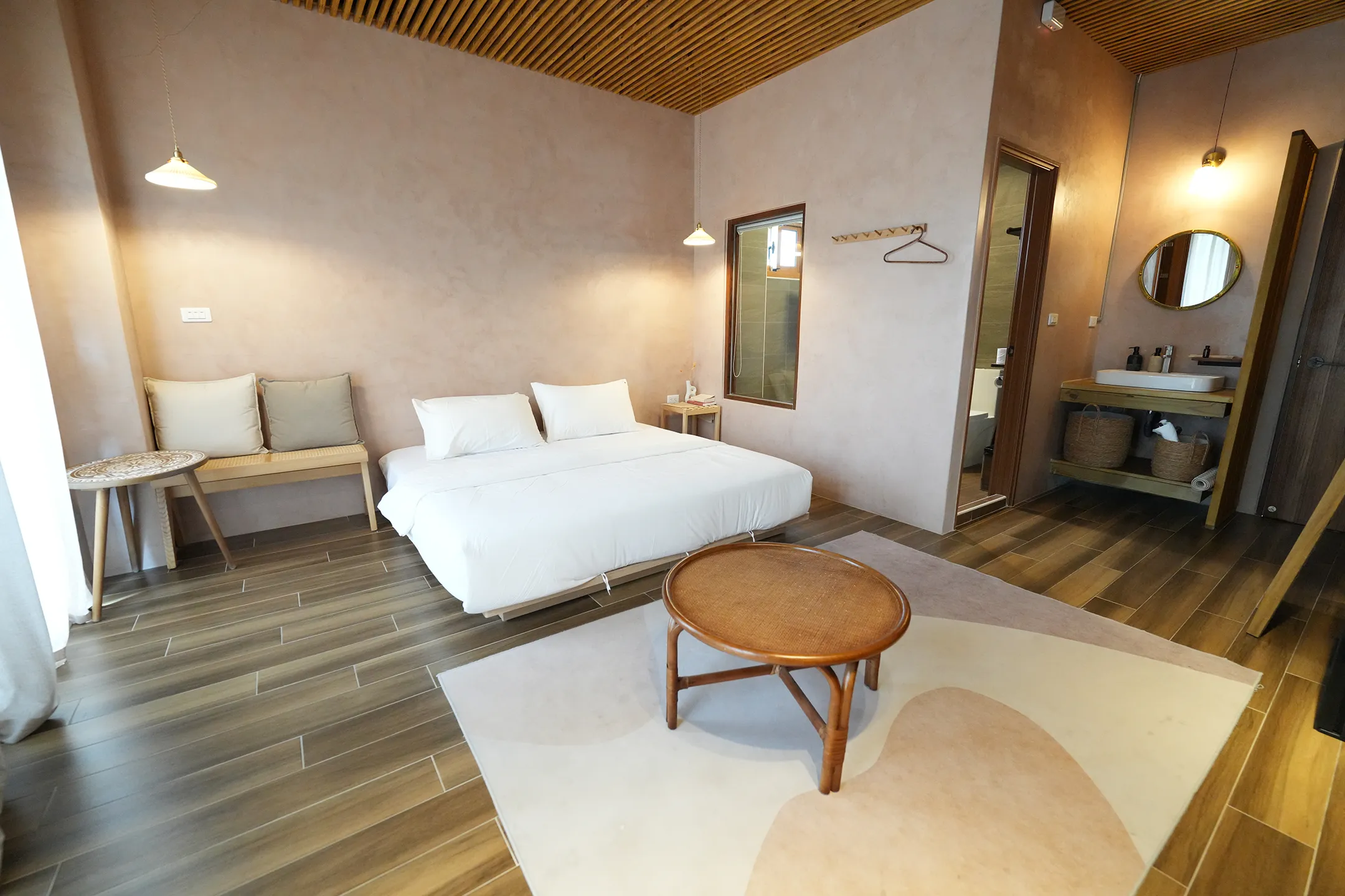 ▼房間整體走奶茶色調,牆面的手刷紋路,搭配木紋地板,非常典雅耐看。天花板做了木條格柵設計,視覺上多了一點層次,也讓空間不顯壓迫。燈光偏暖黃,兩盞垂吊的玻璃燈罩剛好打在床的兩側,氛圍剛好。床鋪乾淨清爽,前方一張圓形藤木茶几,踩在幾何圖案地毯上,小而剛好。