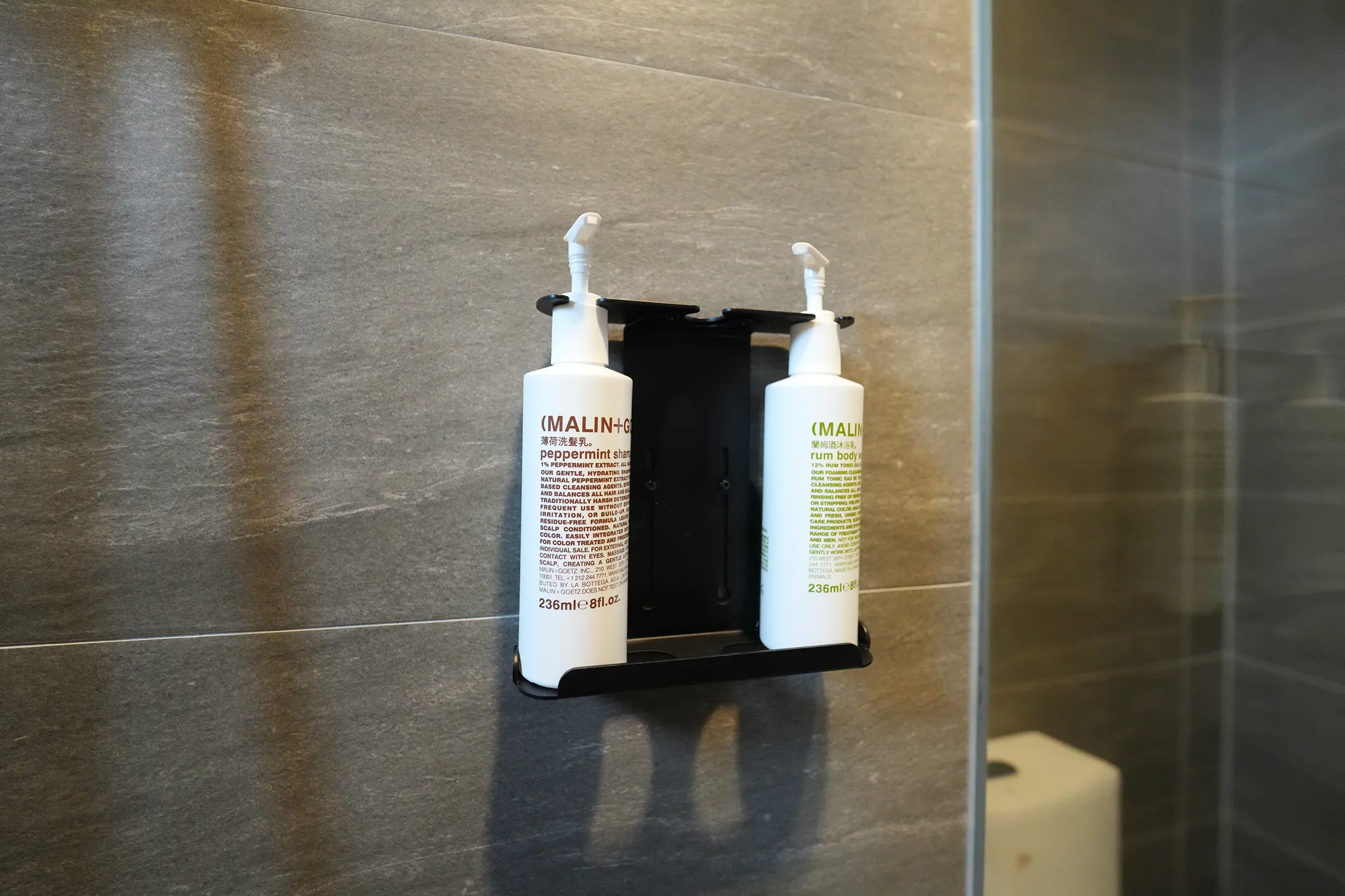 ▼淋浴間牆上掛有沐浴乳以及洗髮精。