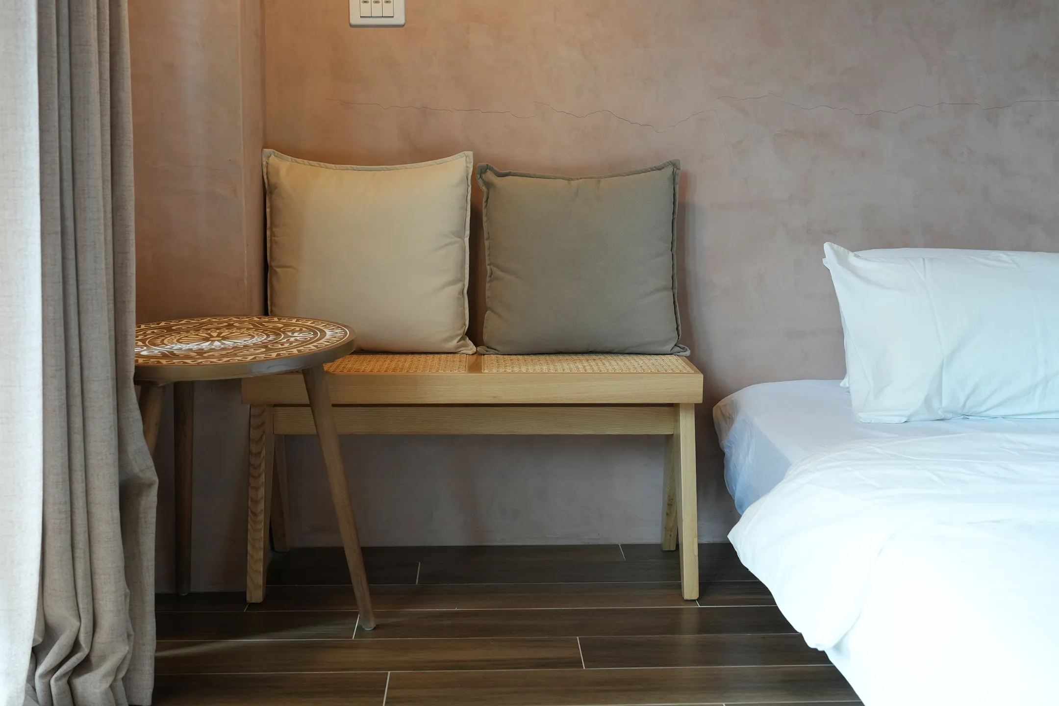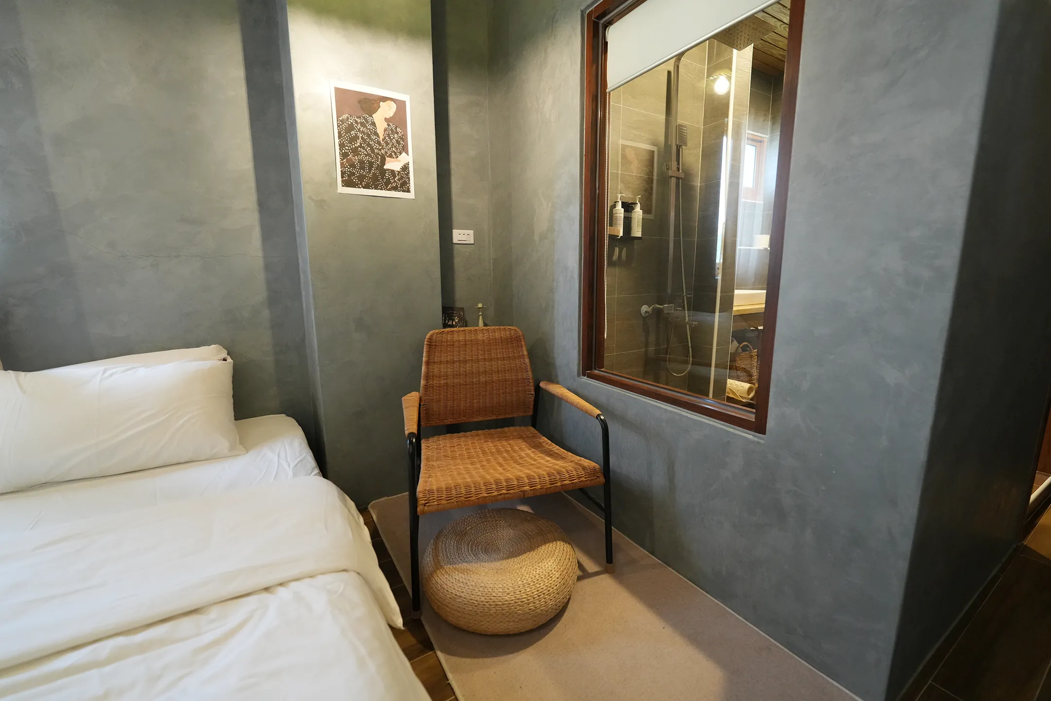 ▼床邊換成了一張藤編單椅,搭配圓形藤編腳凳,相比「灰櫻」多了一點粗獷感。牆上掛著一幅人物插畫,為空間增添了些許藝術氣息。