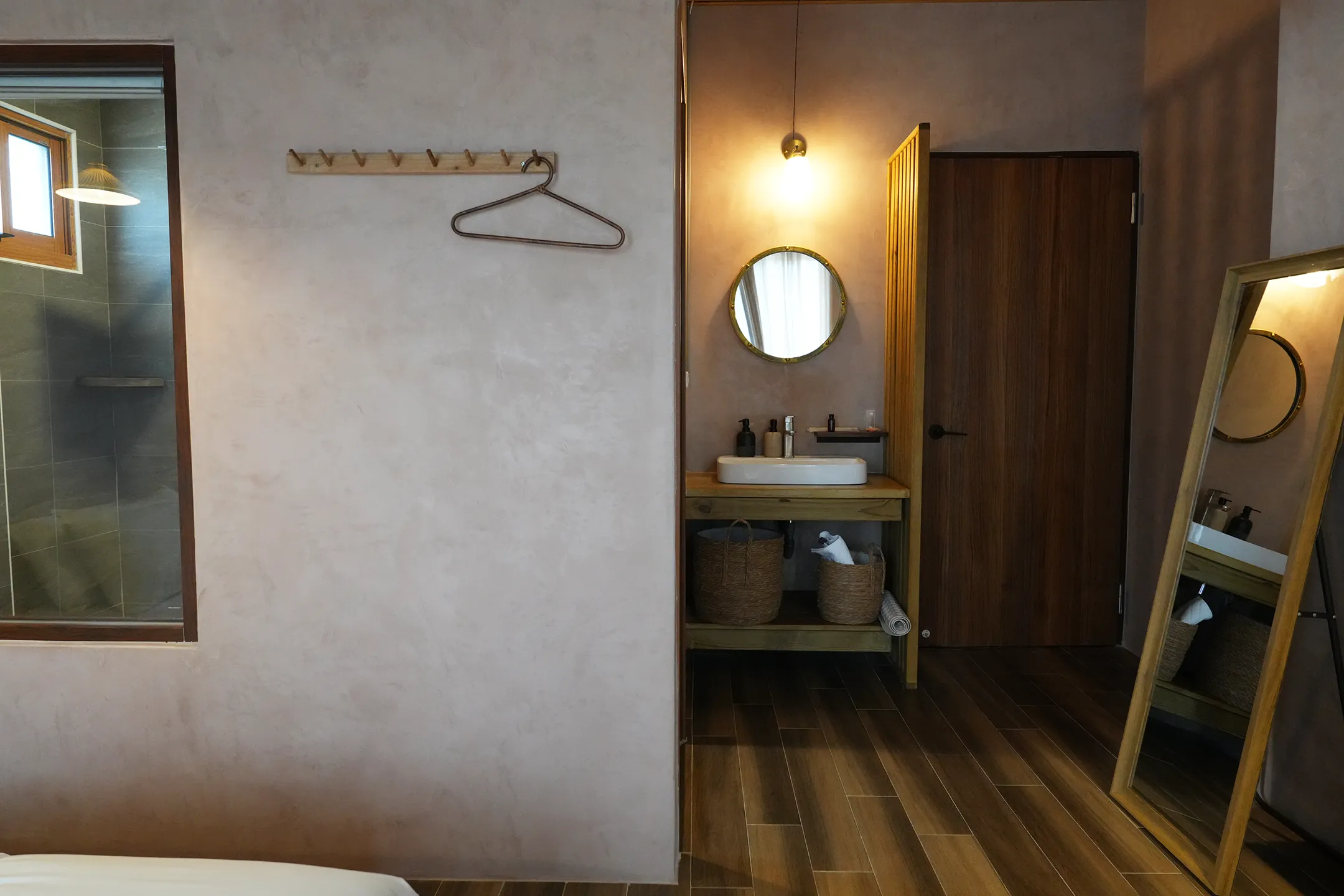 ▼房間內備有衣架與全身鏡,比較特別的是洗手台區域,圓形鏡、白色方形洗手台,備品整齊排列,每個家具都很有質感,不過因為採開放式設計,洗手台與房間空間直接相連,用水時得稍微留意,隨手擦乾保持地板乾燥,不然水漬很快就會淹到地板上。